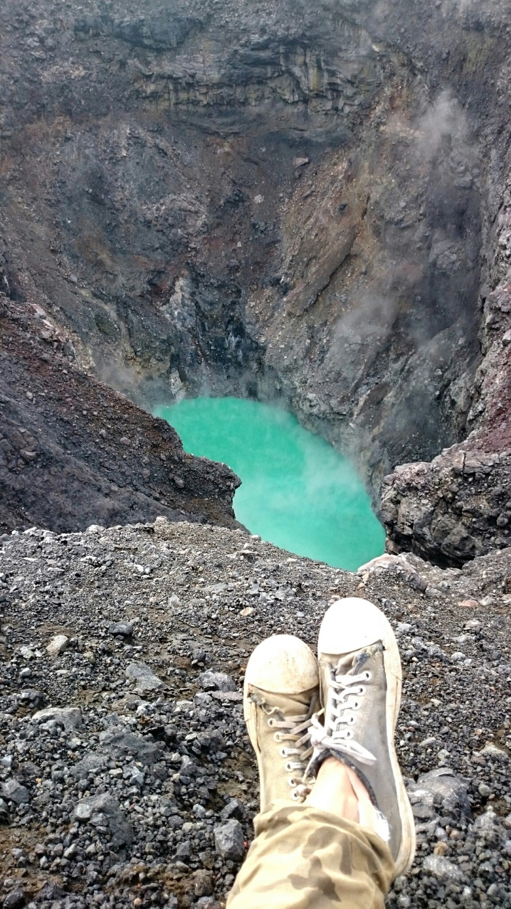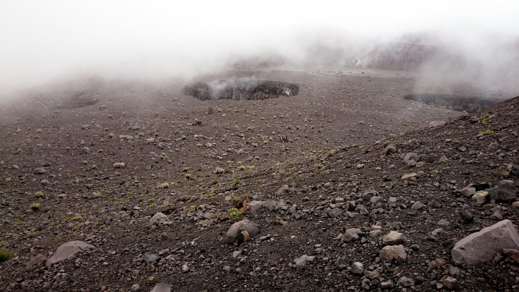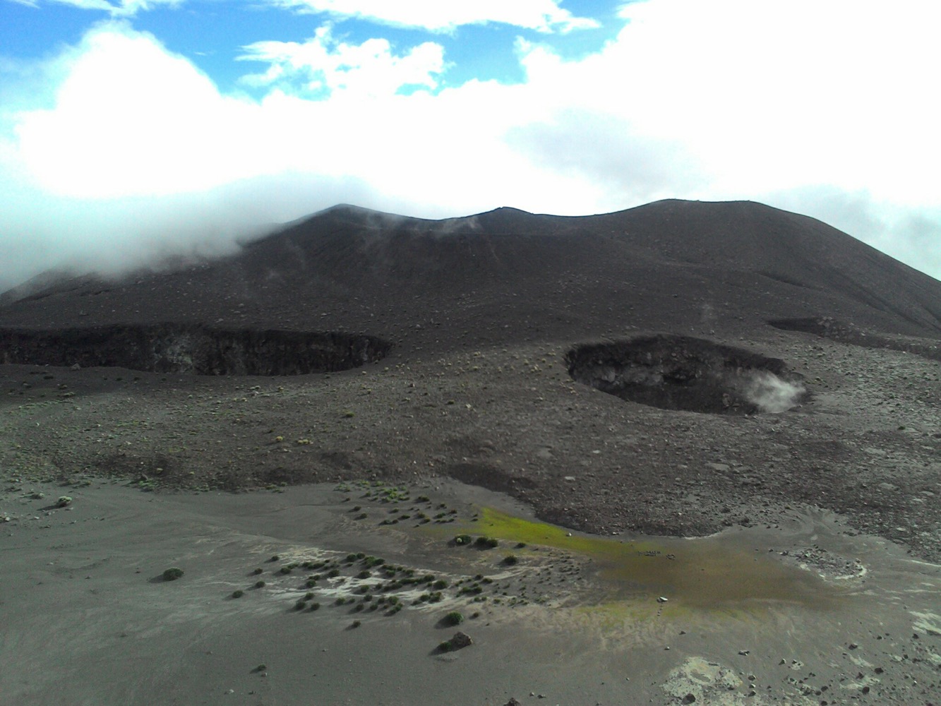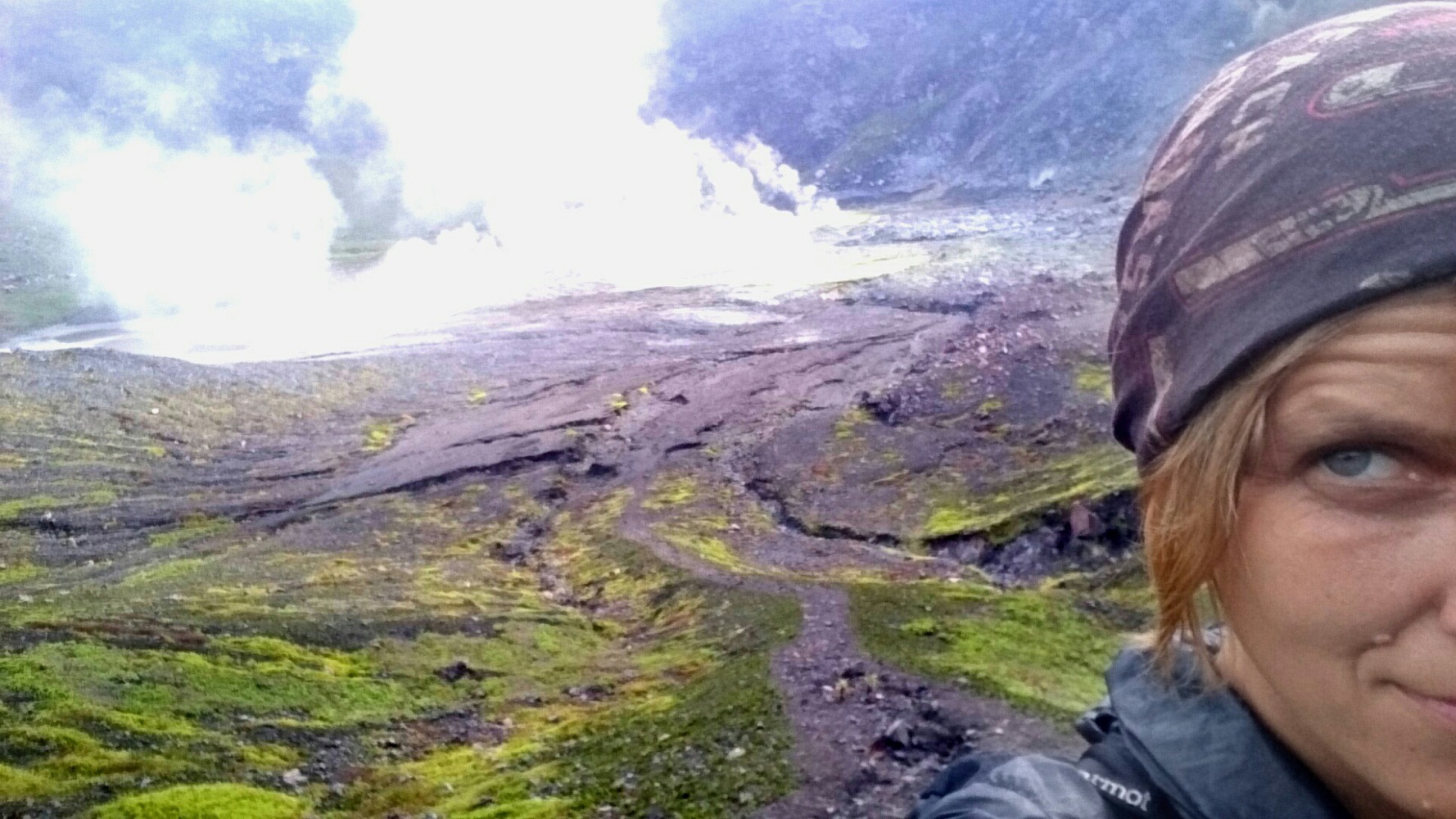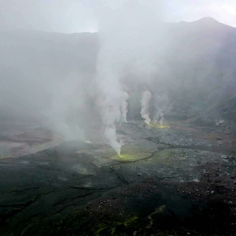 Когда дошли до дальнего кратера все вокруг погрузилось толи в туман, толи в облако, толи и в то и другое. В общем не видно нефига, воняет сероводородом, высота 2700 с соответствующей температурой, и вечерние сумерки... Ах да, конечно же мы не записались на чек-посту, чтобы не платить дань 😊