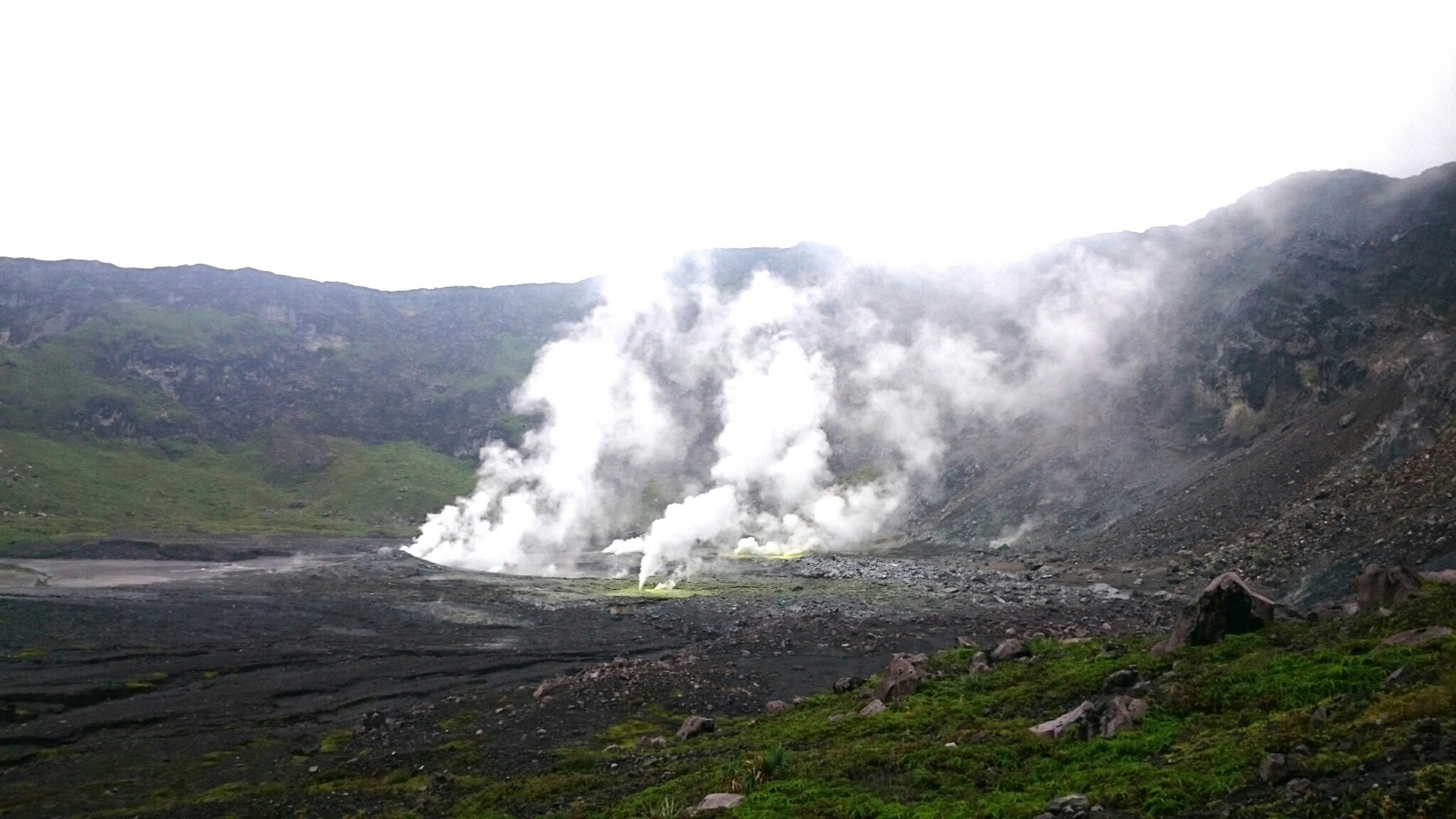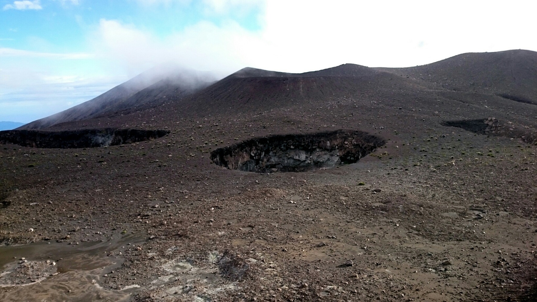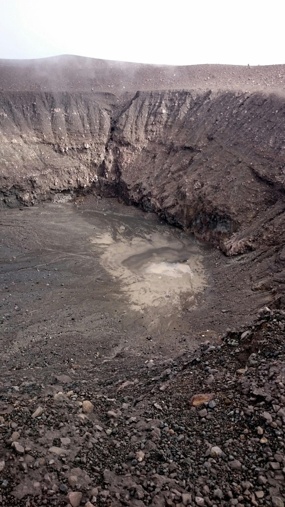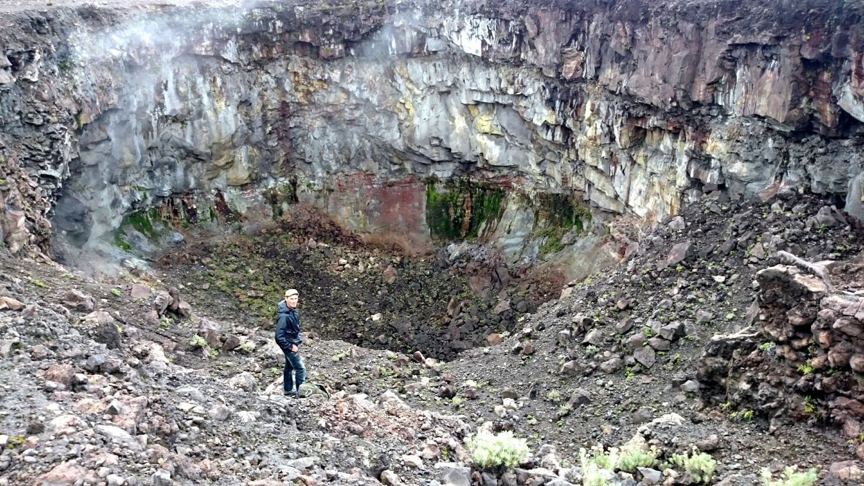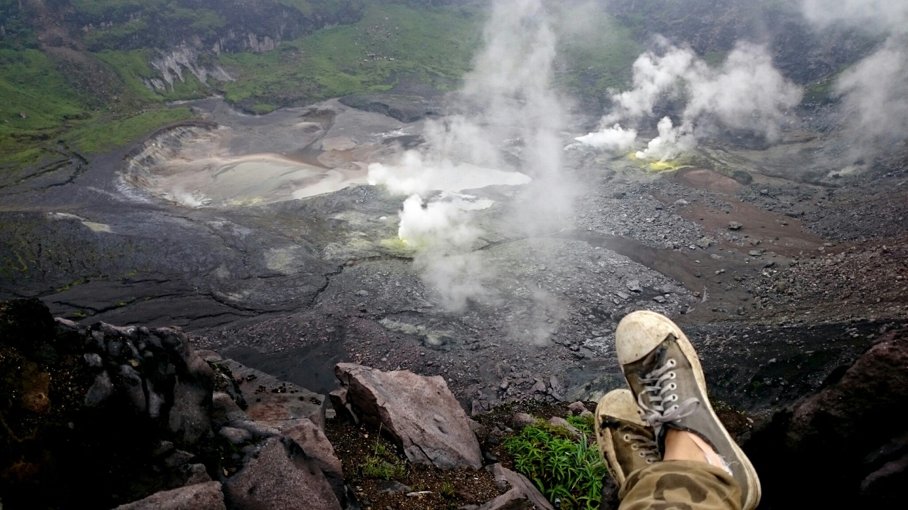 Когда дошли до дальнего кратера все вокруг погрузилось толи в туман, толи в облако, толи и в то и другое. В общем не видно нефига, воняет сероводородом, высота 2700 с соответствующей температурой, и вечерние сумерки... Ах да, конечно же мы не записались на чек-посту, чтобы не платить дань 😊