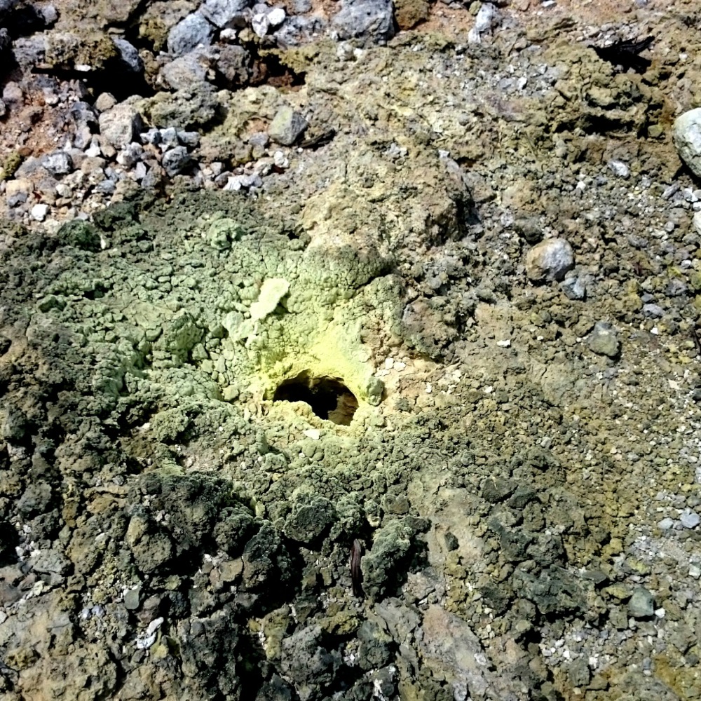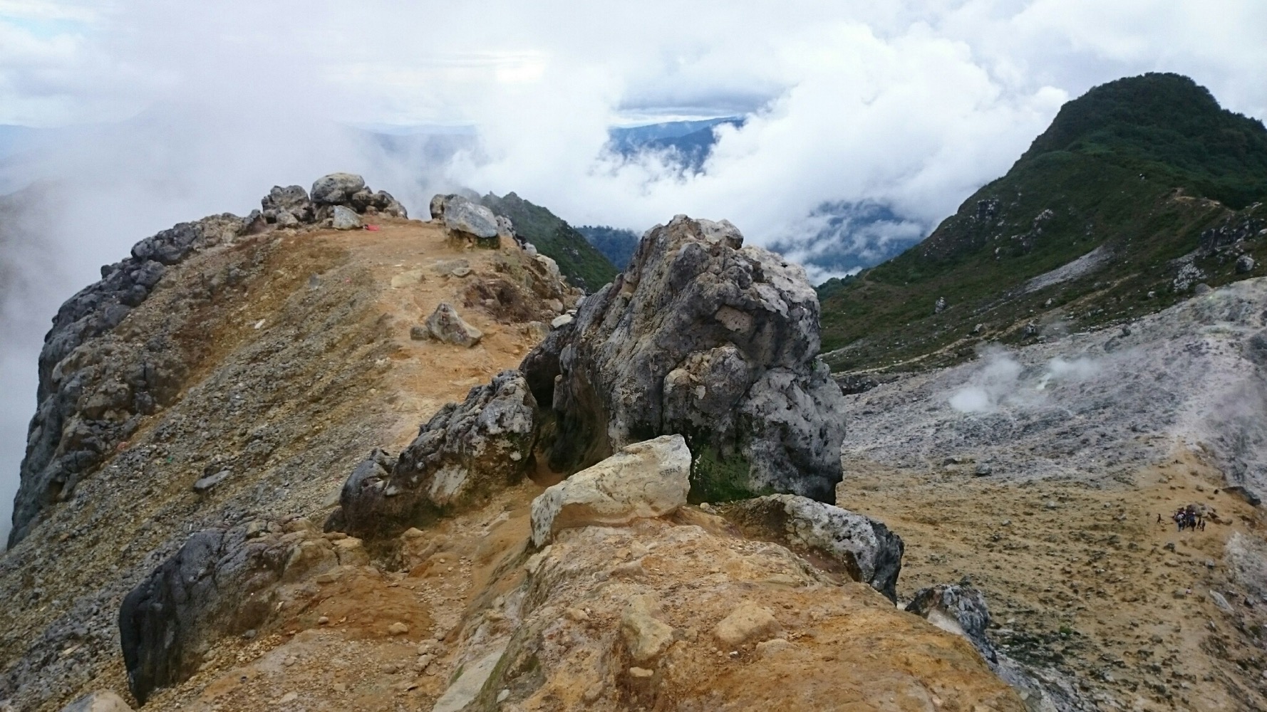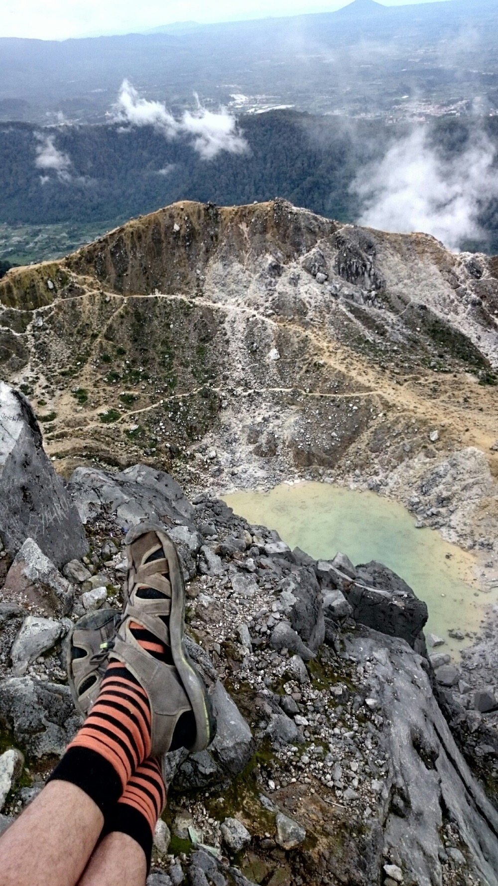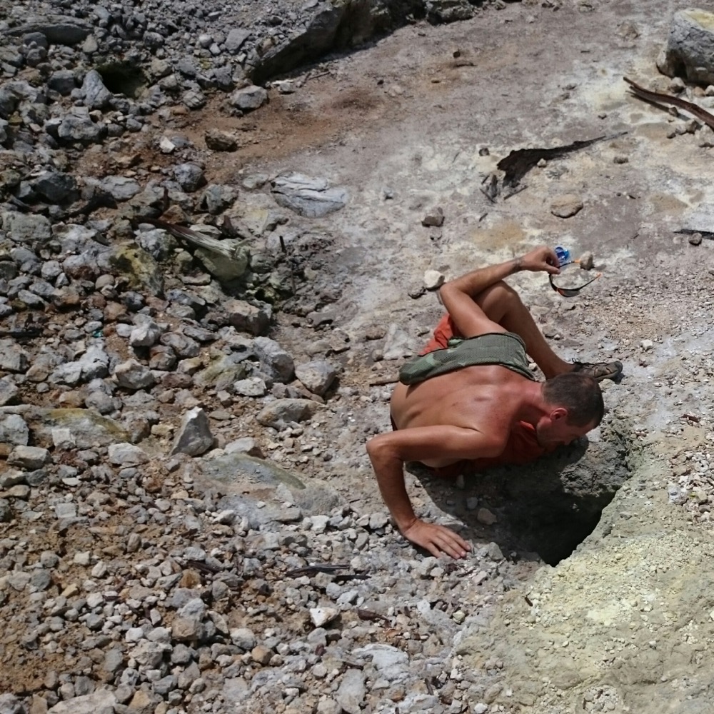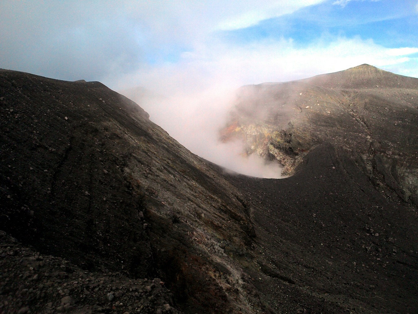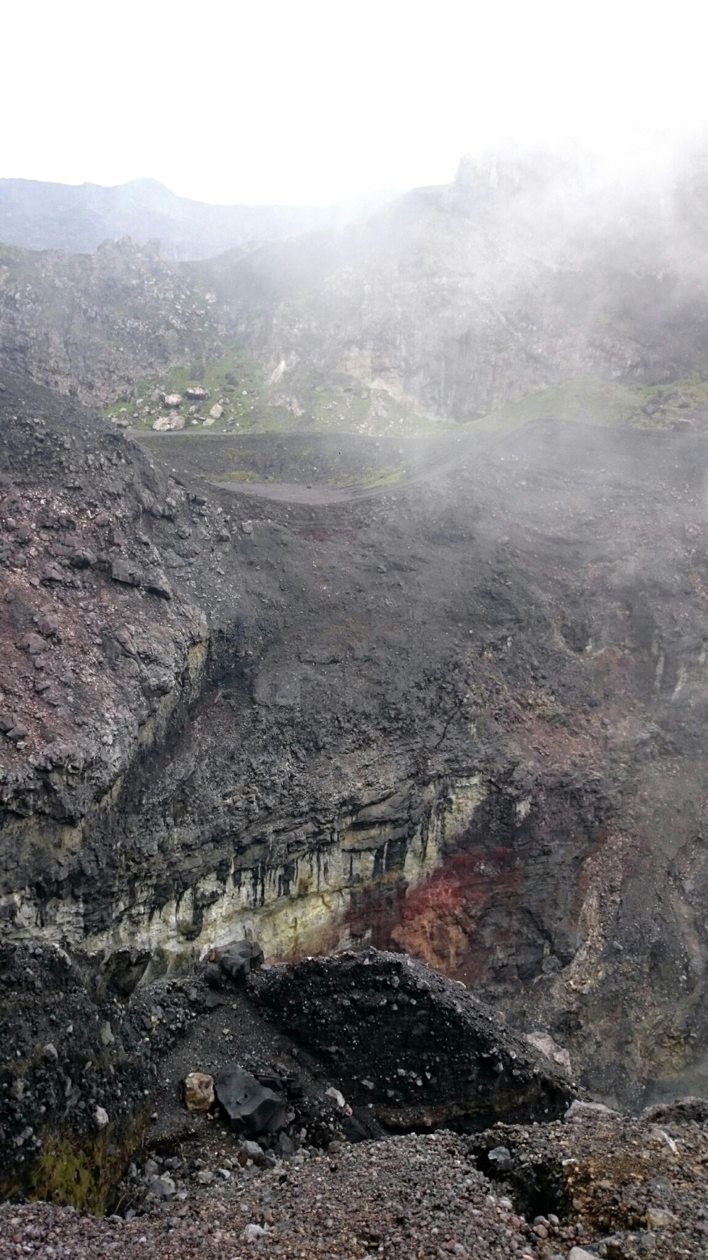 Когда дошли до дальнего кратера все вокруг погрузилось толи в туман, толи в облако, толи и в то и другое. В общем не видно нефига, воняет сероводородом, высота 2700 с соответствующей температурой, и вечерние сумерки... Ах да, конечно же мы не записались на чек-посту, чтобы не платить дань 😊