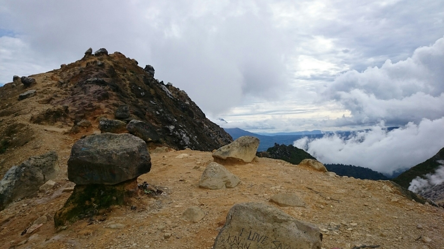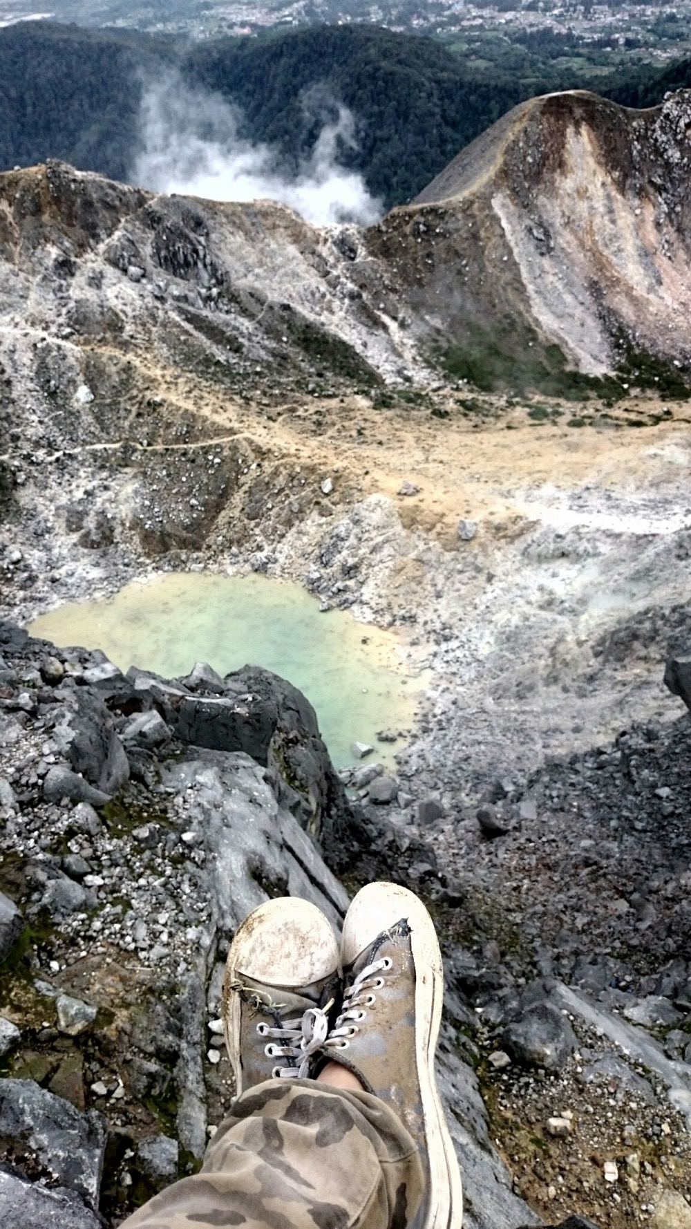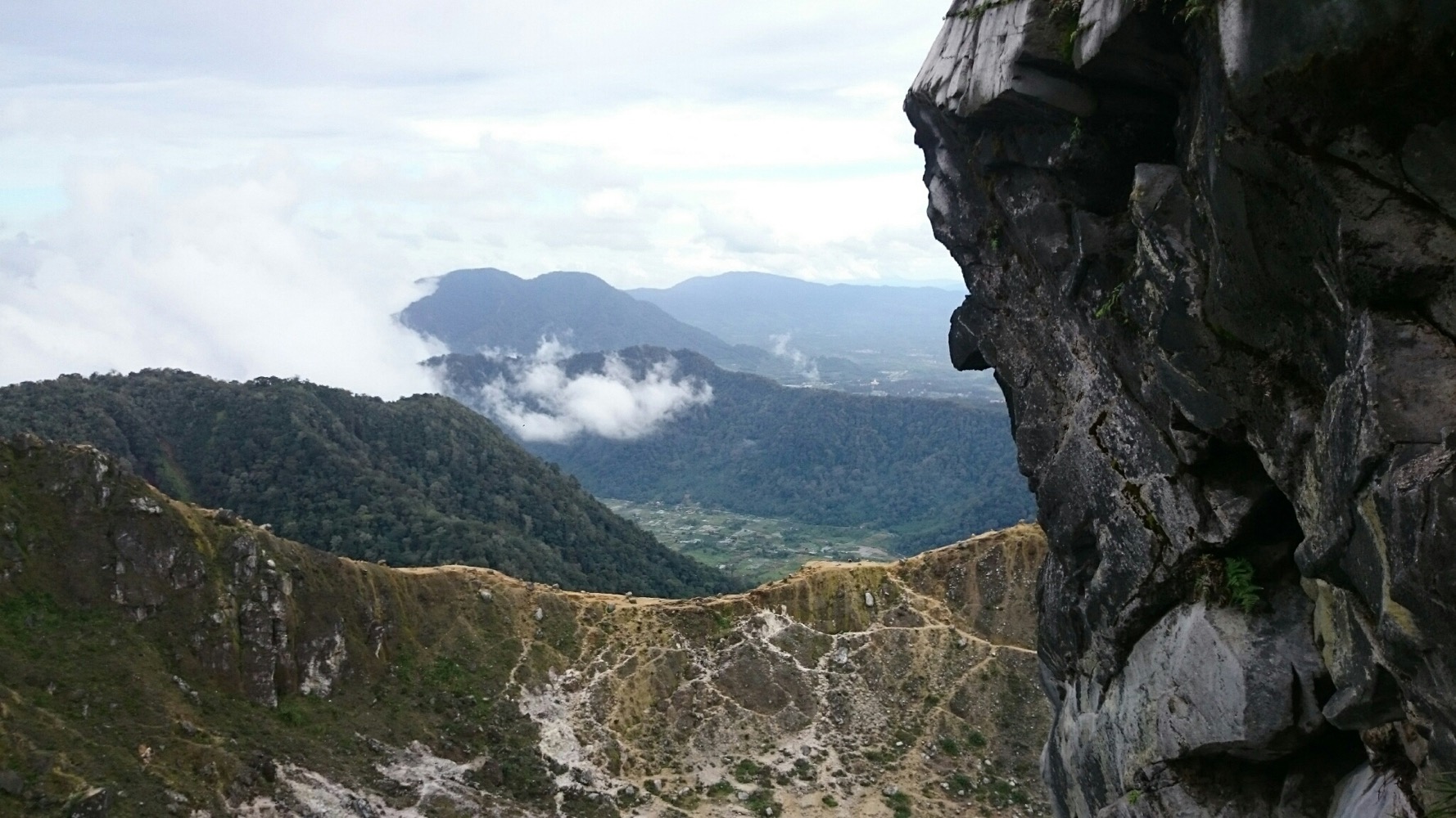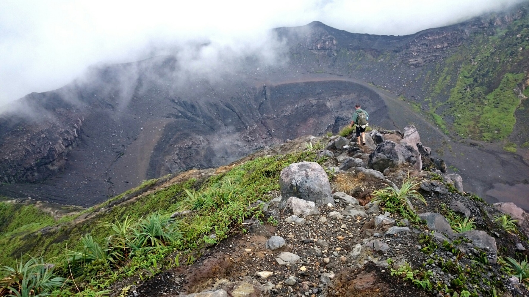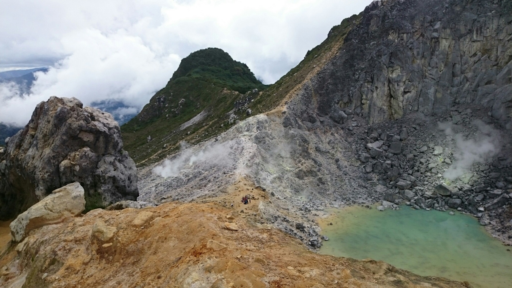 Когда дошли до дальнего кратера все вокруг погрузилось толи в туман, толи в облако, толи и в то и другое. В общем не видно нефига, воняет сероводородом, высота 2700 с соответствующей температурой, и вечерние сумерки... Ах да, конечно же мы не записались на чек-посту, чтобы не платить дань 😊
