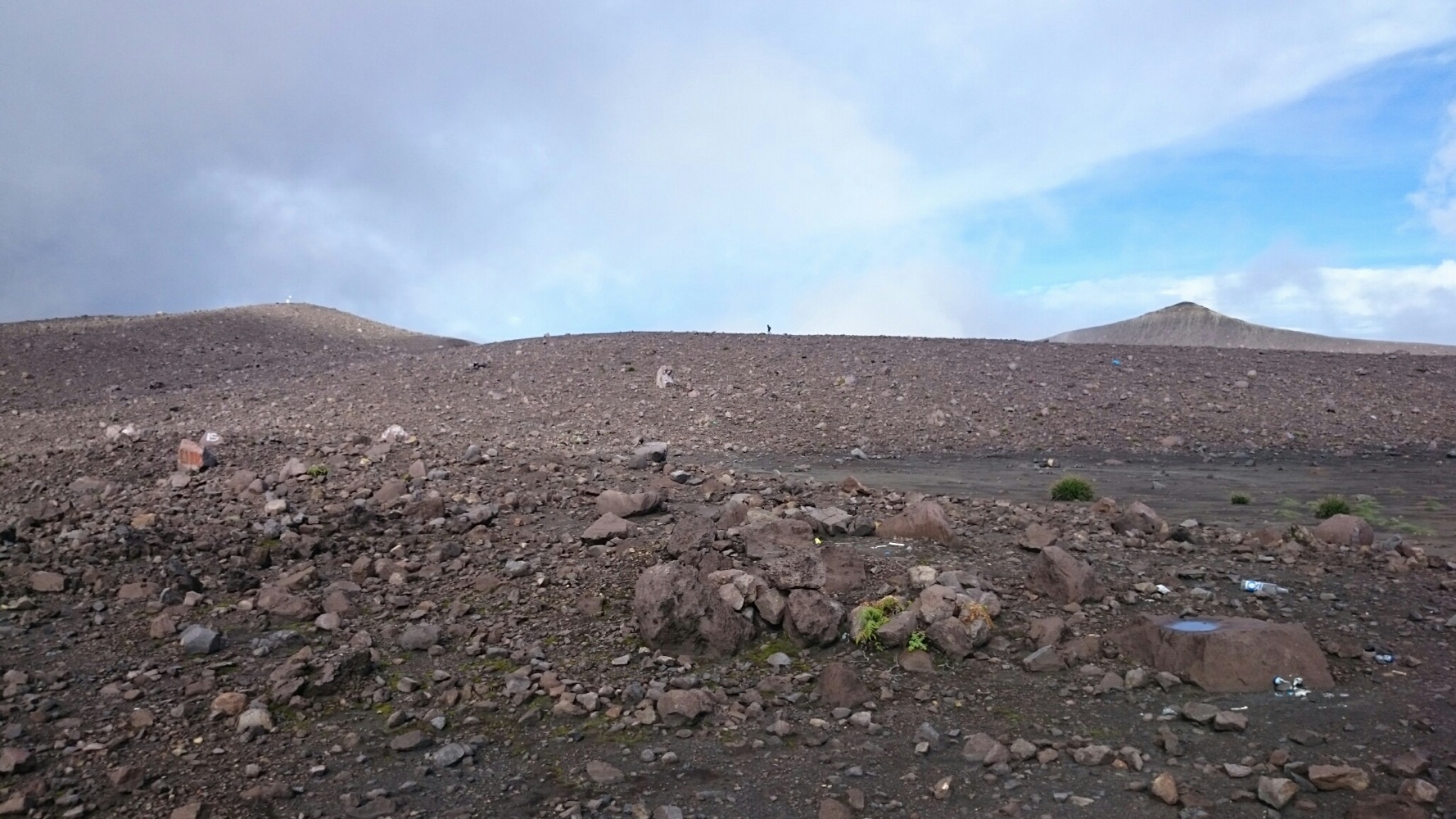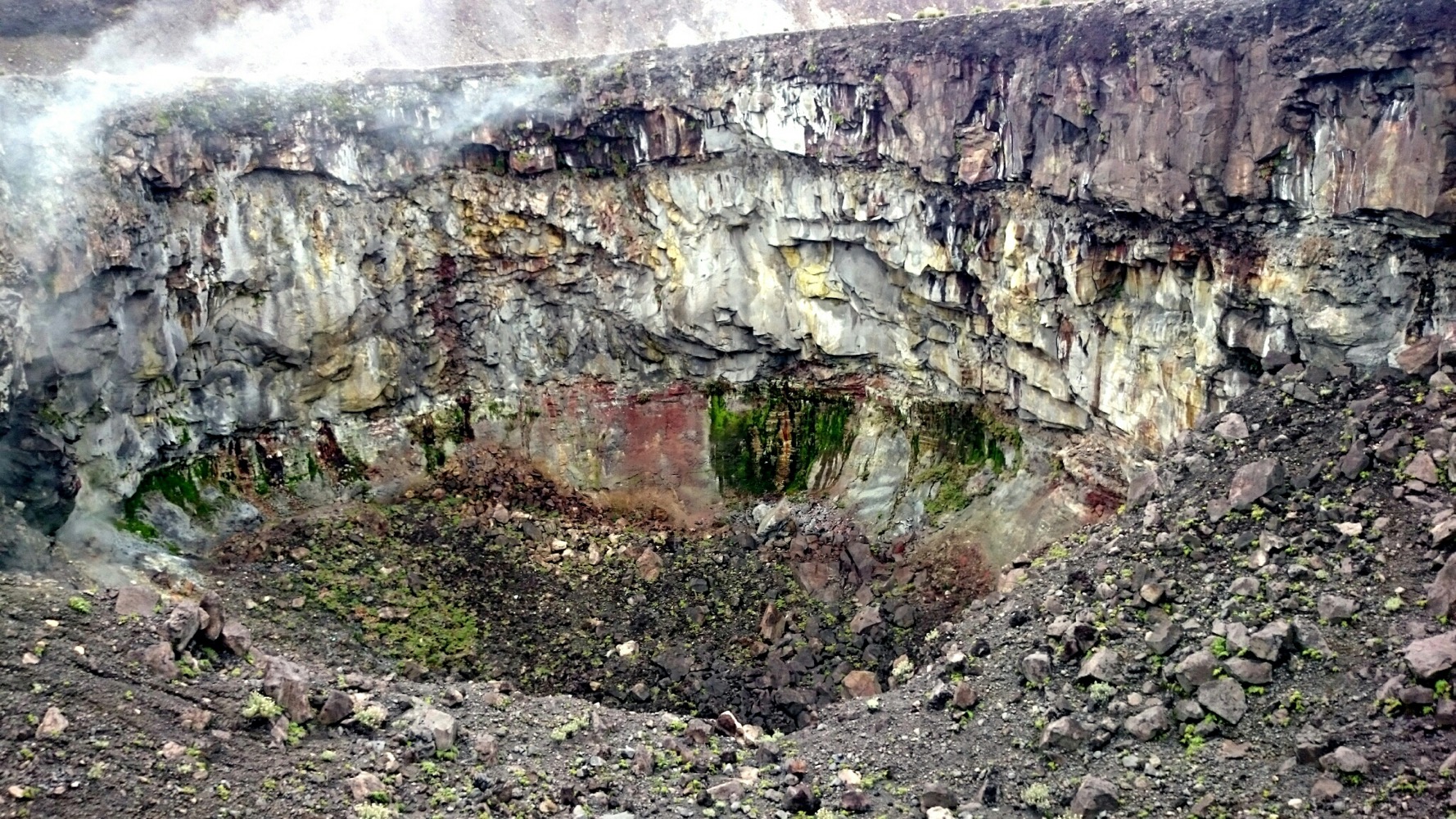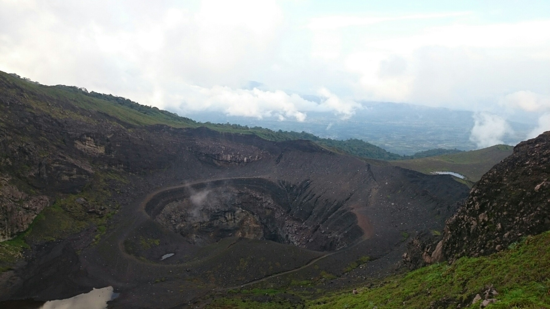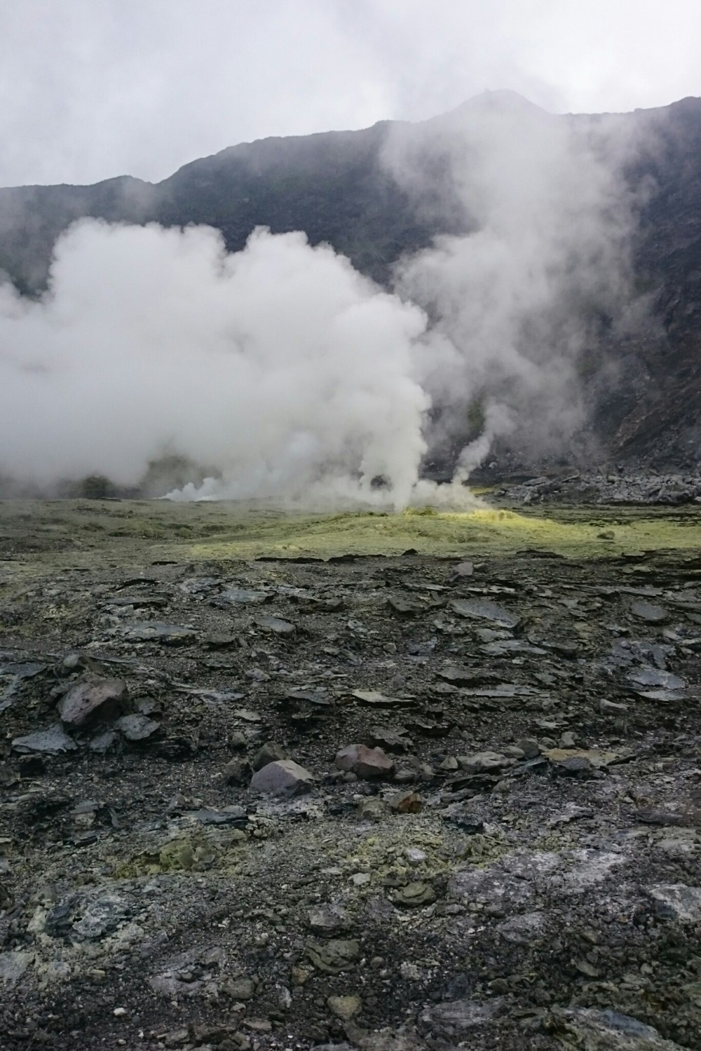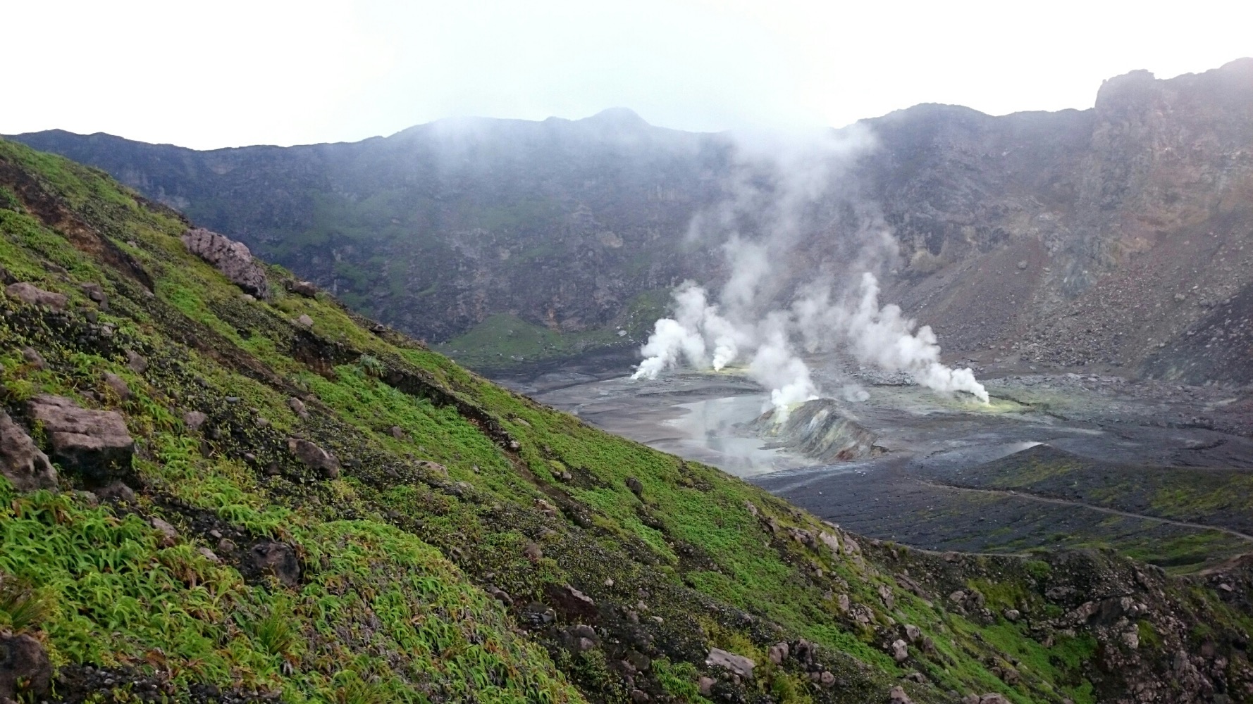 Когда дошли до дальнего кратера все вокруг погрузилось толи в туман, толи в облако, толи и в то и другое. В общем не видно нефига, воняет сероводородом, высота 2700 с соответствующей температурой, и вечерние сумерки... Ах да, конечно же мы не записались на чек-посту, чтобы не платить дань 😊