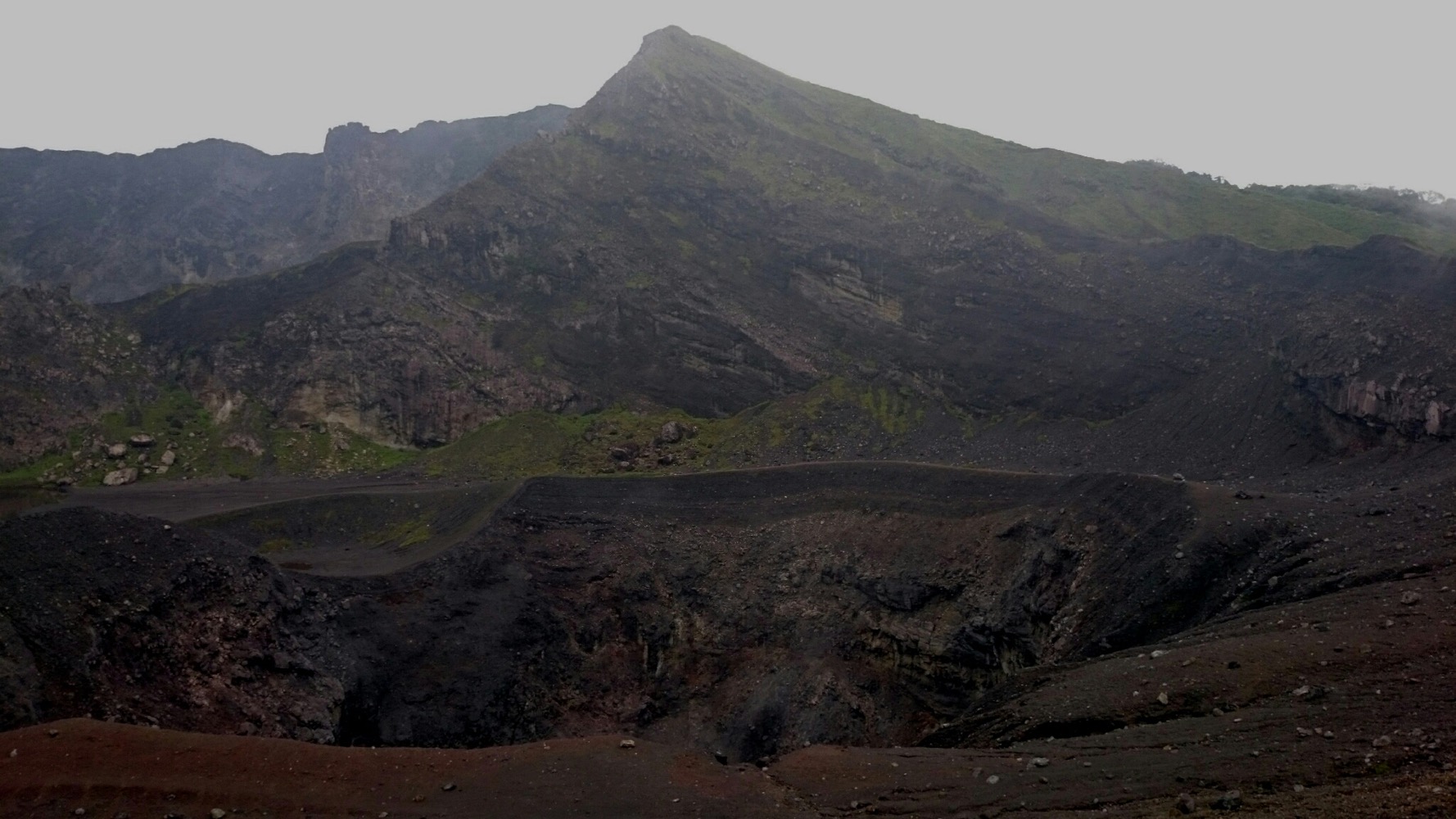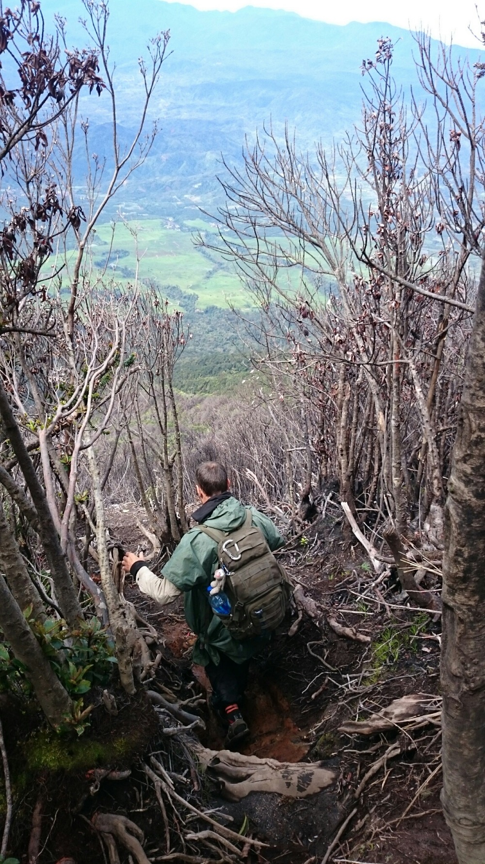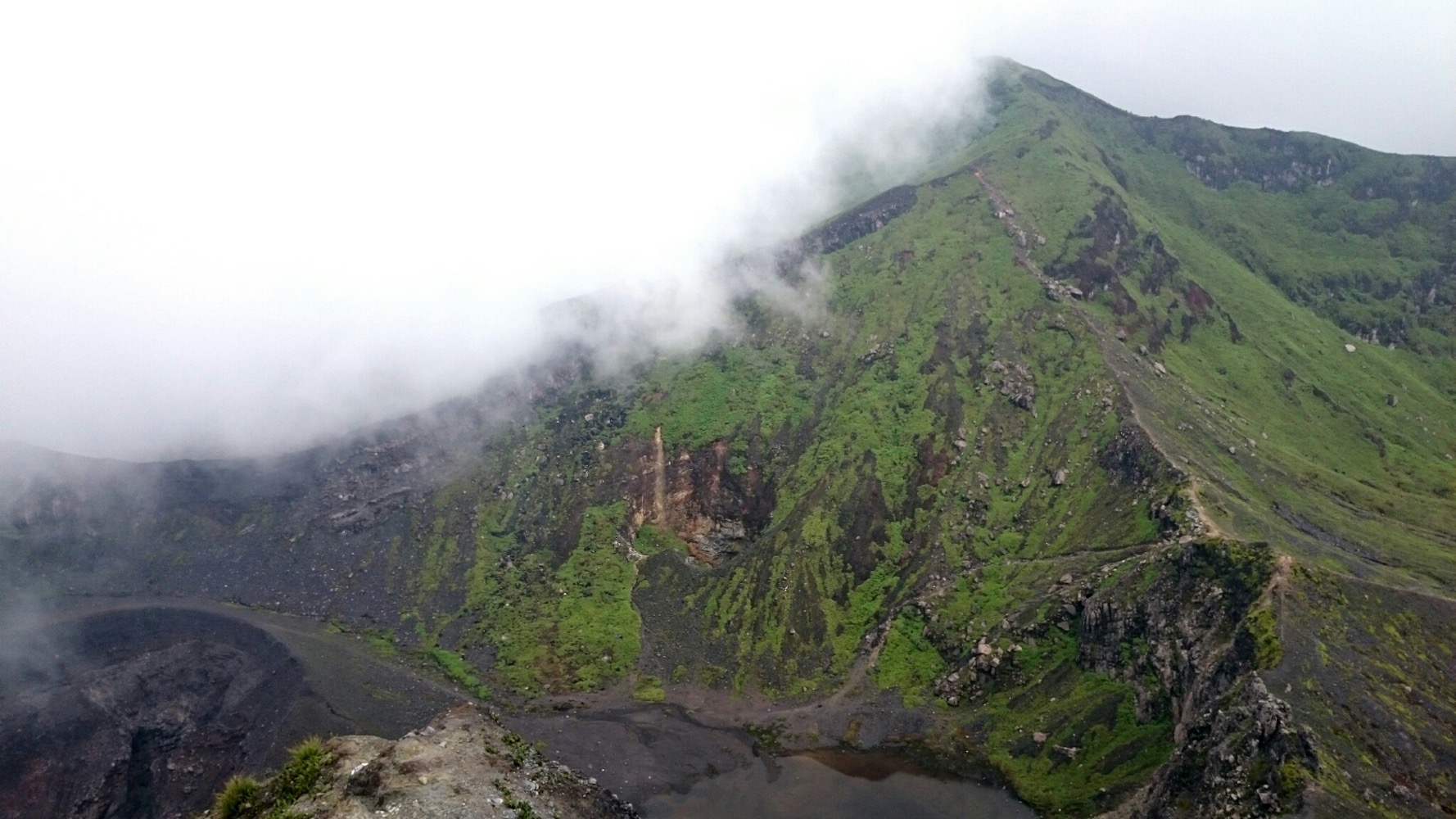 Наверху - дождь, ветер и какой-то адовый лес: чёрные стволы без единого листочка. Переночевали там, с утра пошли до кратера. Озеро в облаках, а с самого кратера дует такой ветрище, при котором, на моей малой Родине, в Североморске у старшеклассников занятия в школе отменяли.
