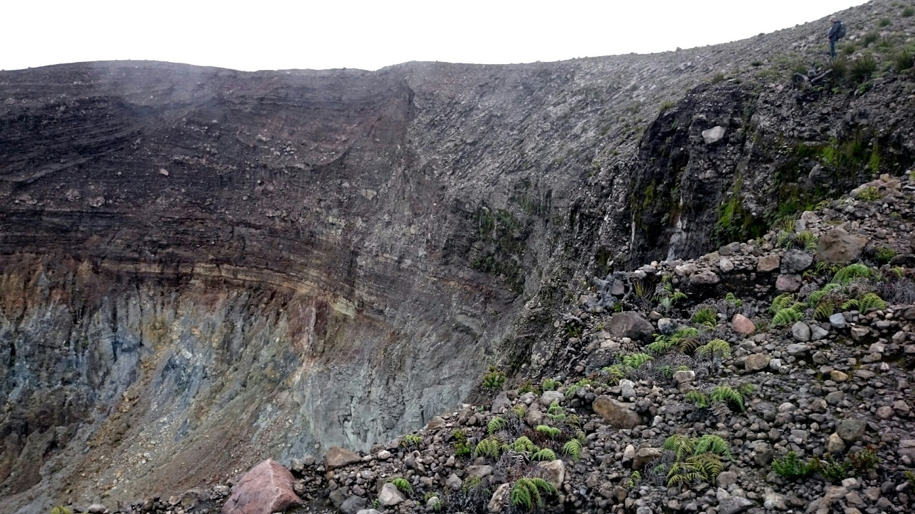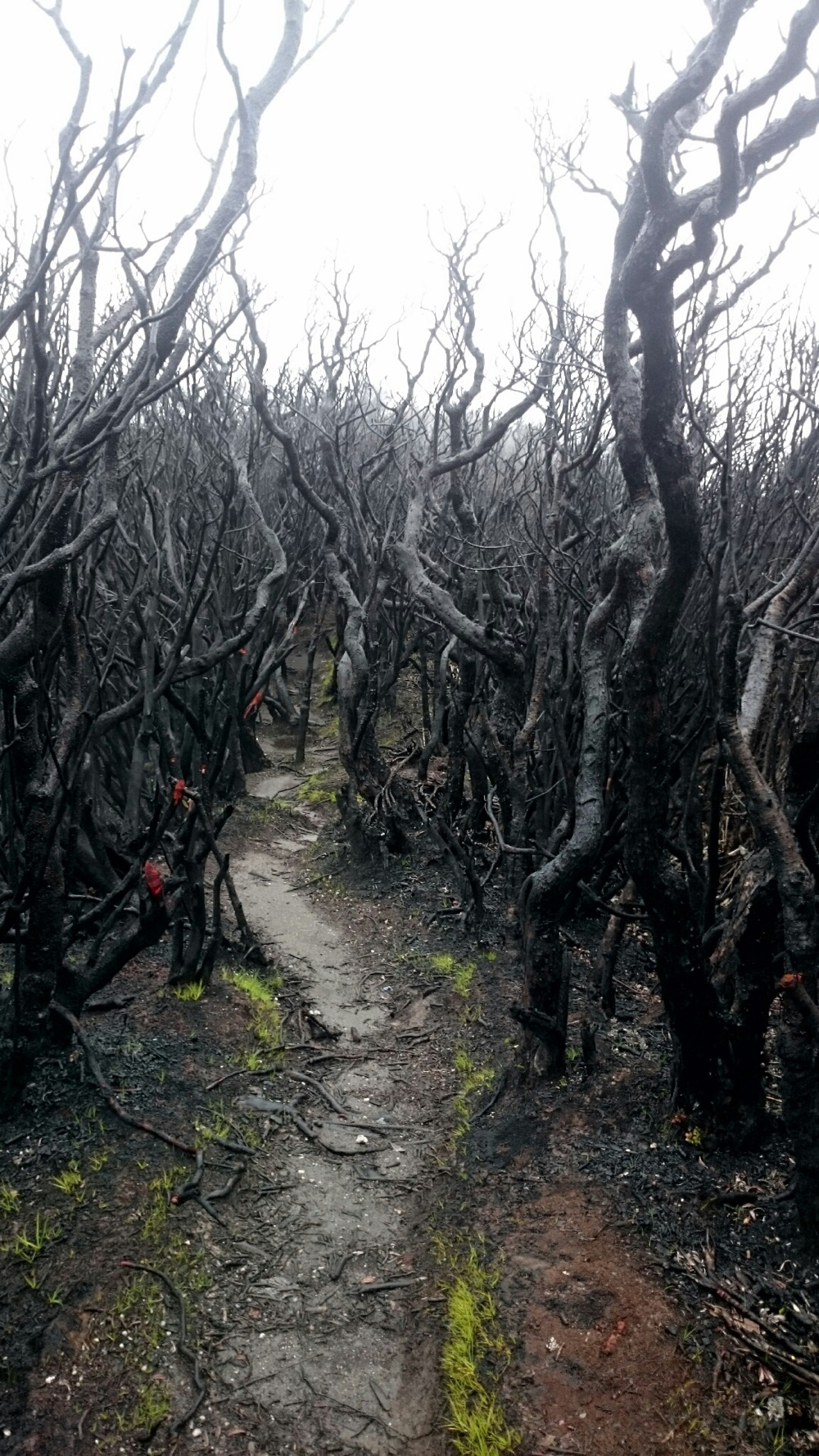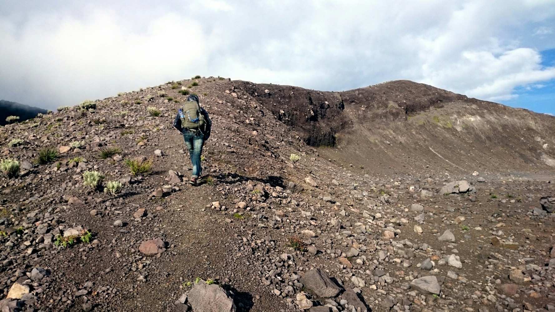 Наверху - дождь, ветер и какой-то адовый лес: чёрные стволы без единого листочка. Переночевали там, с утра пошли до кратера. Озеро в облаках, а с самого кратера дует такой ветрище, при котором, на моей малой Родине, в Североморске у старшеклассников занятия в школе отменяли.