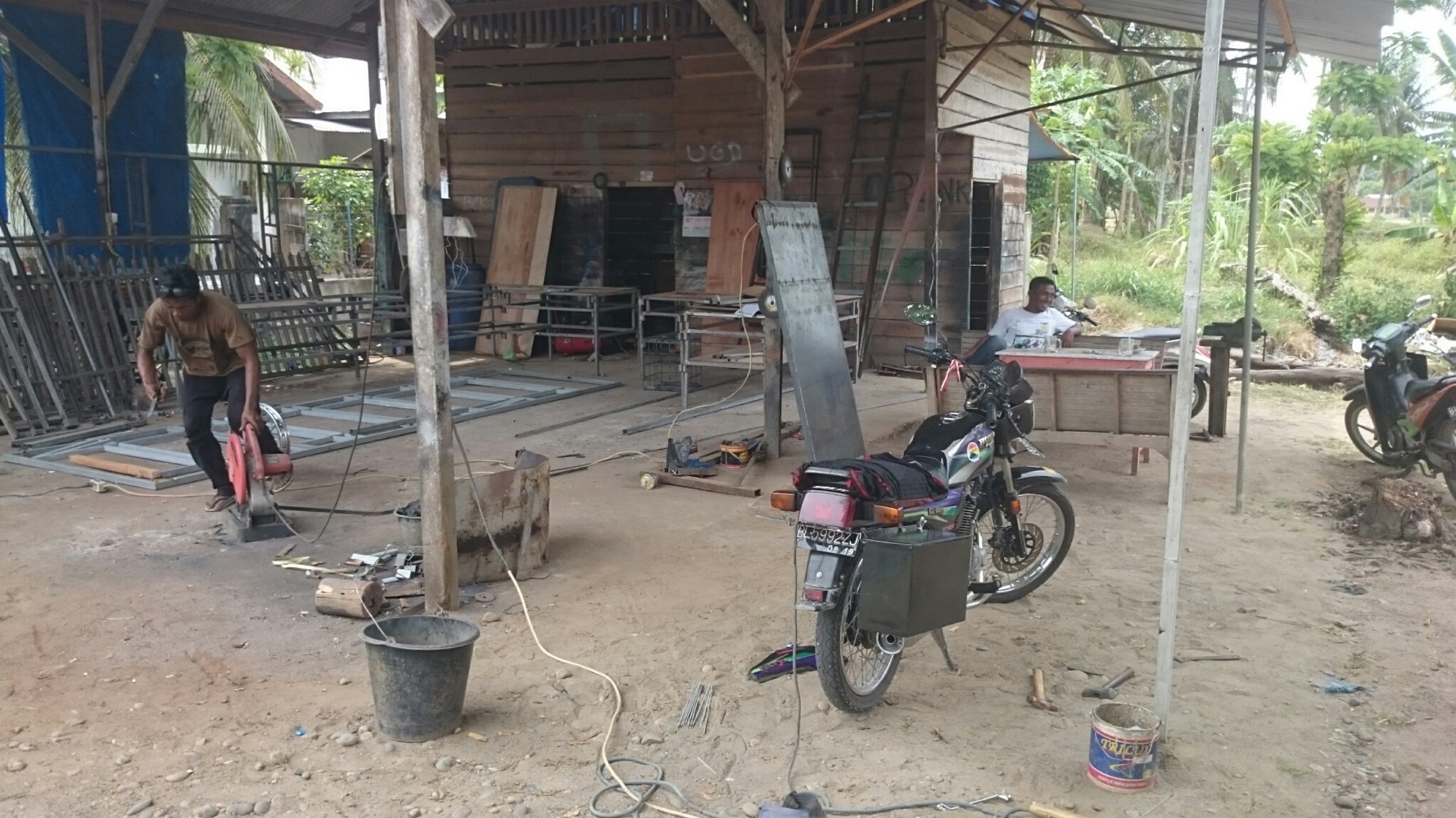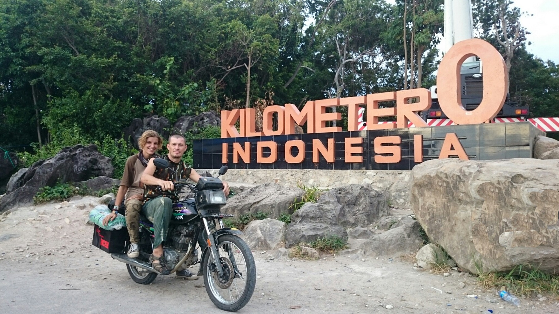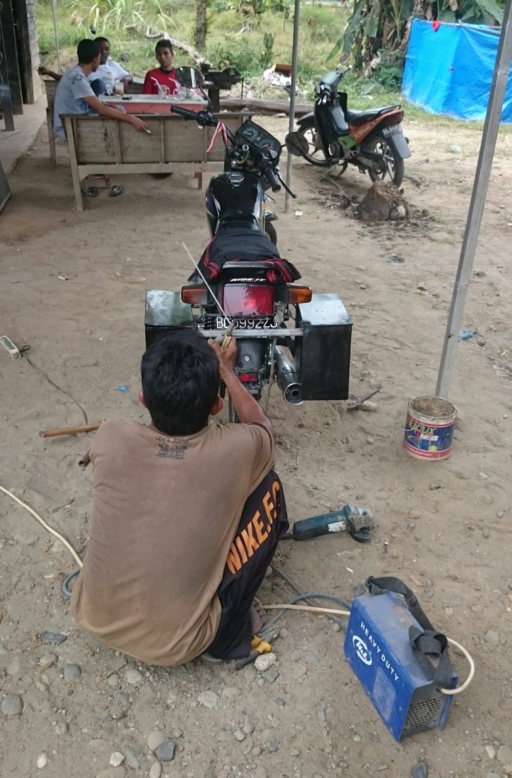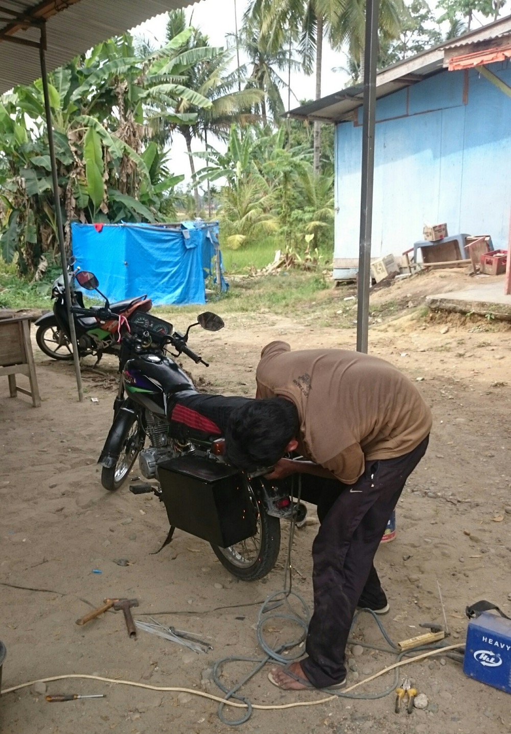 И я до сих пор в шоке от индонезийских цен. Разобрать половину мотоцикла, сварить раму, наварить на неё ещё штыри для усиления... Пол дня работы... Ужинали уже вместе с хозяином мастерской... Заодно помылись у них 😊 Ночевать, правда уехали на пляж, но ещё воды и сигарет дали в дорогу...