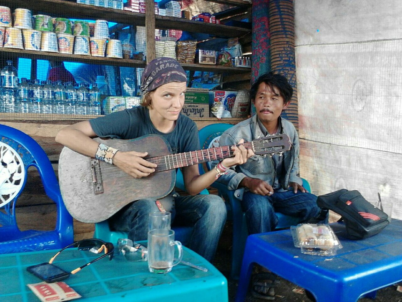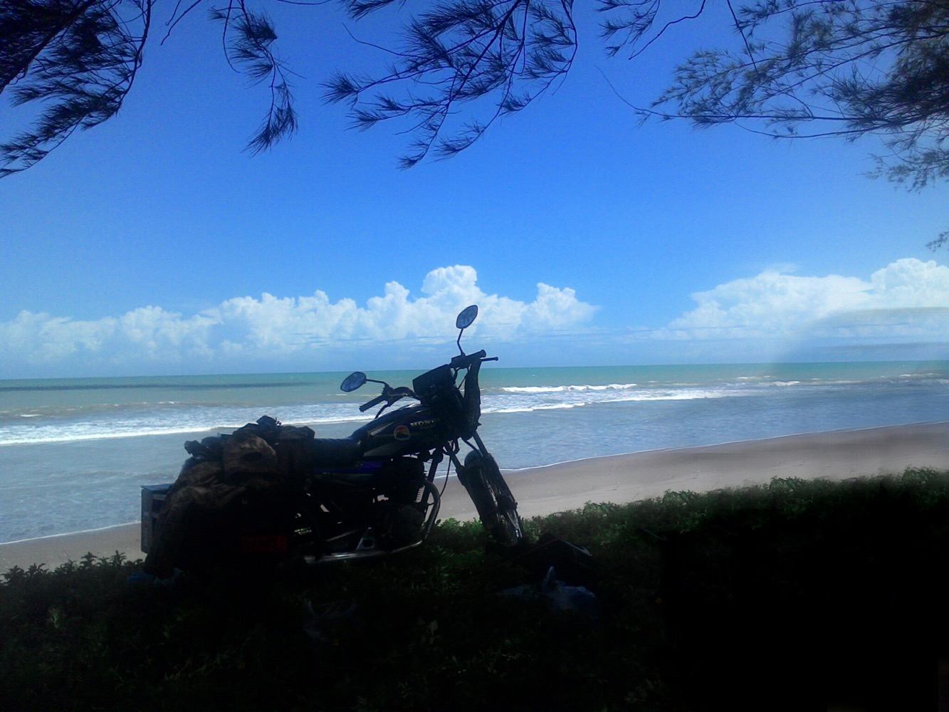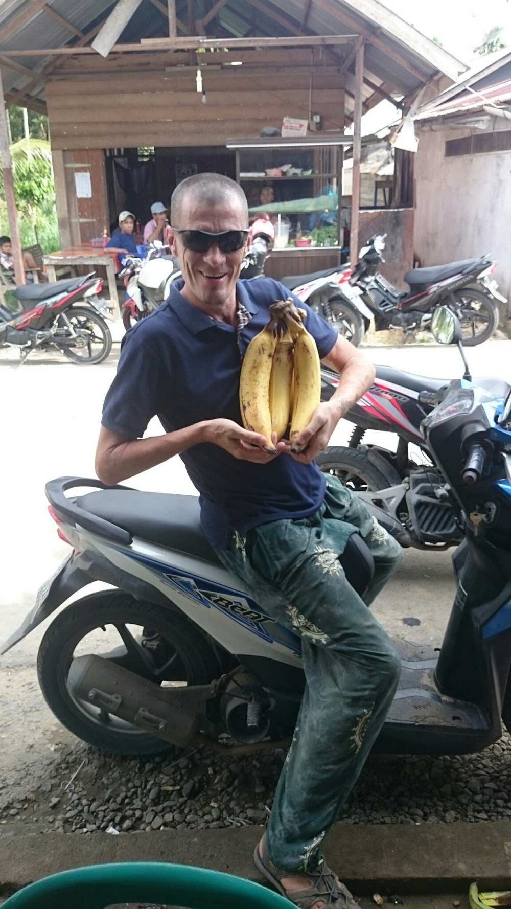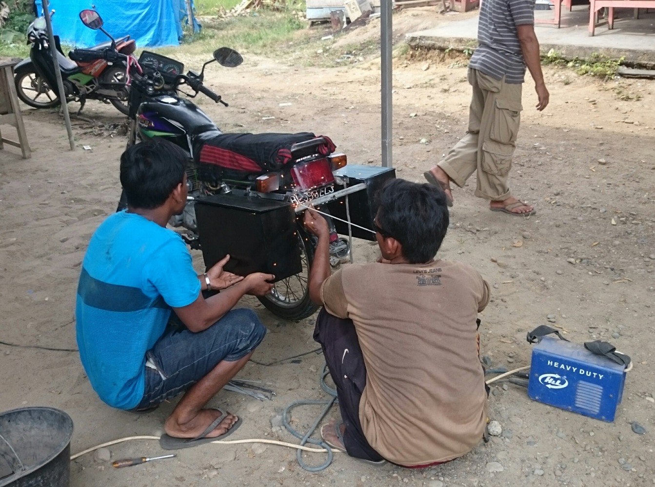 И я до сих пор в шоке от индонезийских цен. Разобрать половину мотоцикла, сварить раму, наварить на неё ещё штыри для усиления... Пол дня работы... Ужинали уже вместе с хозяином мастерской... Заодно помылись у них 😊 Ночевать, правда уехали на пляж, но ещё воды и сигарет дали в дорогу...