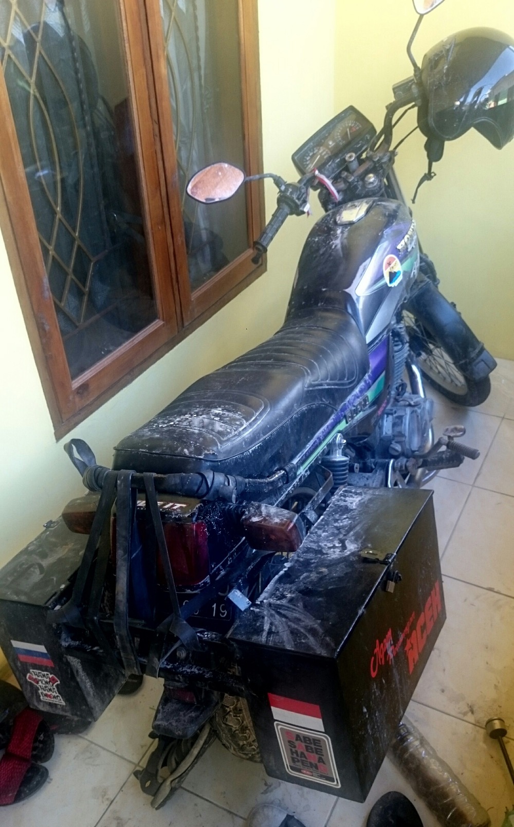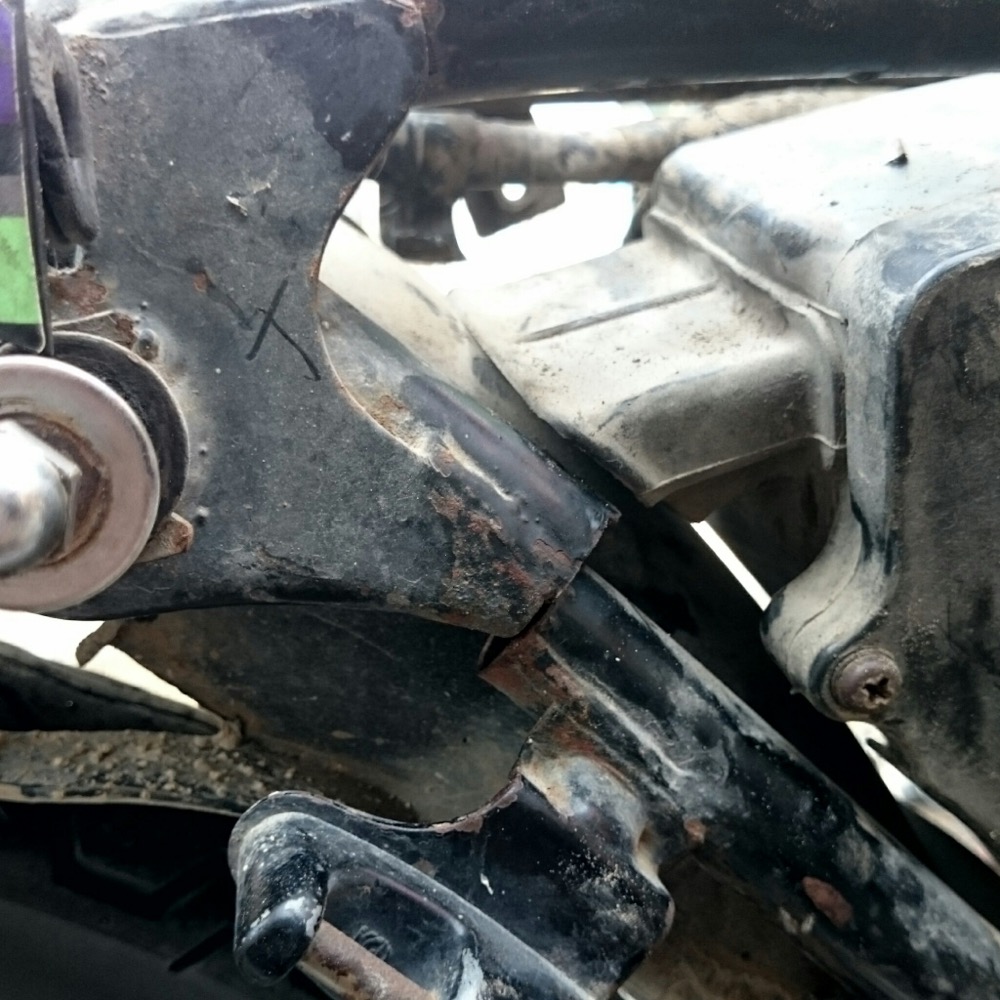 Самая серьёзная (да и в общем-то единственная) поломка за всю Суматру: у моцика треснула рама, сразу в двух местах, справа и слева. Ну, точнее, правая треснула раньше, но мы не заметили под пластиком. А когда треснула левая - уже почувствовалось, что что-то не так.