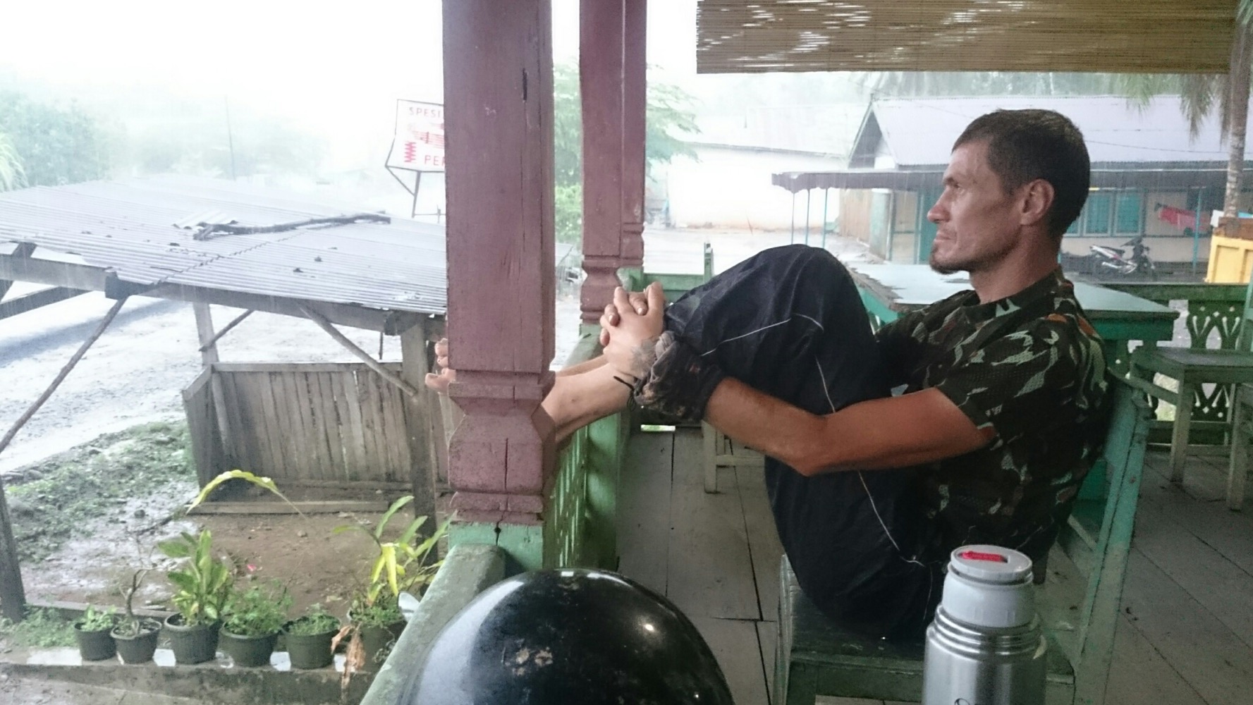 Забавная тут вписка получилась. Едем такие на очередную дырку в горе смотреть (кратер, то бишь). За 70 км до пункта назначения дождь въебал. Мокнуть не охота, никуда не торопимся. Остановились возле дома какого-то под козырьком. Минут через 10 к дому подъезжает дядя, мокрый, улыбается... Зашёл на второй этаж. Минут через 5 зовёт: "Я кофе сварил, пойдемте пить!" Выпили кофе, спрашивает че/куда. А... Букит Каба, ага. Но ночью ехать не надо, не безопасно (а уже смеркалось), оставайтесь ночевать... А я.. А я не тут живу, я уеду на ночь. Ах да, а байк давайте на первый этаж загоним, а то на улице не надо оставлять. Ну все, туалет там, кофе здесь, располагайтесь, я поехал. Увидимся утром.
