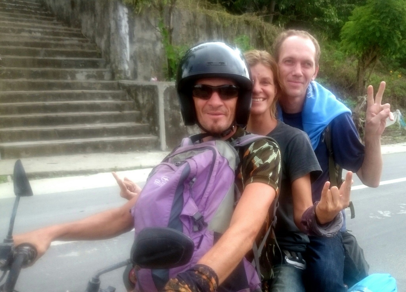 И с утра пошли вниз. Спустились где-то до половины, народа много, все селфи норовят с буле заполучить. Когда отказываемся, с совсем милыми - фоткаемся. Тут встречаем ребят-судентов. Они вверх, мы вниз. И Серж говорит - смотри, у девочки такая же сумочка, как моя. А сумочка непростая, бангкокская... и осознается, что сумочка-то его... Гугл-транслейтером спрашиваем сурово: "где взяли?" Девочка говорит: "на плантациях нашли"... Ну в общем становиться все понятно. Спешим к байку - так и есть. Оба замка с багажников сорваны. Много что по мелочи спиздили: паяльник, отвертку, часы... И мою косметику с мыльно-рыльными (а я там ныкал какую-то часть денег 😒 ) Не все, конечно, но достаточно, больше 100$. И она со мной много где побывала, и забывала я её много раз в общих душах/туалетах. Ну кто подумает, что под зубной щеткой, прокладками и мылом бабло лежит. А вот же, подумали...