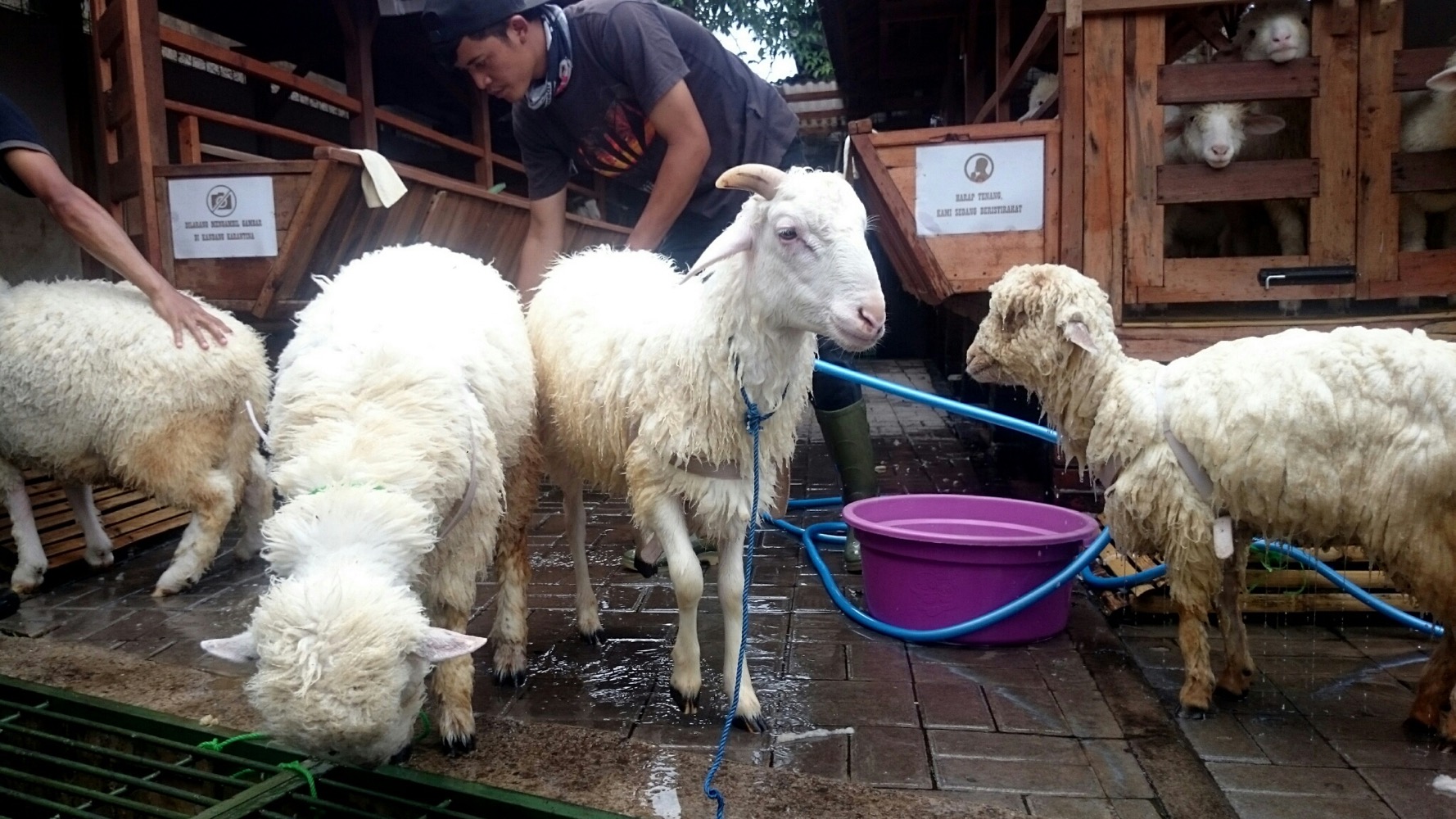 Внутри сделан мини-зоопарк, с фермерским уклоном. Можно попоить молоком телят или искупать овцу: