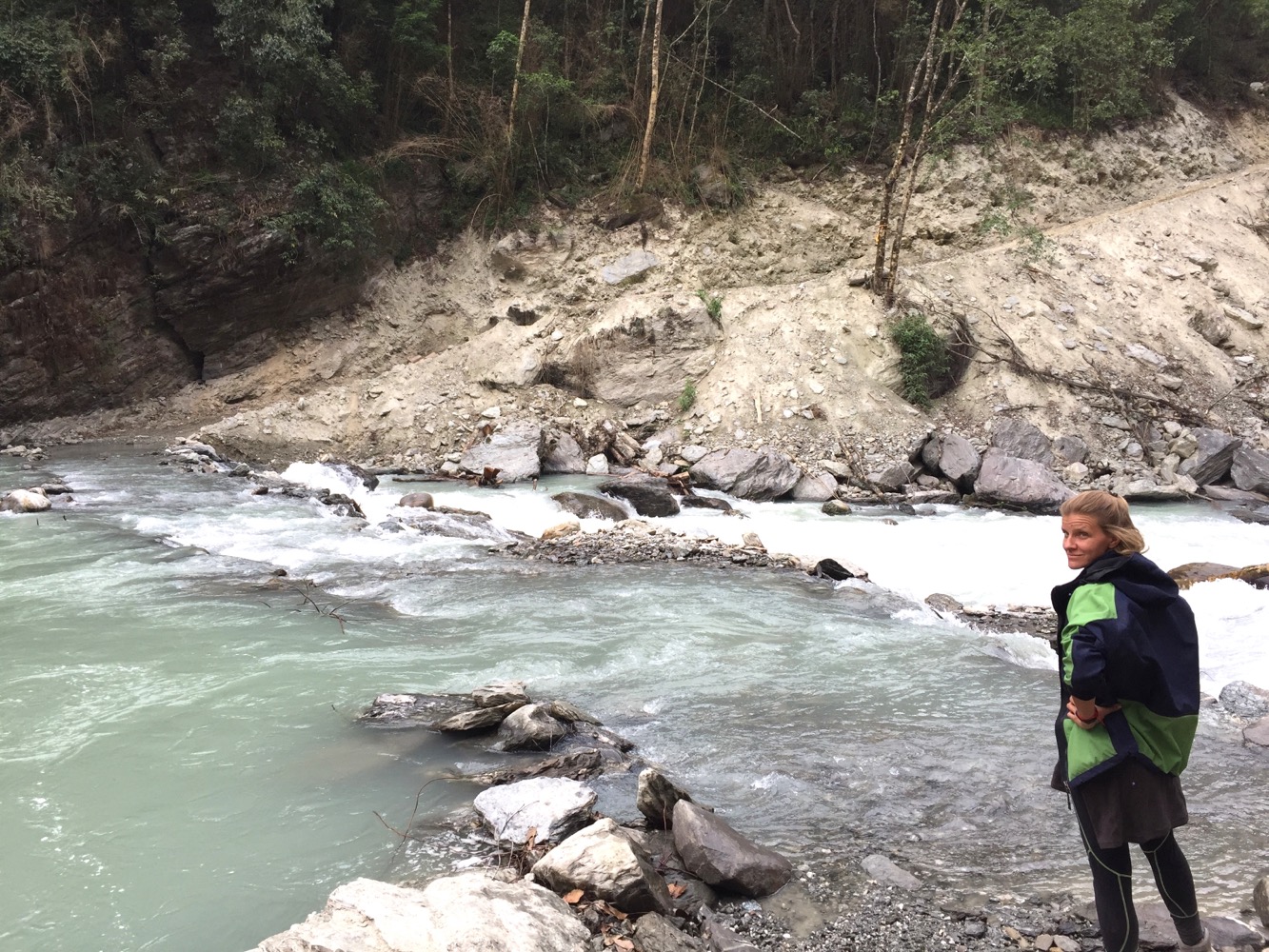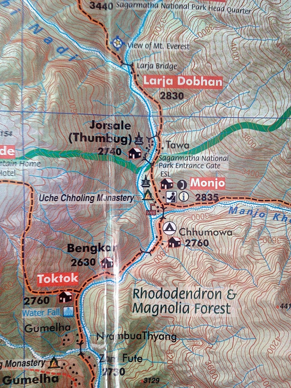 А, во-вторых, меня таки поддастала наша черепашья скорость и в пять вечера в Пакдинге я объявила, что пойду дальше. Ибо как раз можно было проскочить вечером Чамоа с Монжо, избежав соответственно лишних трат, да и вообще ну уж очень медленно мы идём. Но план развалился почти в самом начале и в двух местах. Во-первых, кто-то шепнул мне на ушко о "непальской картографии". Типо: присмотрись-ка ты ещё раз к карте. Что мы видим? Что к какому-то абсолютно второстепенному поселку Джарсале сделано аж два моста. А после Бенгкара дорога почему-то ещё какое-то время продолжается, а затем уходит на мост. Как-то странно всё это выглядит, как будто кто-то ластиком просто стер дорогу с левой стороны...