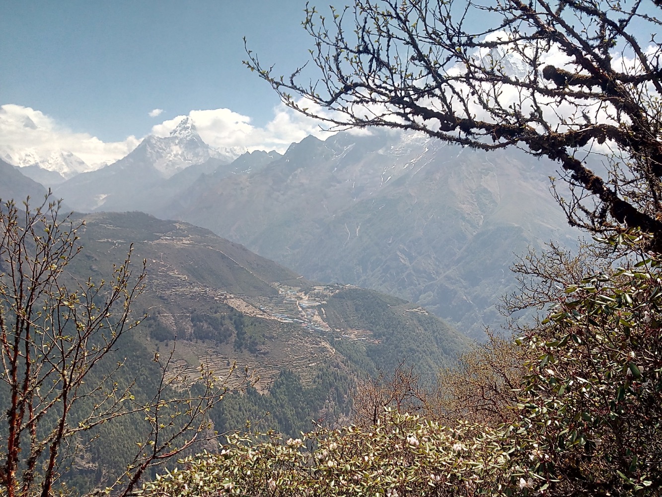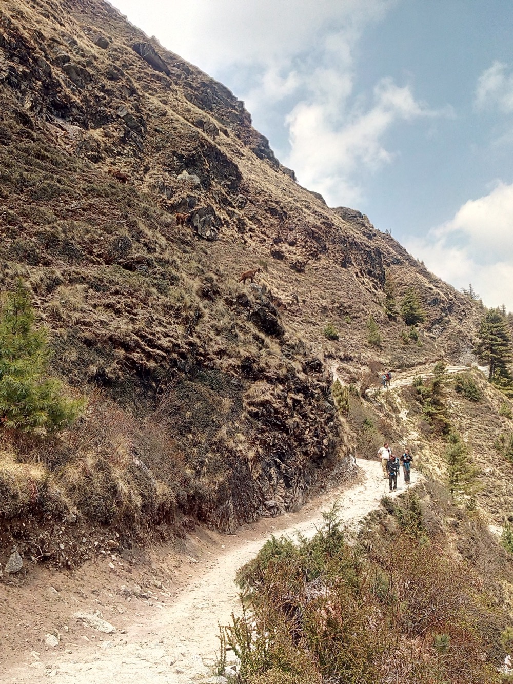 Дошла до Конде повстречав только стайку горных козлов. В Конде несколько дорогих на вид домиков, все закрыты. В одном из них откопались две девочки-непалки-персоналки. Налили чаю, дали зарядку и wi-fi. Ааа! первый интернет за пару+ недель :) Часик отдохнула и пошла вниз. Долго шла. Радовалась, что всё-таки тогда, в начале трека мальчик-гид из ТокТока сказал, что не надо идти вверх в Конде. Тут вниз 1500м сбрасывать заколебалась, а уж вверх...