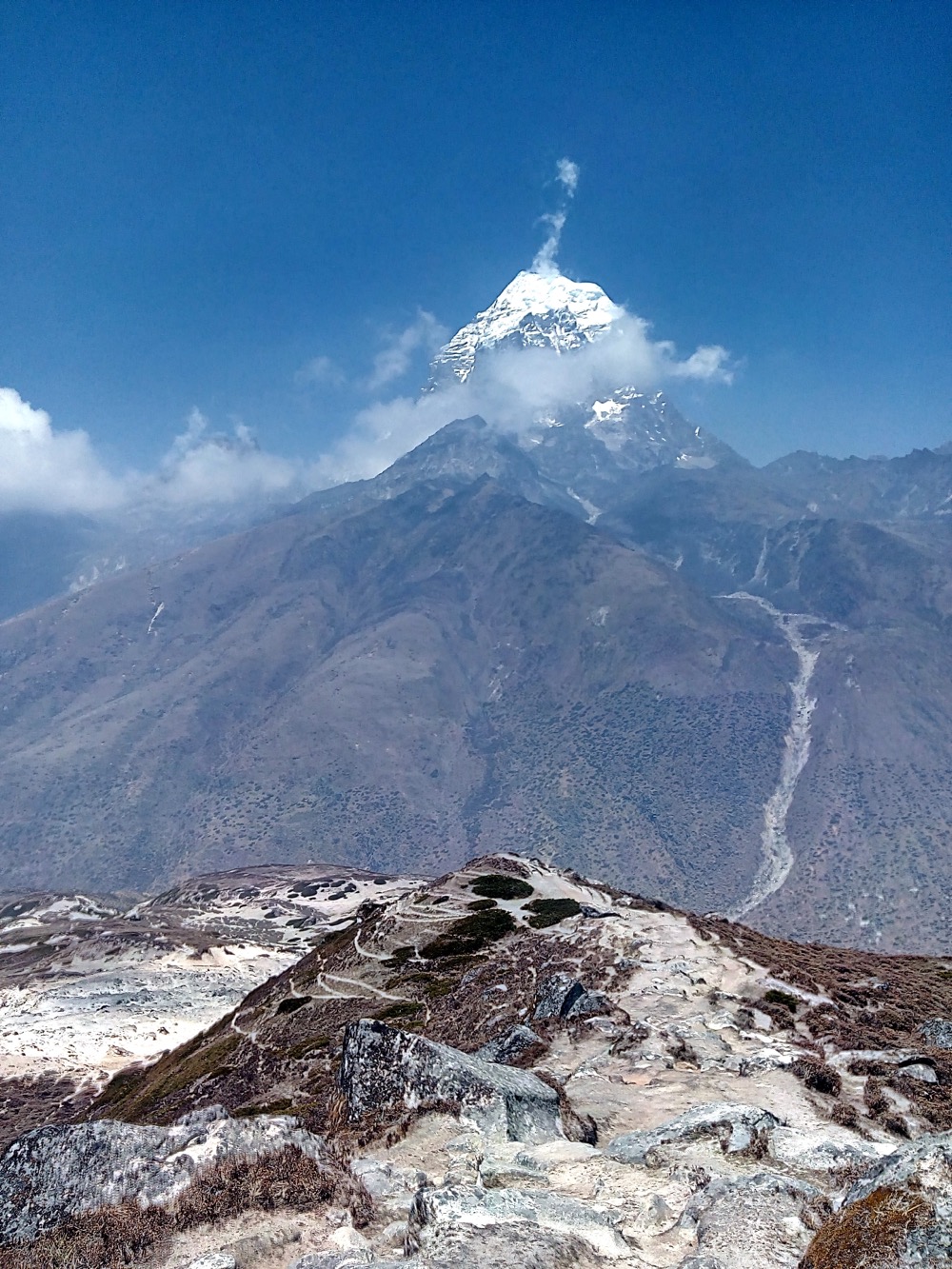 А вниз спускаться мне совсем не захотелось... Но! Оказывается после ЭБЛ можно пойти дальше наверх - там будет несколько смотровых площадок и базовый лагерь Пумори. Идти где-то 1,5 часа в одну сторону. Не пошла, ибо было поздно (~12), облака и сильный ветер. Но если бы знать заранее или иметь в запасе лишний день или вместо Калапатара... Странно, что ни на бумажной карте, ни на мапс.ми этой тропы нет. Но тем интереснее!
