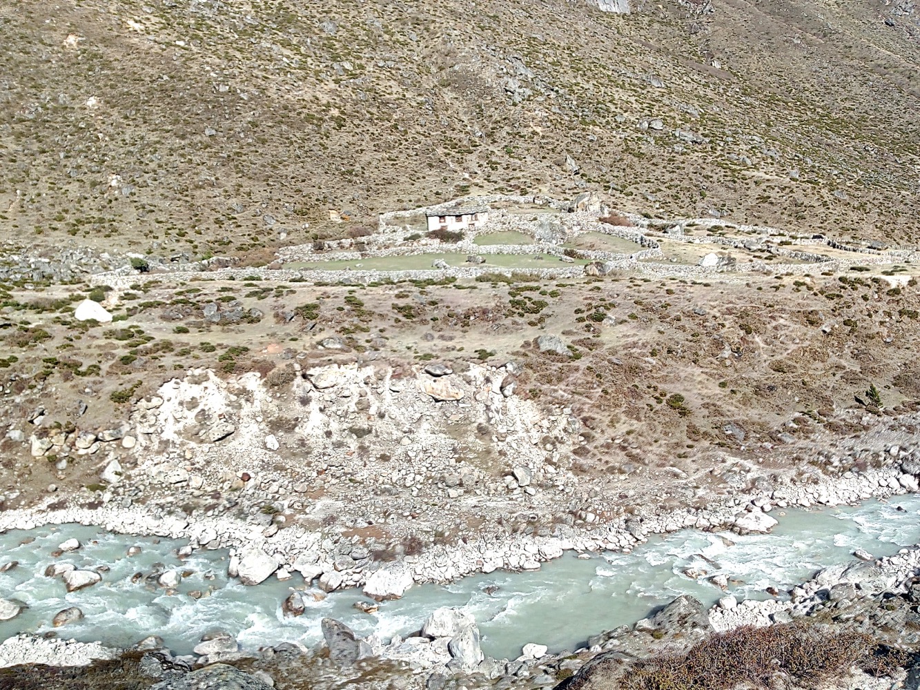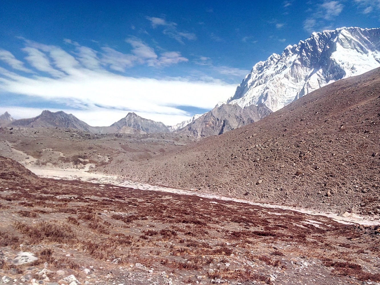 А потом, пока я спускалась до Таме словила прикольное ощущение. По сути на спуске нет ни одной горизонтальной линии. Сразу за перевалом есть замерзшее озеро, а потом кругом одни горы и ломаные линии. Долгое время нет даже домов. И вот, в какой-то момент перестает быть понятно под каким углом ты спускаешся. То есть кажется, что вроде угол небольшой, ставишь ногу, а оказывается, что она касается земли чуть позже, чем ожидаешь. Или наоборот. На Гокио почти всё время перед глазами озера - они дают какую-то горизонтальность. В ГоракШепе - как-то не до этого было. А тут - как в "королевстве кривых зеркал" :) Через несколько часов всё же появились домики и деревеньки и глюк пропал...