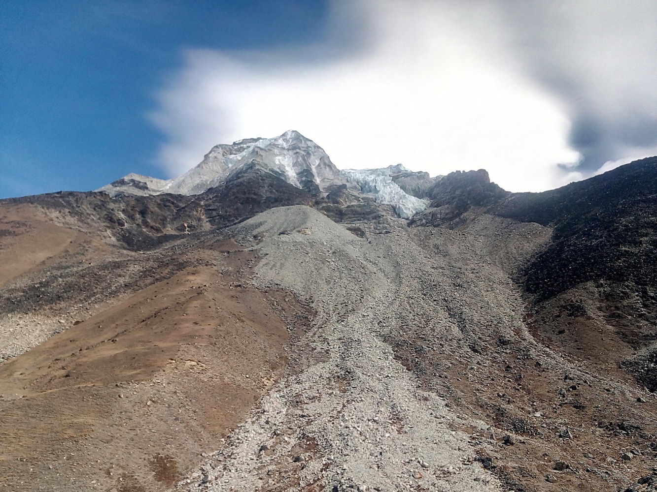 А вот что оказалось реально трешовенько - так это переход ледника за перевалом. На леднике я до этого ни разу не была и, в моей голове уравнение простое: ледник=лед=снег=скользко. Всё. Как-то так. На самом деле ледник Кхумбу в мае выглядит как поле с большими и маленькими валунами, выложенными бороздами, под которыми местами есть глыбы льда (непрерывно тающие). Местами они уже растаяли - получились гигантские лужи. Через всю эту "пахоту" есть тропинки, помеченные турами. Большая часть тропинок уже вникуда. Идешь-идешь по ней и тут она подводит к краю пятиметрового обрыва, на котором стоит последняя пирамидка. От того, что ты подходишь пирамидка и полметра камней, нависающих над льдиной валятся вниз, образую маленький камнепад. Главное успеть вовремя отойти назад. Вот фото, кстати, с гребешка на котором я была минут десять назад. Самое стремное, что когда подходишь сверху - этого карниза совсем не видно: