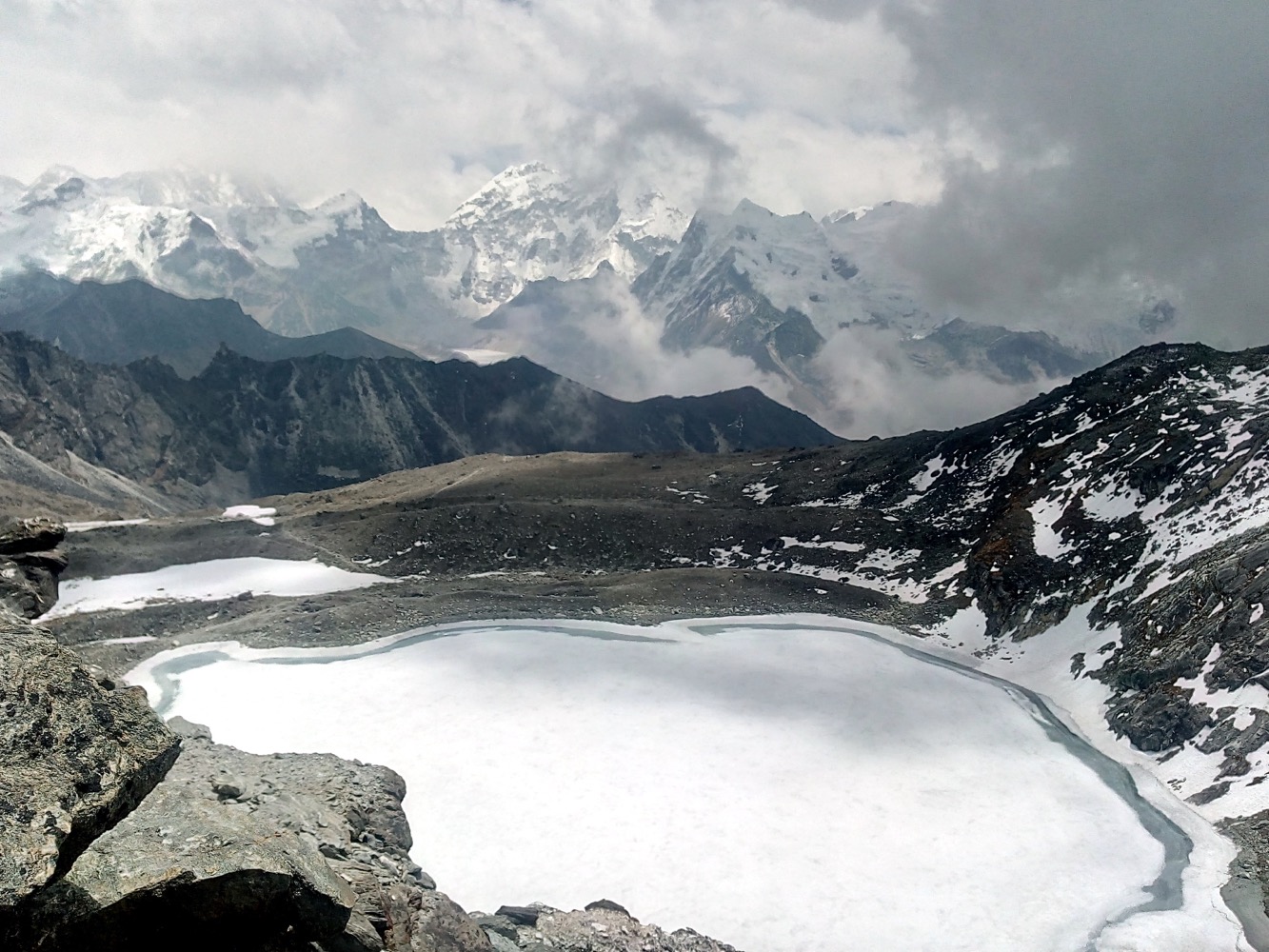 С утра вышли на ЧоЛа. Эверестообморочное состояние у меня закончилось. Френдесса вогнала в себя с утра несколько сигарет - поэтому, еле шла, охала и ахала. Но я уже никуда не торопилась, да и было интересно посмотреть как пойдет, поэтому шли не торопясь. От слова совсем. Перевал интересный, мягкий я бы сказала. Сначала чуть по долинке пройти, потом немного вверх по камням. Потом по ещё одной долинке, только уже заснеженной и опять немного вверх. Вот и всё. Танин первый 5000+ перевал: