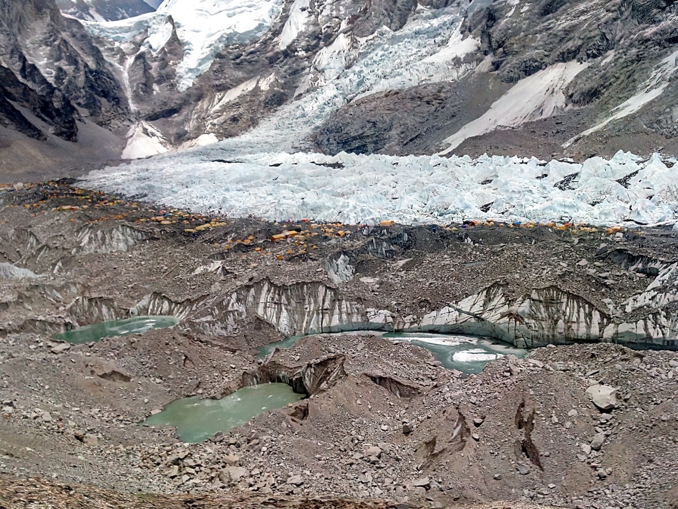 На утро, попив чаю, разошлись. Я в ГоракШеп, Татьяна - ждать своих американских френдов. До ГоракШепа всего два часа, знала бы - могла бы и вчера осилить. Вписалась в первом же гесте в дорме за 100 рупий. Днём дорм оказался приватной комнатой, но к 22 ночи к нам ввалилась толпа гидов. В общем-то хорошо, потому что на следующее утро они как раз и разбудили и взбодрили меня на Калапатар. Но это было на следующее утро. А тут в 9 утра я уже пришла, кинула вещи и отправилась на тот самый Бейс-Кемп. Народу ну очень много. И, что удивительного, очень много пожилых, еле идущих дедушек и даже бабушек. Я помню, как несколько лет назад удивилась, встретив на МардиХимале израильтоску 84 лет. Но она там была единственная такая звезда! И очень бодро топала. А тут их много и они какие-то полуобморочные. И фонит от них этим жутким переутомлением так, что я сама еле ползу. В общем, вот фото базового лагеря Эвереста: