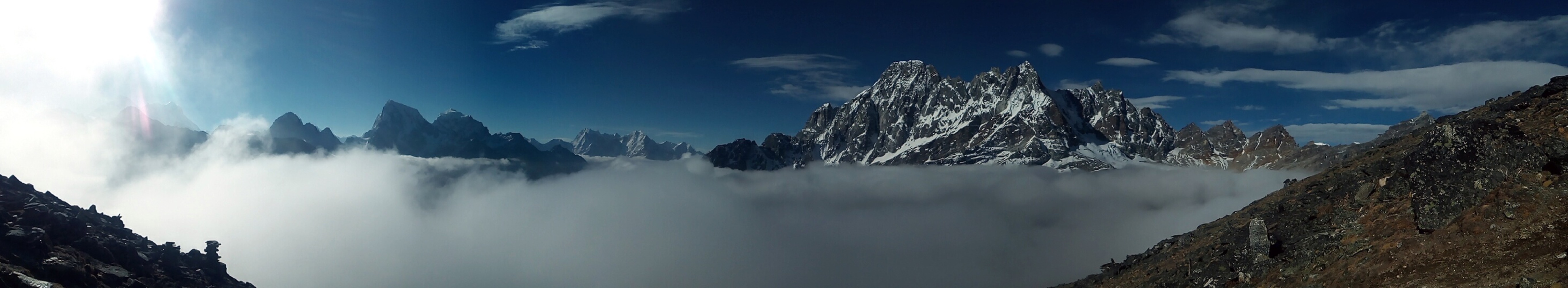Я с утра погнала на Гокио Ри. Та же высота, что Калапатар, даже под тем же углом подъем, даже набирать больше (600 метров против 450). Но я одна и, насколько проще идти! Когда вышла - над озером был туман, потом он начал подниматься вместе со мной, но я чуть быстрее и в какой-то момент мне стали видны куча-куча разных гор и горок.