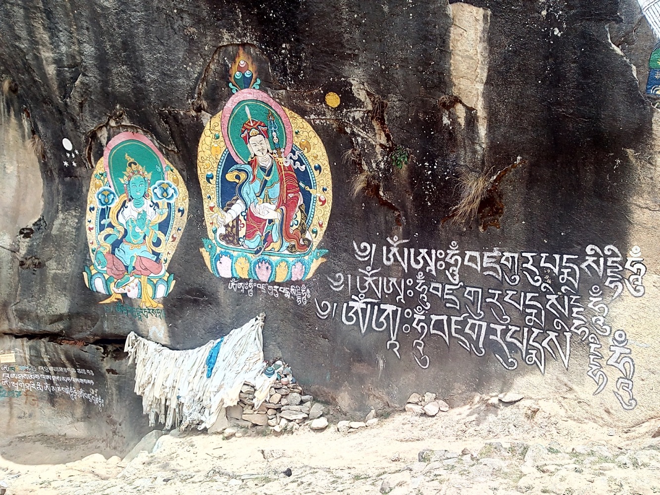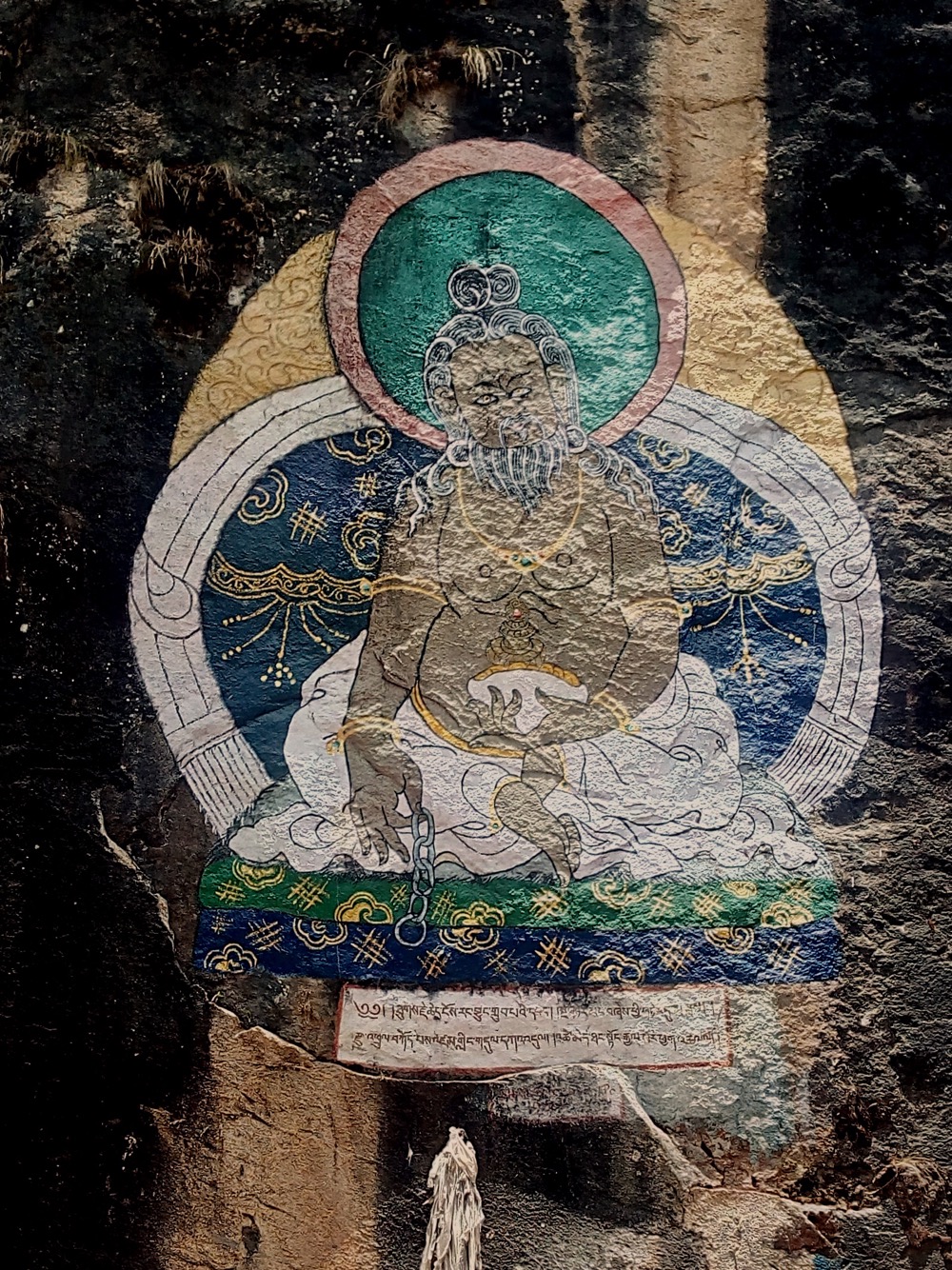 А вот второе место, куда я дотащила себя за день оказалось более интересным. Мощный водопад снизу, а на скале нарисованы Зеленая Тара, Гуру Ринпоче и Какой-то-третий-мужик (может кто опознает?)