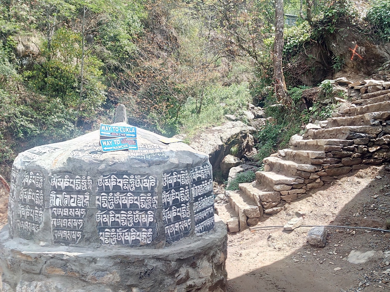 Договорились встретиться с Таней после чек-поста, в первой кафехе. Там же сидела какая-то румынка, которая начала нести про акклиматизацию и всё такое. И что в Намче обязательно надо день акклиматизироваться. Таня развесила уши. Да, конечно, если прилететь на самолёте в Луклу - оно надо, спору нет. Но, если подняться четыре часа из Джарсале - какая акклиматизация в Намче, о чем вы?! Но румынка уже ушла, а женский мозг решил, что ему нужна намчезация, а я ему в этом мешаю. Всё, тут я сдался. Прямо возле мани-стоуна, где направо/налево/прямо пойдешь, в Таме, Кумжунг, Тенгбоче попадешь.
