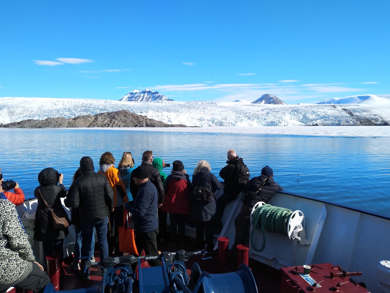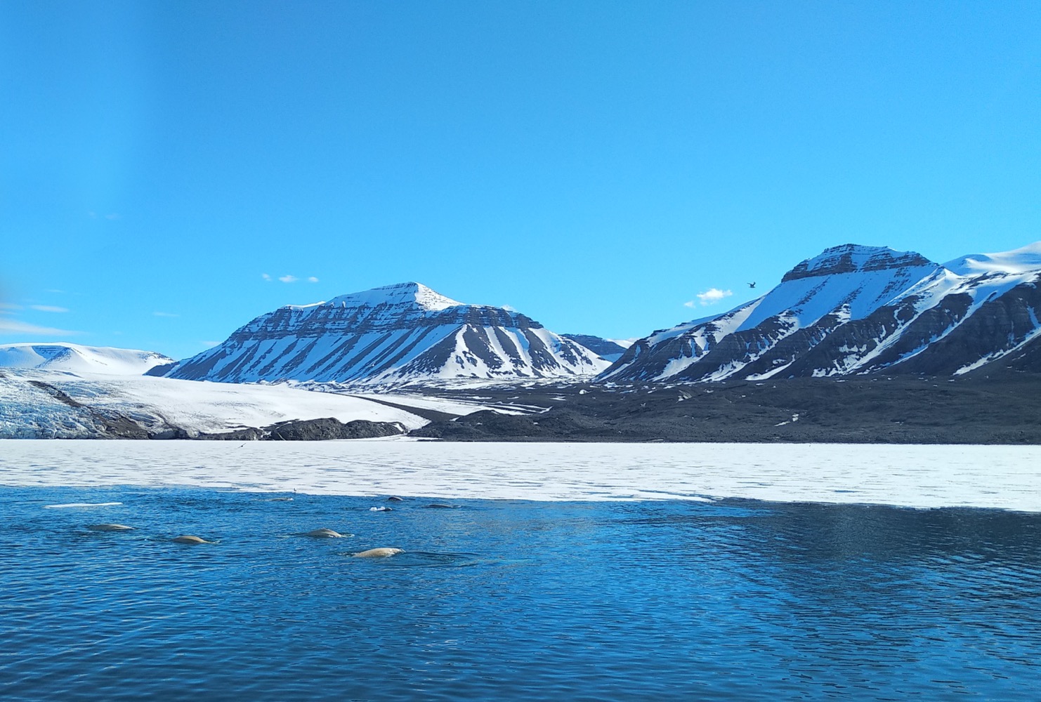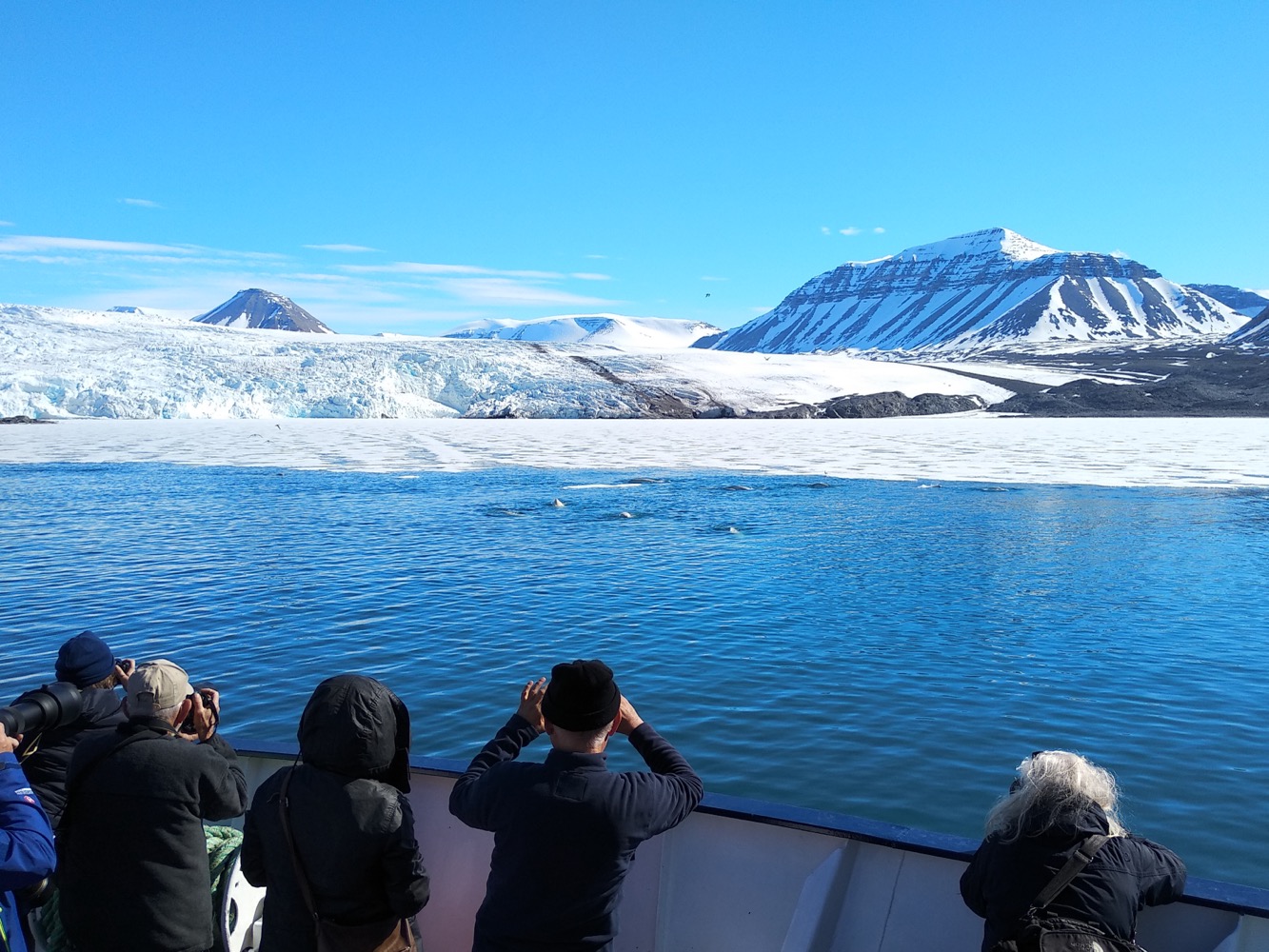 А ещё по дороге к Пирамиде мы подъезжали почти вплотную к леднику и видели стаю толи микро-китов, толи белуг. Это местные так сказали: whale belugas. Википедия по этому поводу молчит.