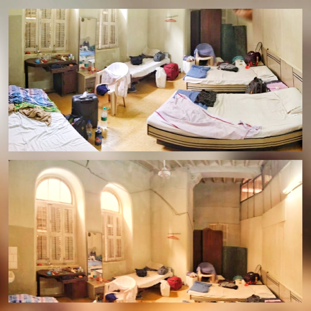 Третье здание от Тадж-Махала. Дом маркиза Керзона, вице-короля Индии. Во времена маркиза на первом этаже был просторный большой зал с колоннами. Новые хозяева разгородили всё это пространство на кучу маленьких комнат. В ново-индийском стиле, который при первом рассмотрении хочется именовать по-русски "недострой". Высота потолков там не малая, метров шесть-семь. В большинстве комнат, особенно тех, что в центре, стены сделали метра три только. А зачем больше? *_*. Как сказали друзья: "ощущение как в плацкартном вагоне едешь". Ощущение это усиливается к ночи, когда персонал отеля разбредается ко сну по верхним нишам над туалетами и кухней. Душ-туалетов там три, что вполне достаточно, кроме времени с 7 до 8 утра (вечером все возвращаются в разное время, очередей нет). На кухне много посуды, но мы варили только кофе с утра. Есть пара холодильников.