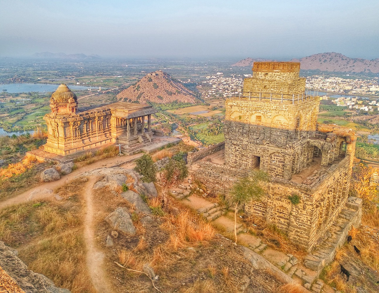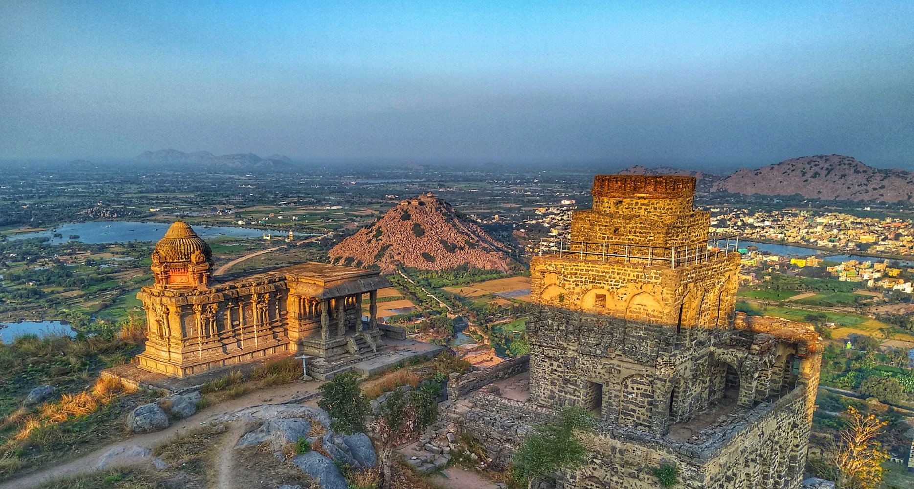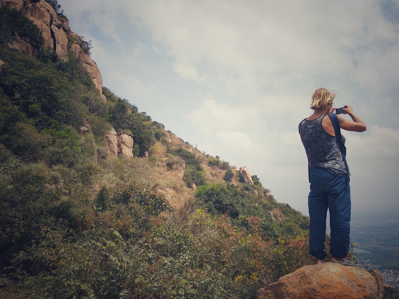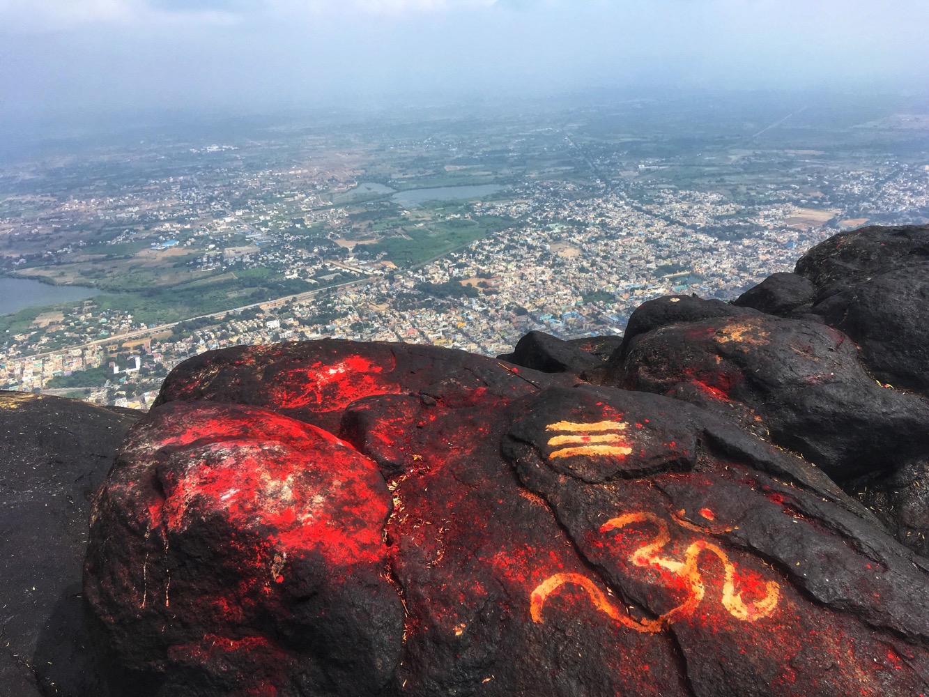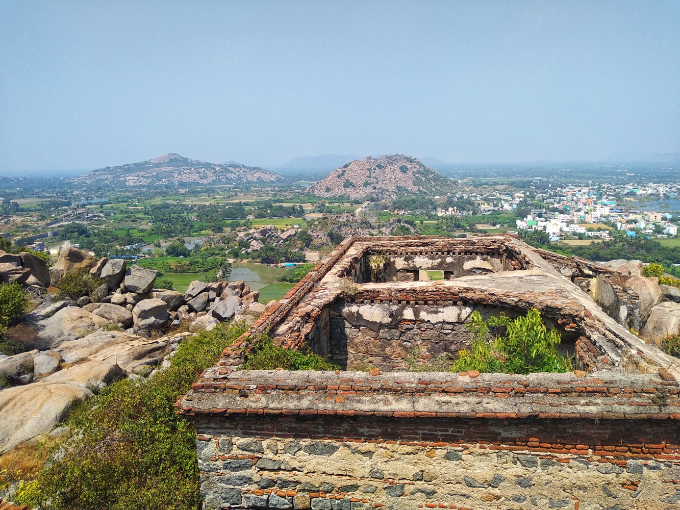 На другой горе, которая есть и в googlemaps - отреставрированный форт. Гугл сказал, что вход для иностранцев 100₹, проверять не стали. От главного входа нужно идти налево вдоль стены. Залаз тут: 12.248125, 79.398354