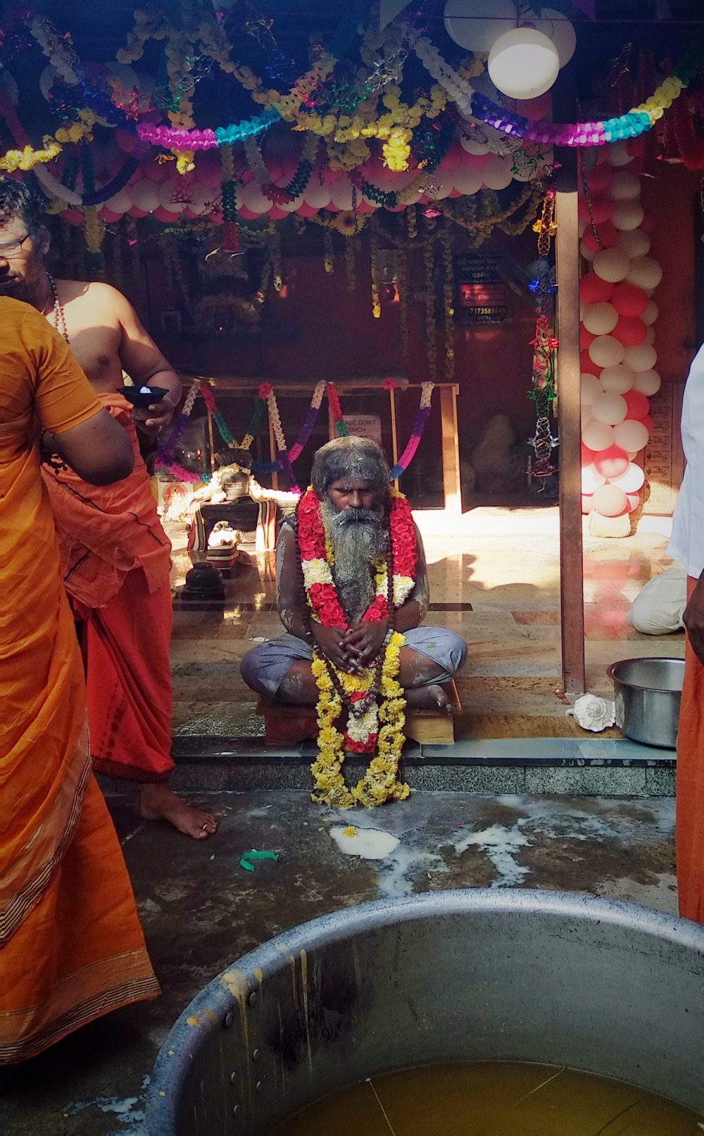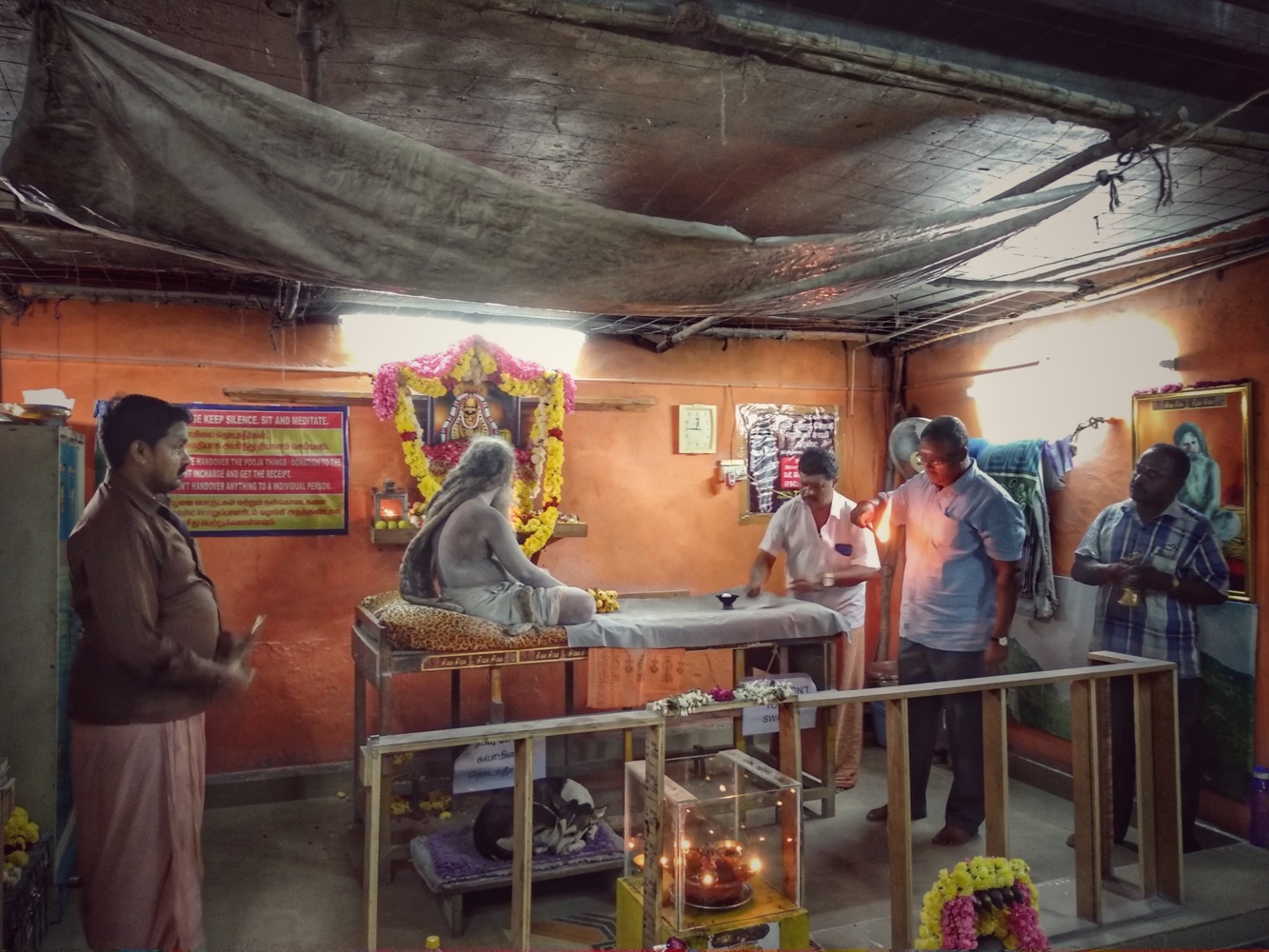 Про него рассказывают несколько историй. Якобы был он и бизнесмен богатый и человек в обществе уважаемый. А потом что-то переклинило-перегорело и он пришел к Горе. Несколько лет ходил вокруг неё, несколько лет жил на ней. Ни ел, ни пил и уже совсем уходил. Но нашла его какая-то тамильская семья, признала в нём Силу и начала о нём заботиться. С тех пор Свами сидит на своем постаменте, отходя только не надолго, и два раза в день совершает пуджи.