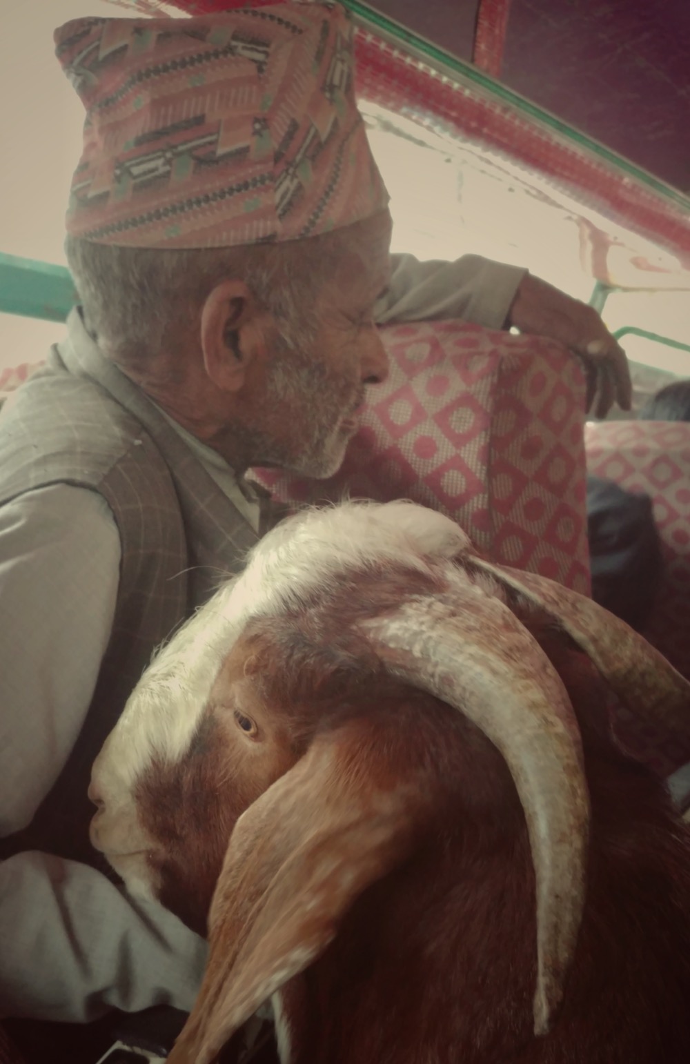 В этот же автобус по пути садиться дед-с-козой. Коза блокирует автобусу