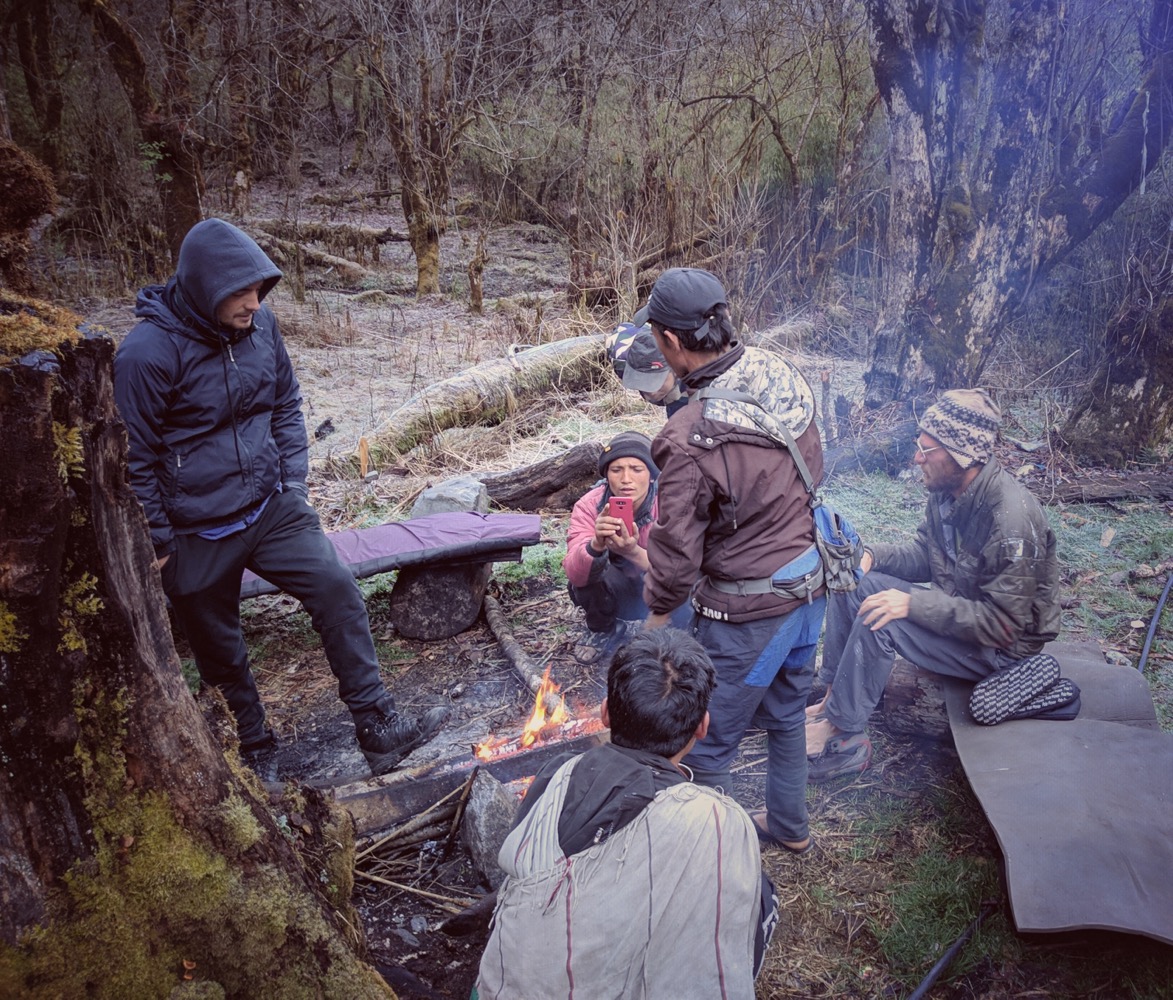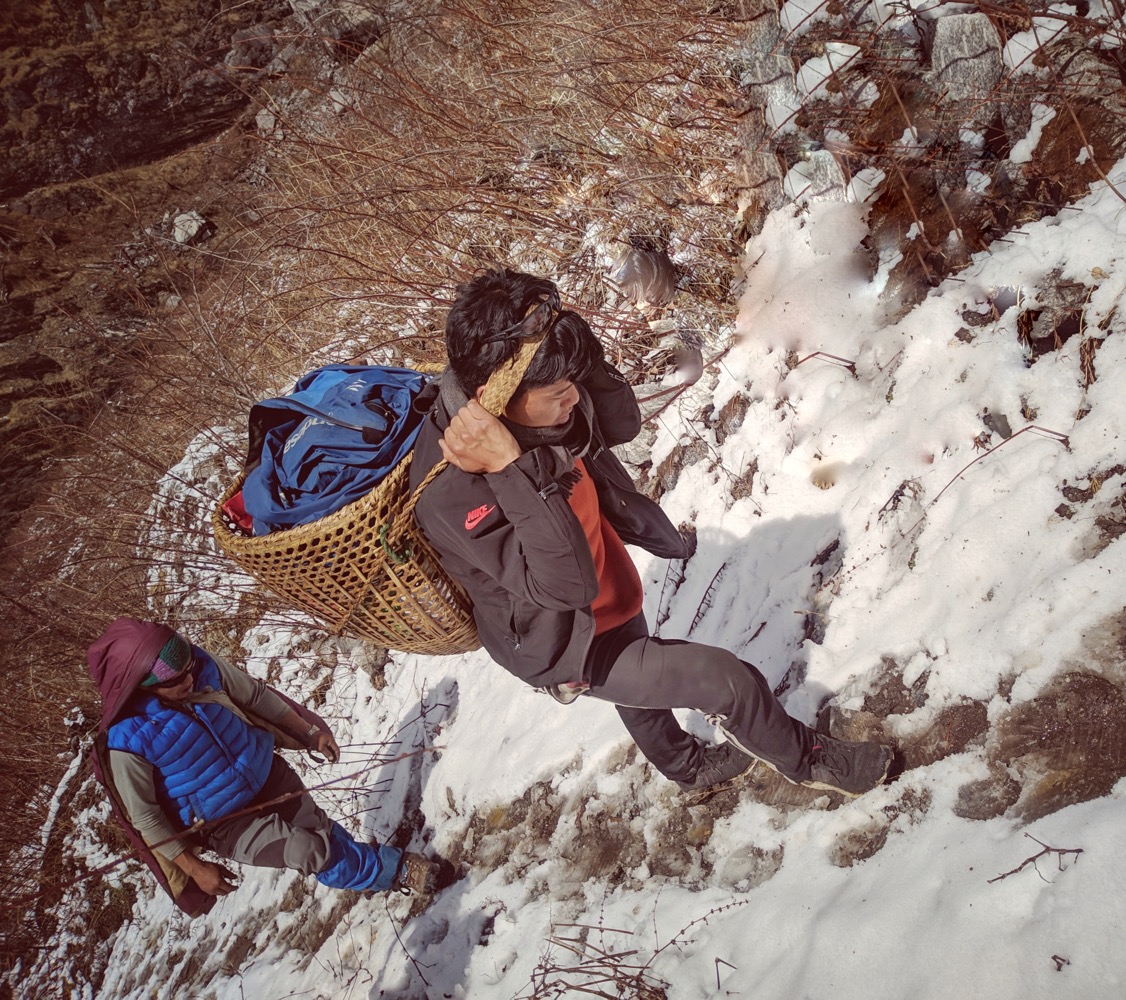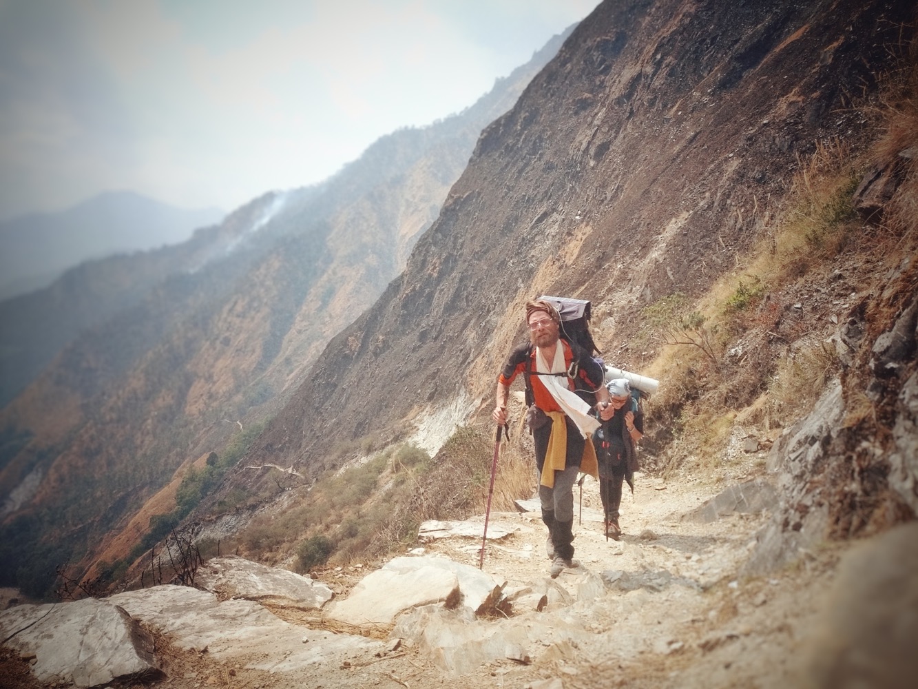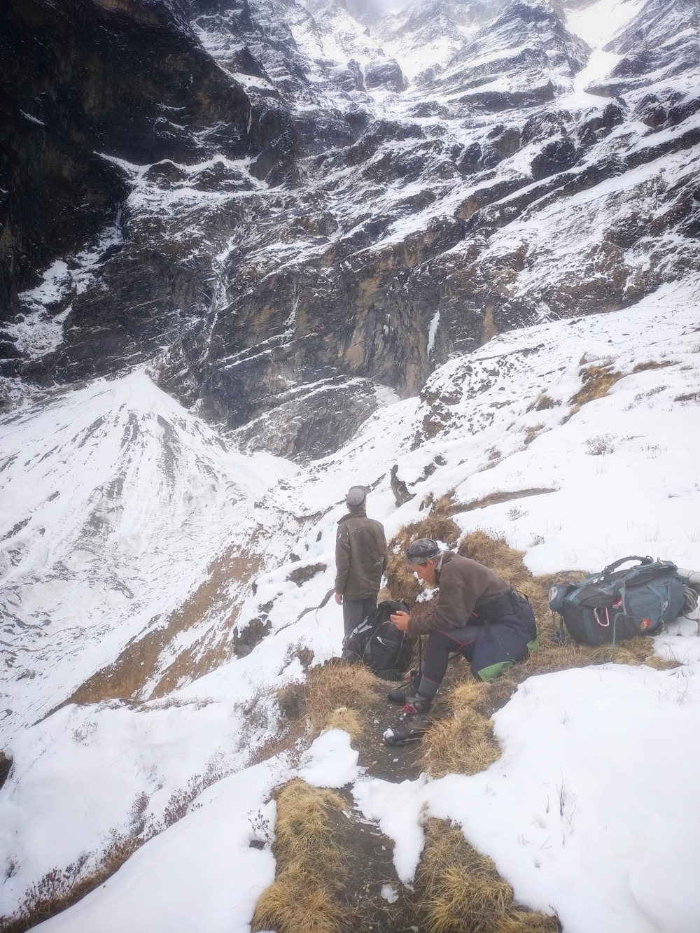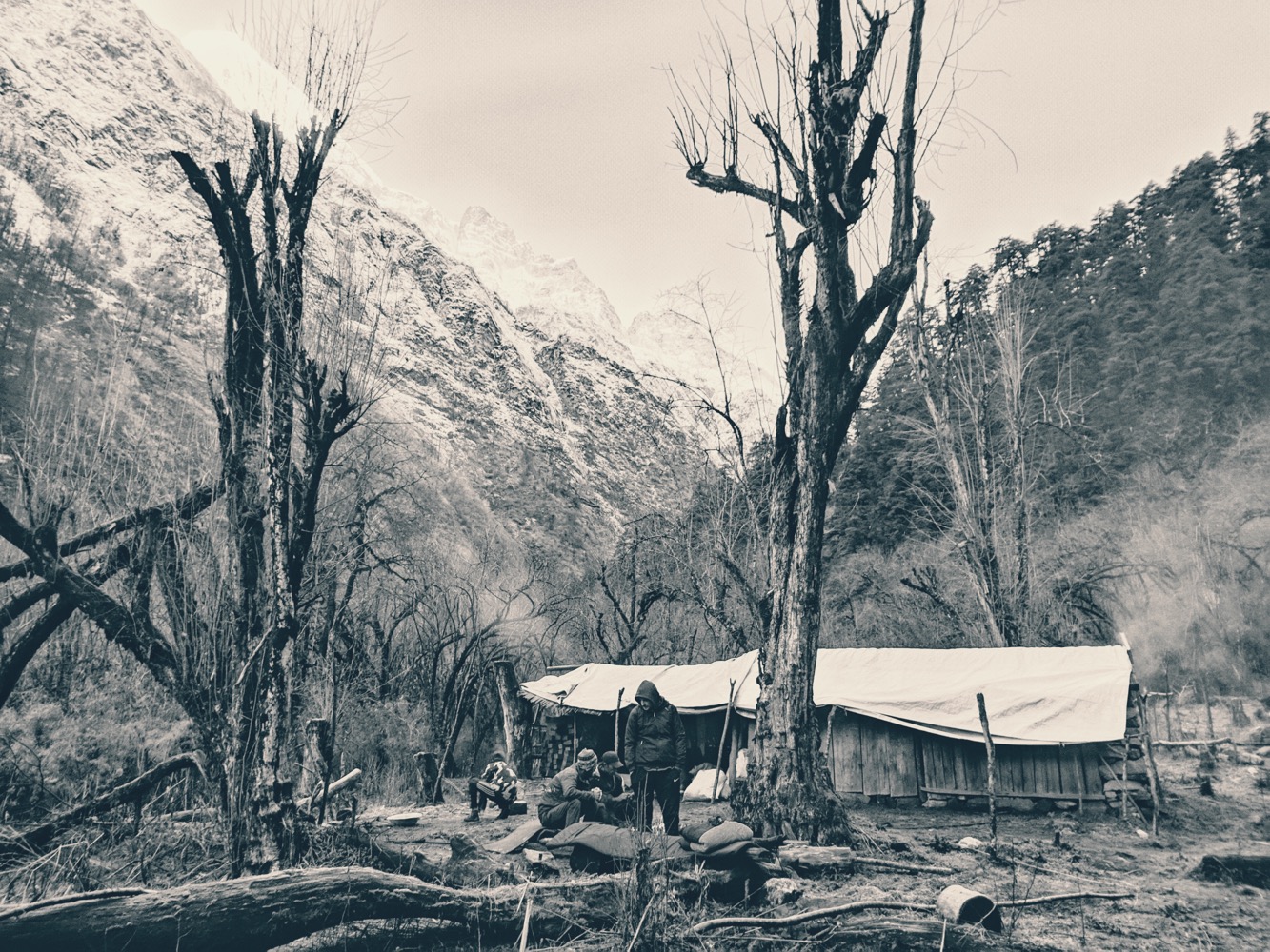 В итоге к вечеру мы выходим к кхарке, уже окупированной непальскими портерами. Но те потеснились и мы ночевали все вместе (28.652853, 83.411688)
