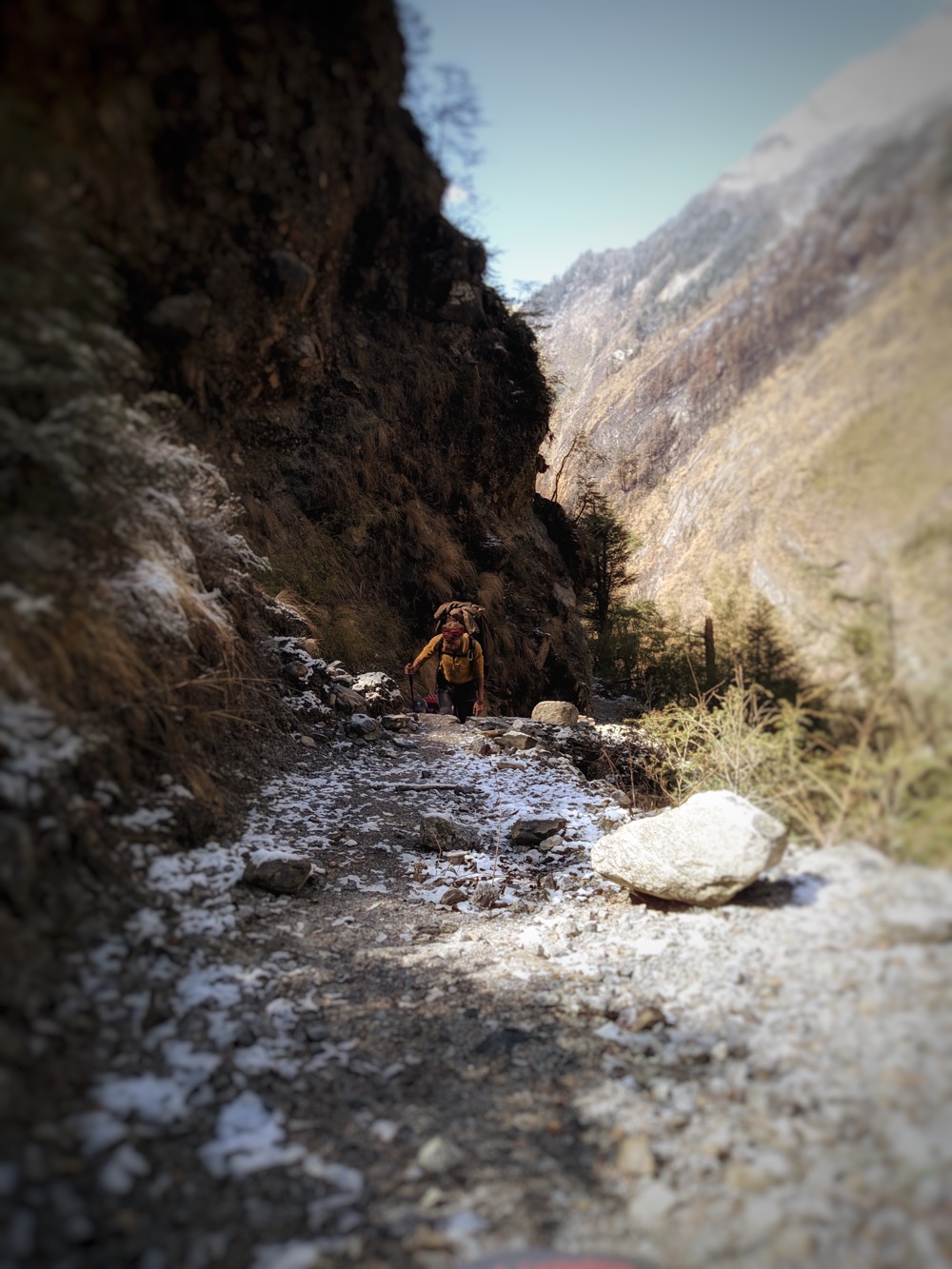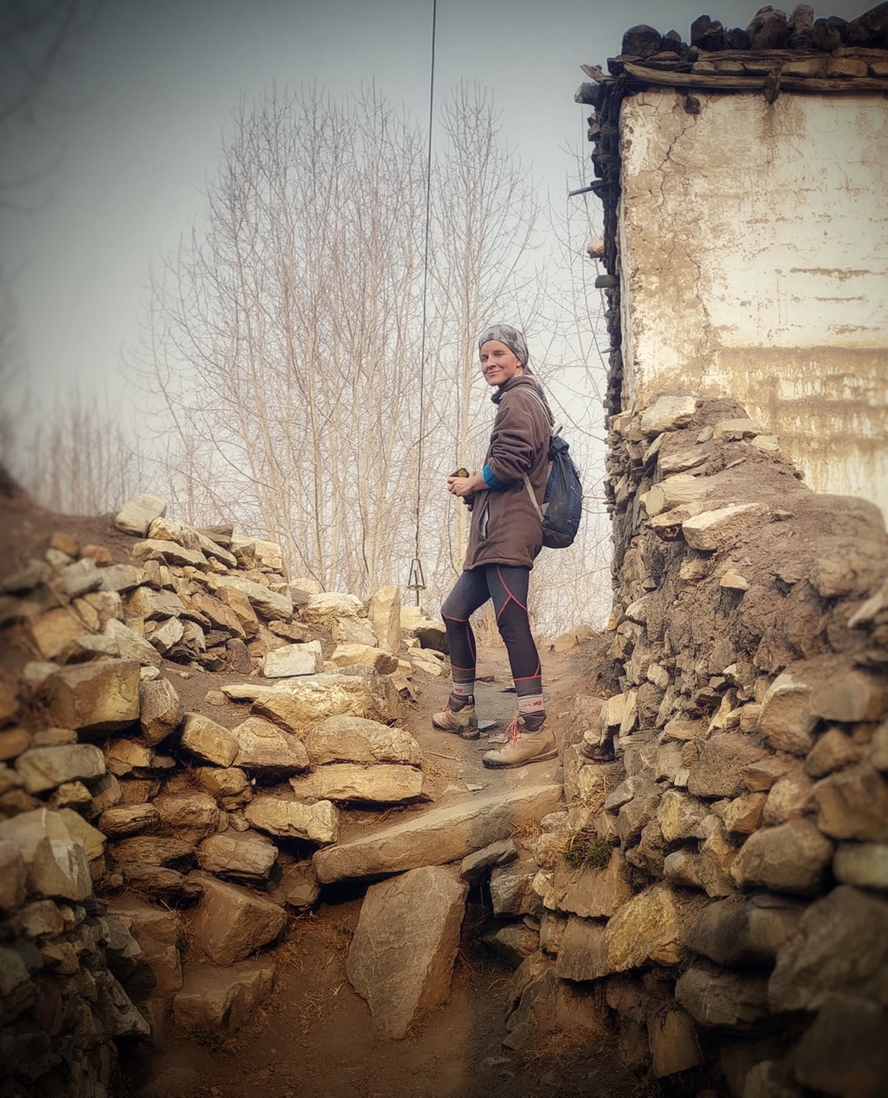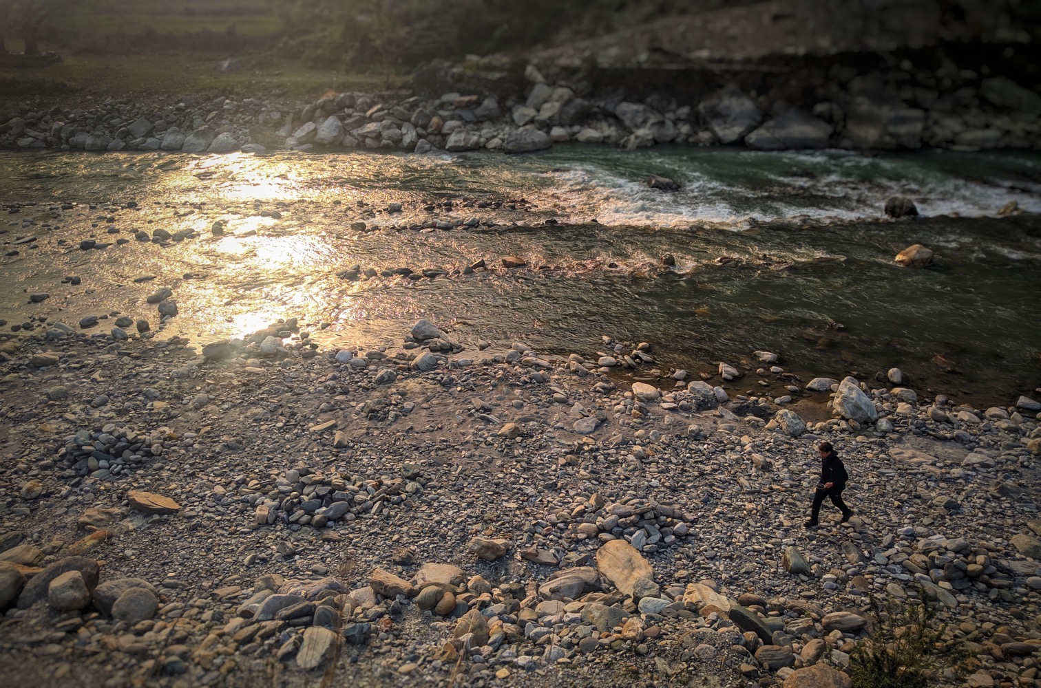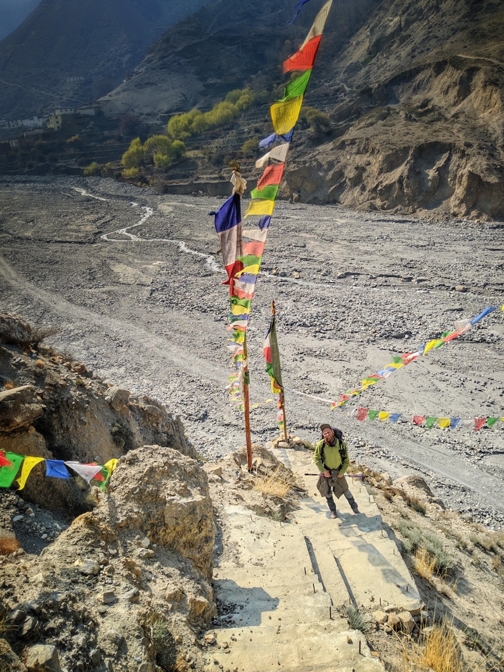 по реке в направлении Долпы. Пришлось бежать/догонять. Долго. Пару