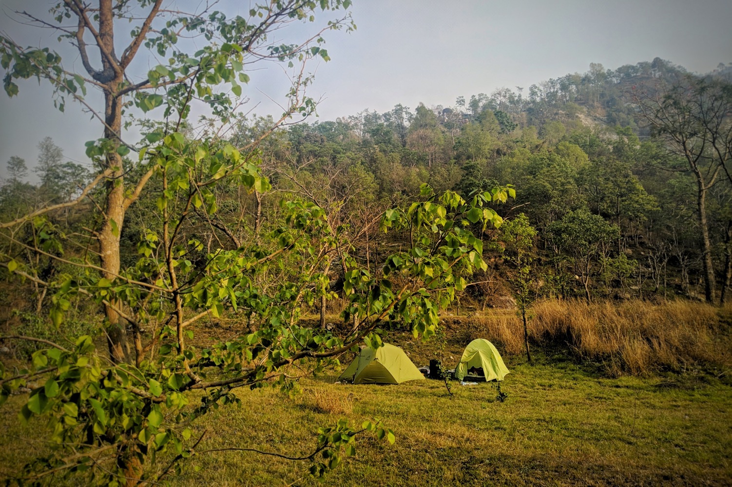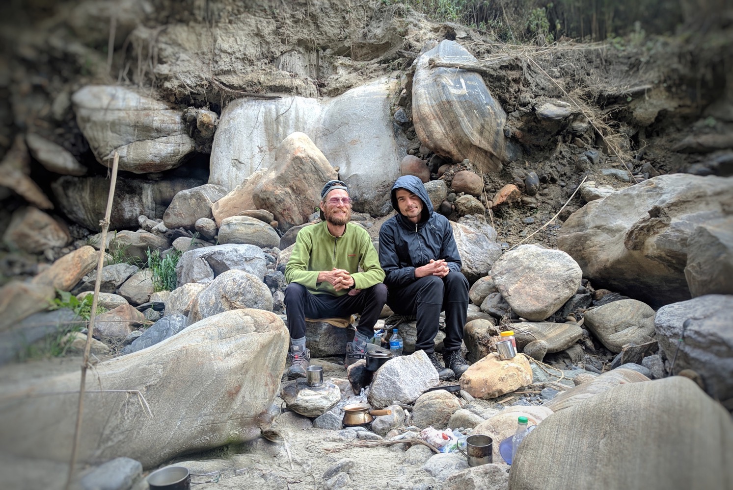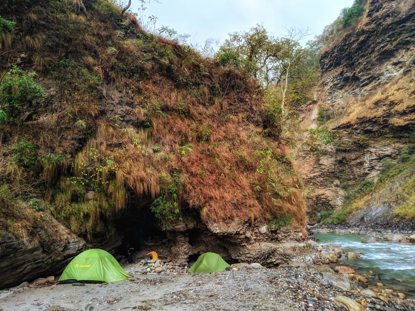 Начавший накрапывать дождик, загнал нас на ночь в грот на реке. Балбес решил, что лучше быть мокрым, но живым. Трус с Бывалым, понадеявшись на карму, поставили палатку внутри осыпающегося грота, решив, что сегодня не подходящий день, чтобы промокнуть (28.43997, 83.385072):