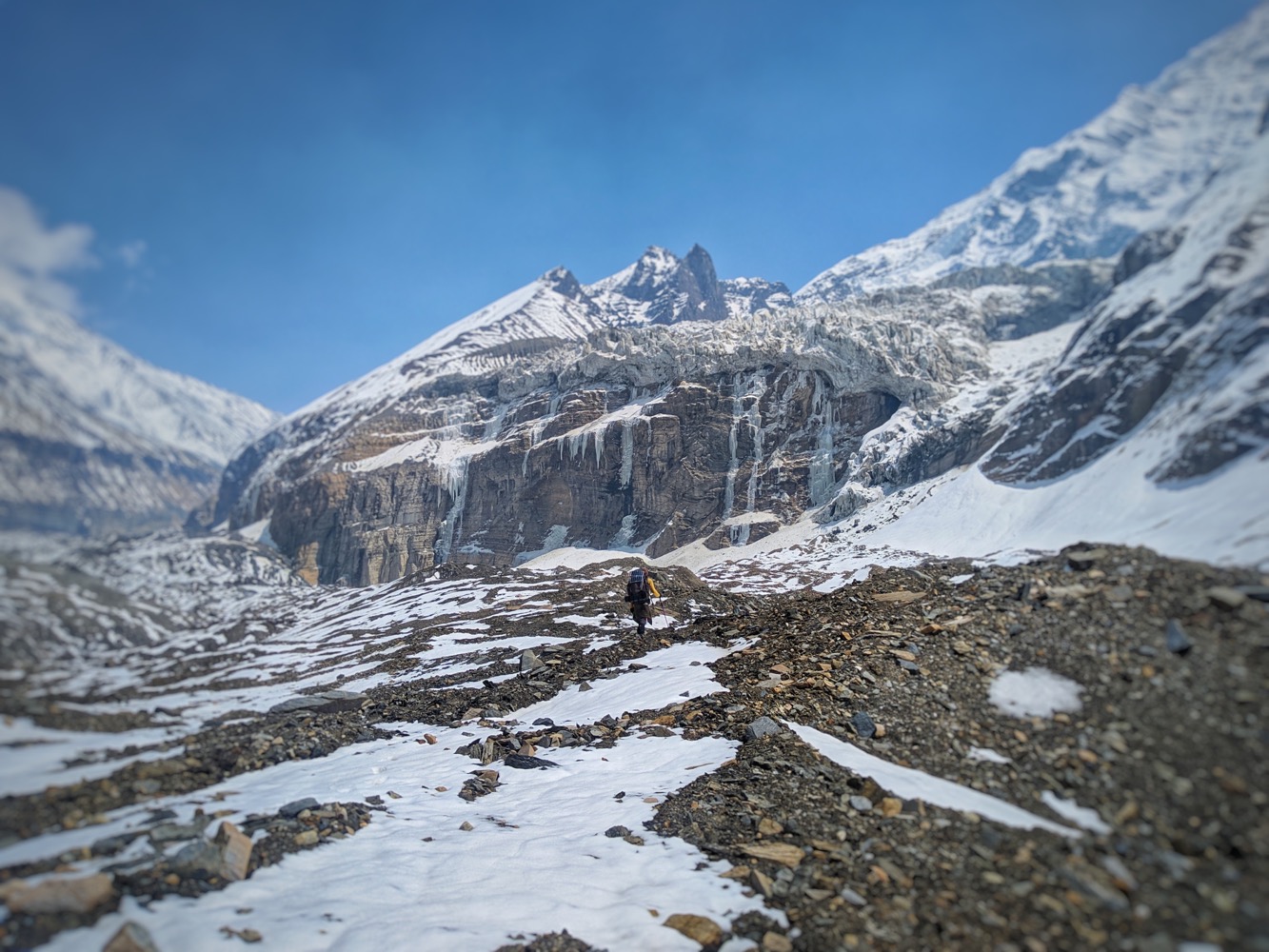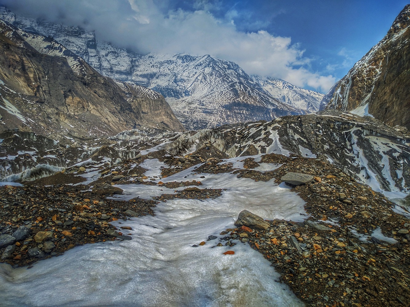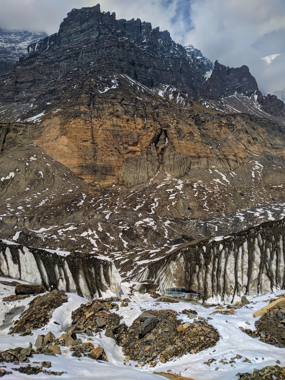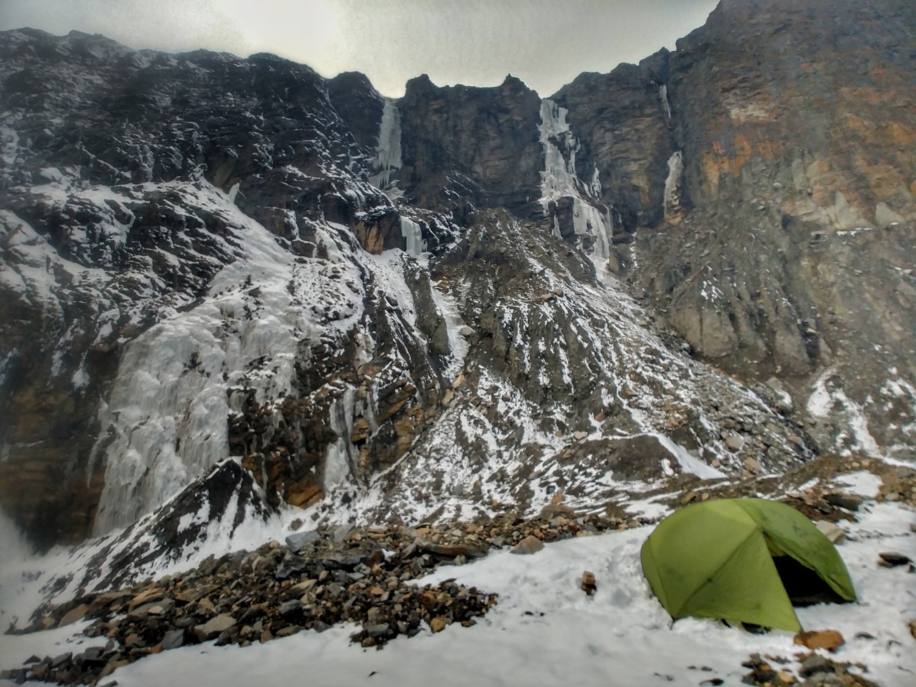 Дальше - куски камней и глыбы льда, падающие по разным сторонам. Не то чтобы их слишком много, но вероятность не увернуться - есть. Ледник. Переходим треть. Бывалого накрывает attitude sikness. Решаем отступить чутка назад, в то место, где можно поставить палатку, с минимальной вероятностью отгребсти камнем по голове.