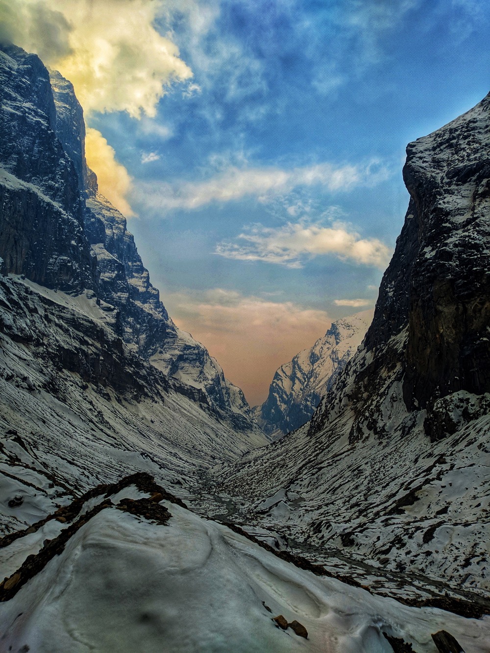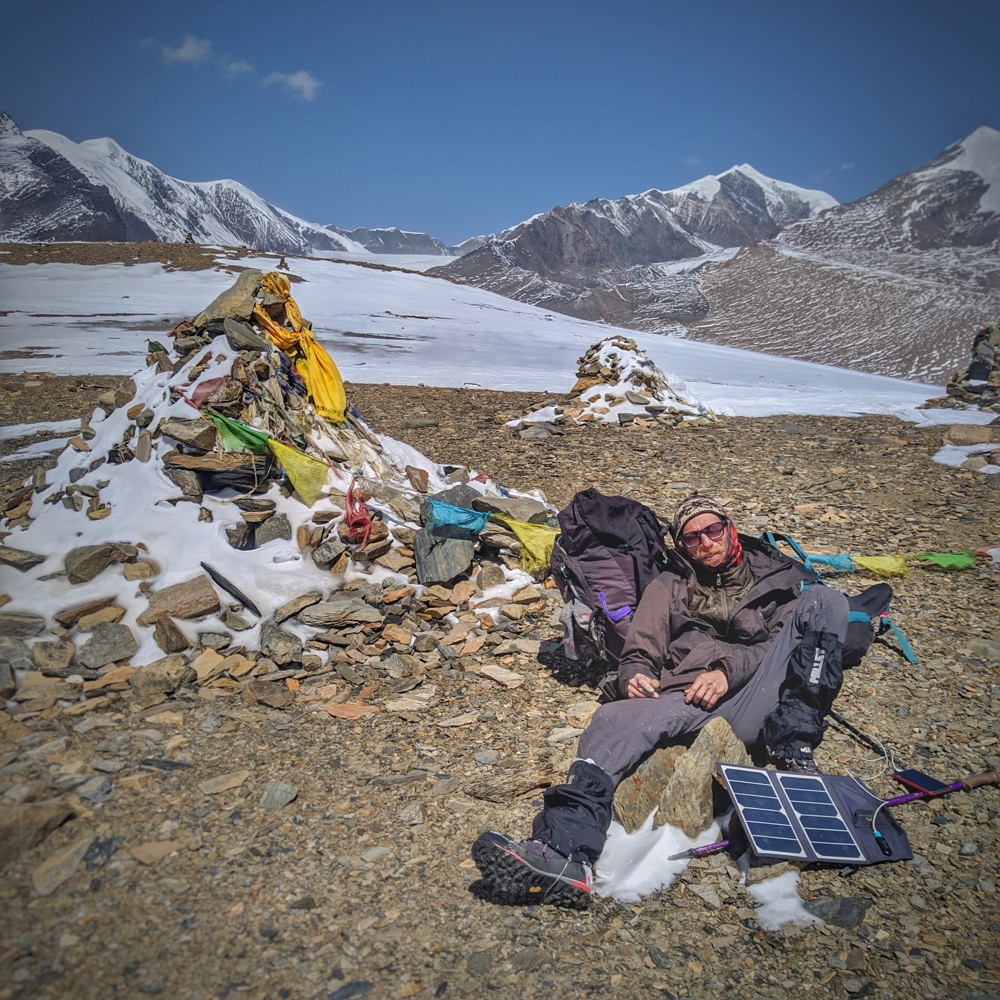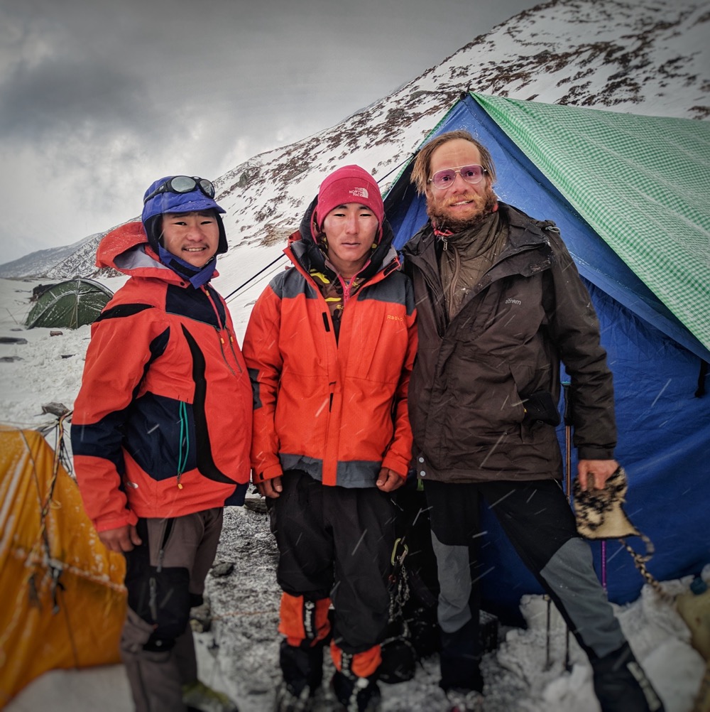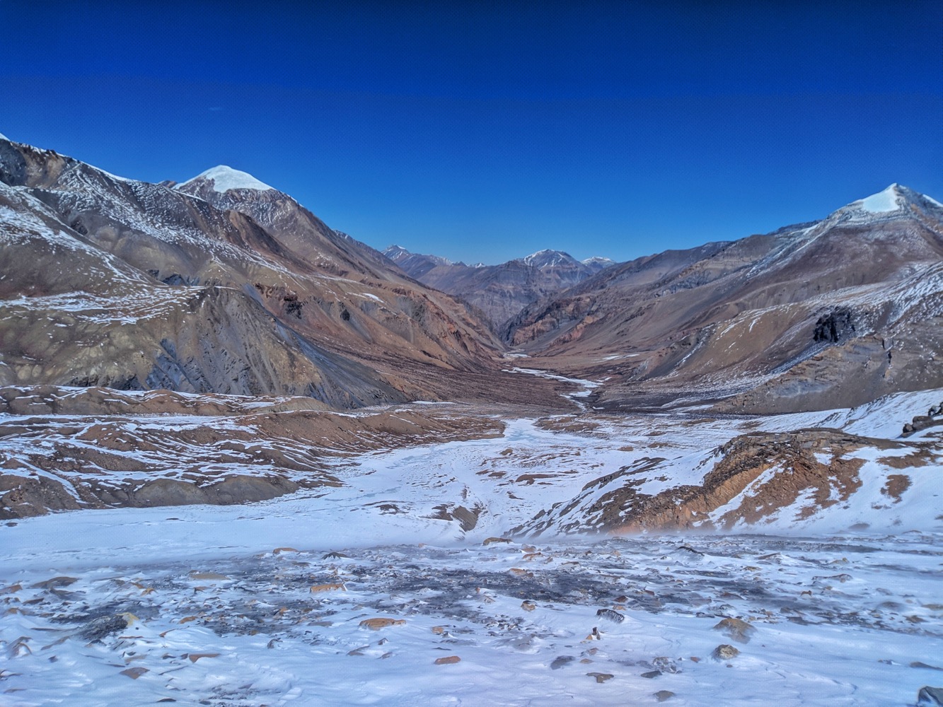 Спускаемся в Хидден-валлей, находим, на первый взгляд клёвое место для стоянки: река рядом, снега нет, ровно. И, даже есть камушки, которыми можно палатку закрепить. Начинаем её ставить и тут, откуда невозьмись прилетает порыв ветра, вырывает палатку из рук... и уносит вниз по реке в направлении Долпы. Пришлось бежать/догонять. Долго. Пару километров... Оказалось, что в конце-концов палатка намокла и застряла в камнях. Тент немного порвался, но дуги выдержали