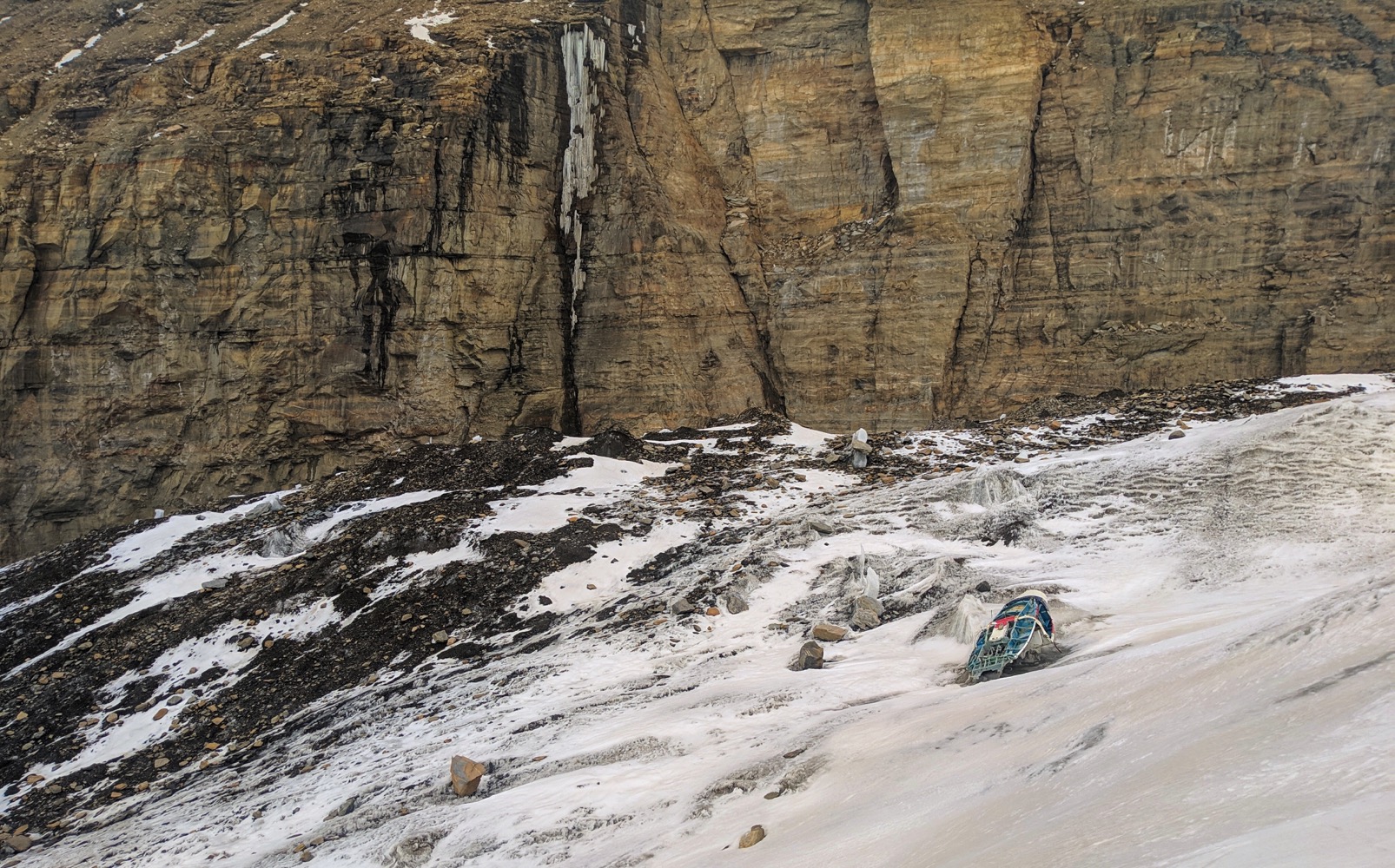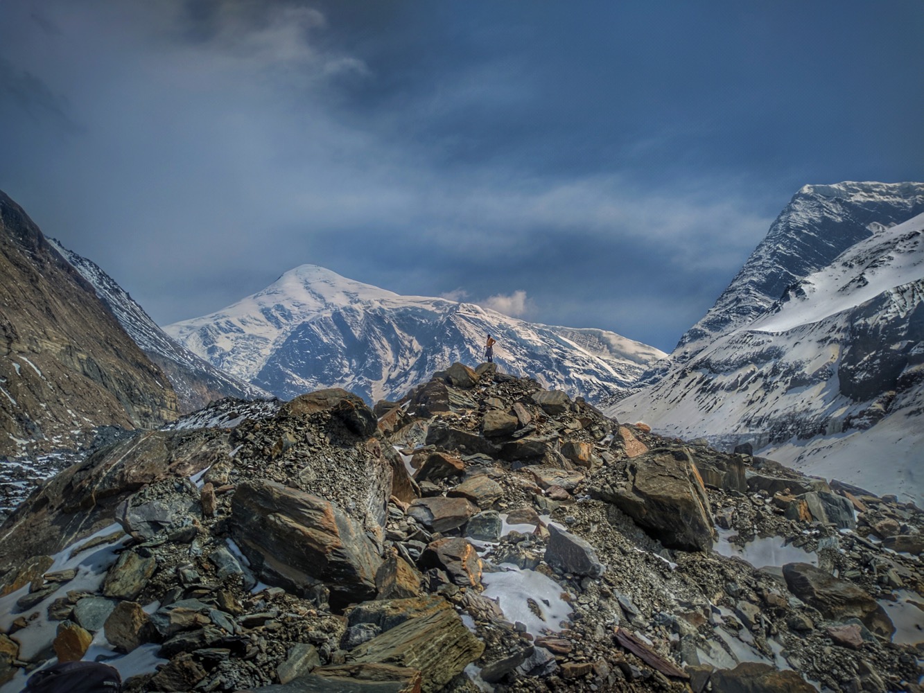 После обеда дошли до базового лагеря. Точнее до места, которое так обозначено на карте. Ну да, плоское. Ну, да, - есть ручейки под льдом - можно добыть воду. На том какие-либо признаки места под лагерь заканчиваются. Примерно за час до лагеря проходили остов разбитого вертолёта (28.748573, 83.484563).