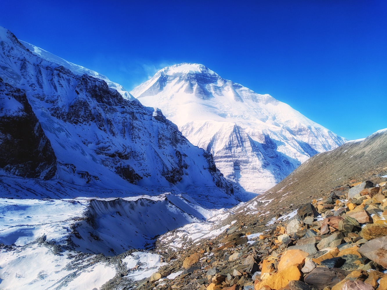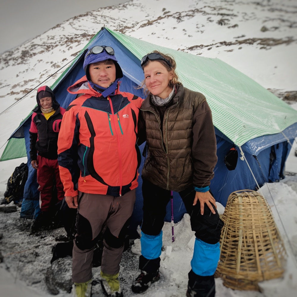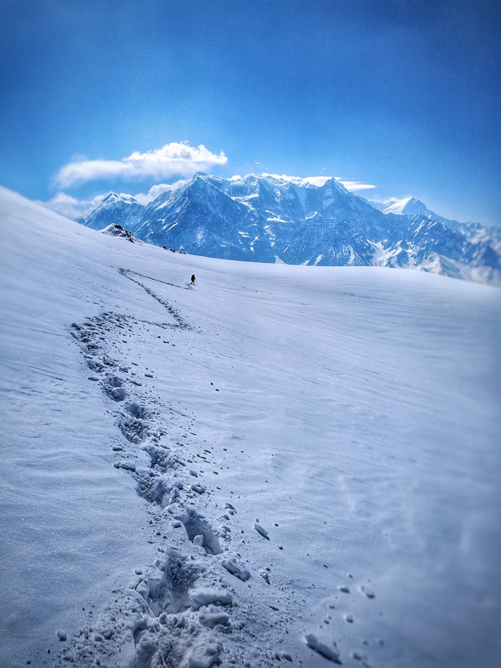 А потом, на полпути в АлуБари, мы встретили двух шерпов. Первые люди за неделю! Как раз именно в тот момент, когда погода снова попыталась испортиться, а дорога - потеряться. Шерпы оставляли вешки на своём пути - желтые флажки, и какое-то время мы шли по ним. А потом вторично: как только следы замело, а погода испортилась настолько, что от одного другого флажка перестало быть видно - шерпы появились вторично, уже сзади. У них, оказывается, был просто акклиматизационный выход. Они приехали взойти на Тукуче и вот, готовятся, ждут погоды.