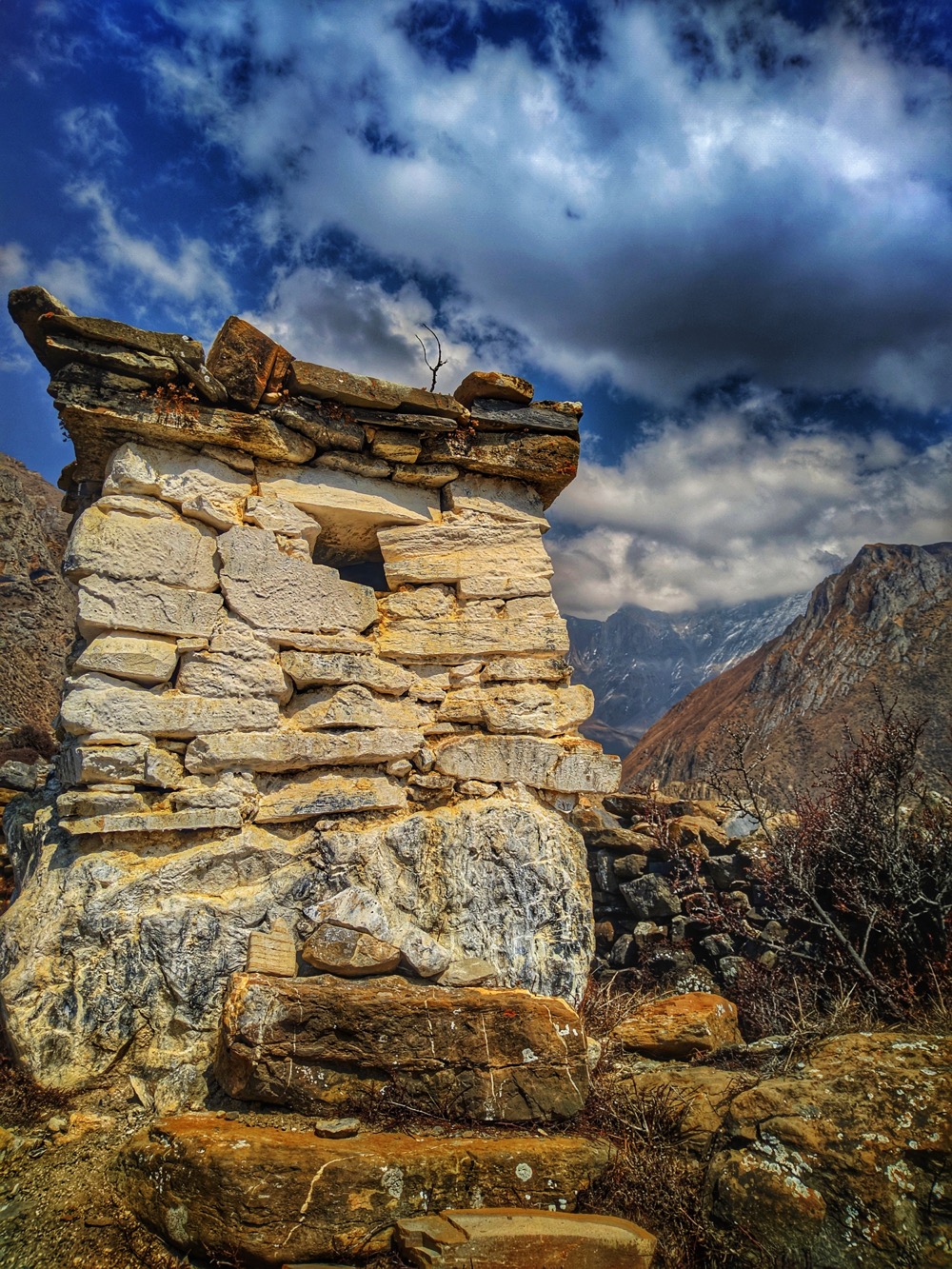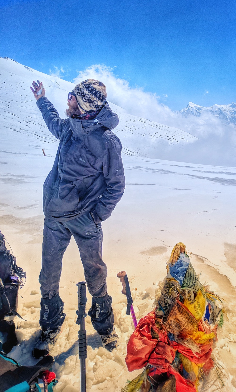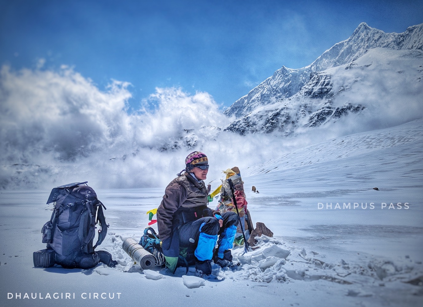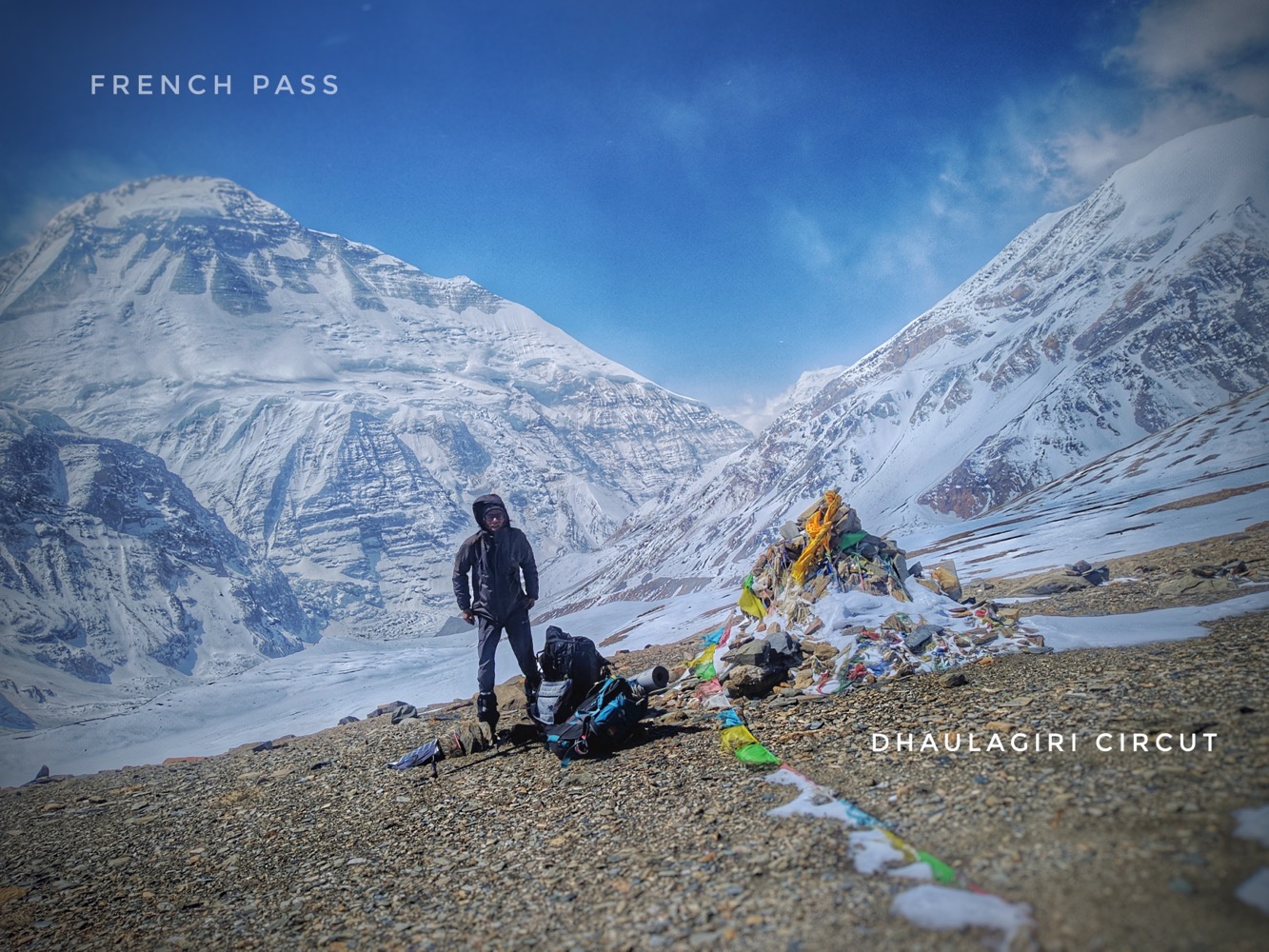 Находим и переходим перевал. Рядом с "дорожно-флаговыми" чортенами - пирамидки с мемориальными табличками тех, кто не вернулся с Даулагири
