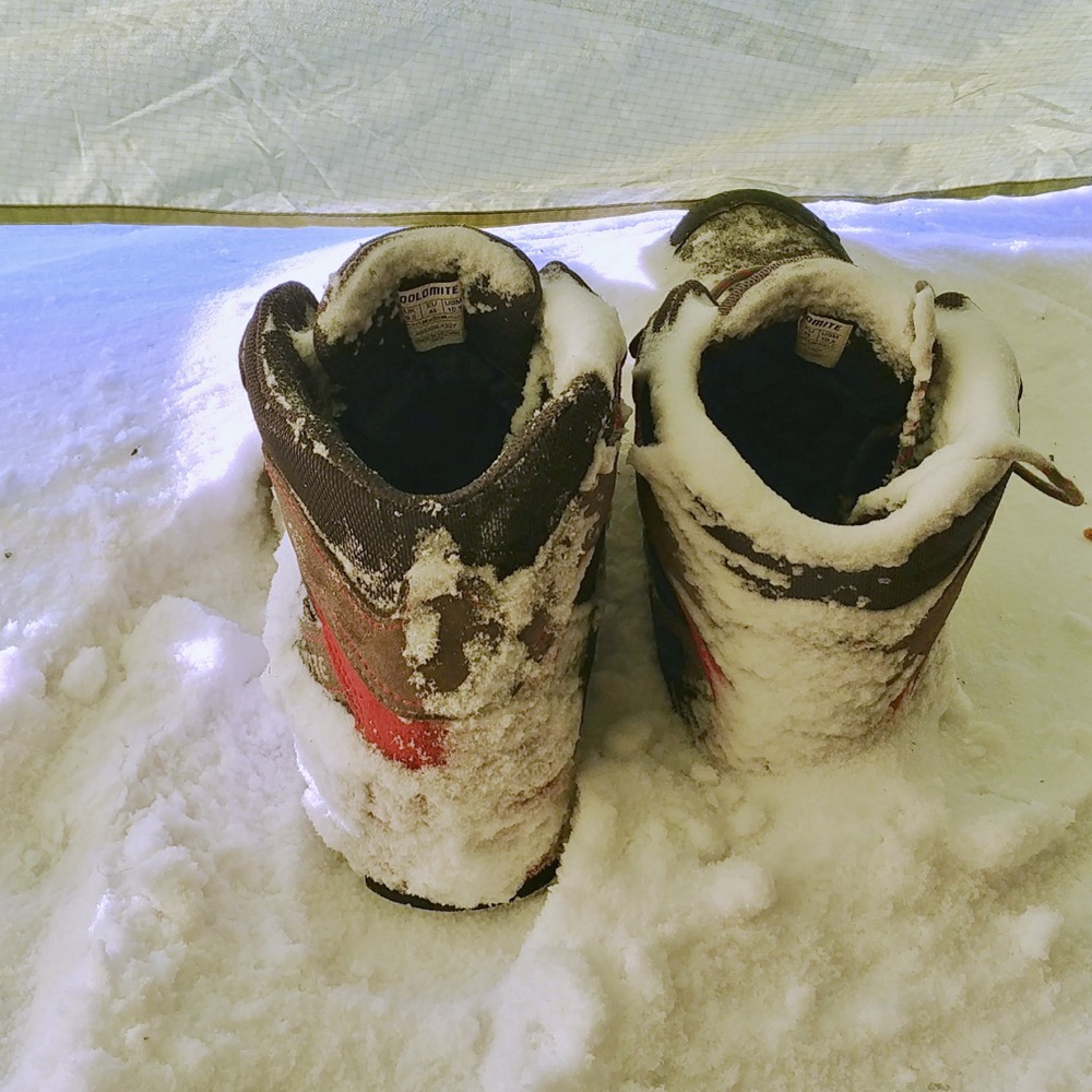 Ночью поднимается сильный ветер, палатку вместе с нами и рюкзаками несколько раз сдвигает на полметра. Закрепить её, ясен пень, нечем: теоретические камни лежат под метровым слоем снега.