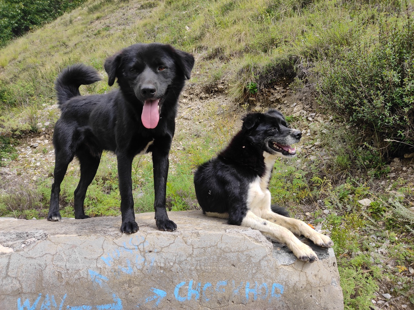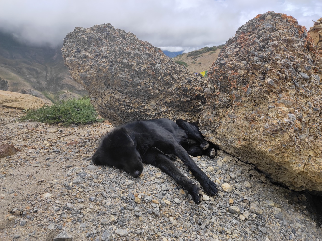 Обиженные пёси удрали дальше по тропе (там сука поймала и съела птицу), а мы пришли к решению разделиться: если бы на второй день моя спина накрылась окончательно, напарнице грозило переть назад оба рюкзака, салиграмы и меня. На обратном пути, занявшем те же шесть часов, делал привал на каждом плоском камне - спина раскалывалась и горела. Пришёл к выводу, что причина не столько в отвычке, сколько в жиденьком поясе предельно облегчённого "штурмового" рюкзака: затянешься до состояния бородатой осы, но через пару минут пояс ослабеет, и весь вес опять на плечах... "Домой" приполз на бровях, а через полчаса пришла напарница, возвращения которой я ожидал не ранее завтрашнего вечера - оказалось, на трудном осыпном склоне дожди смыли тропу, оградив залежи салиграмов от расхищения. Кстати, собачья пара радостно встретила кормилицу на перекрёстке, в начале спуска к селу Тетанг, и проводила на всём обратном пути - заслужив угощенье НЗ-шными орешками :)
