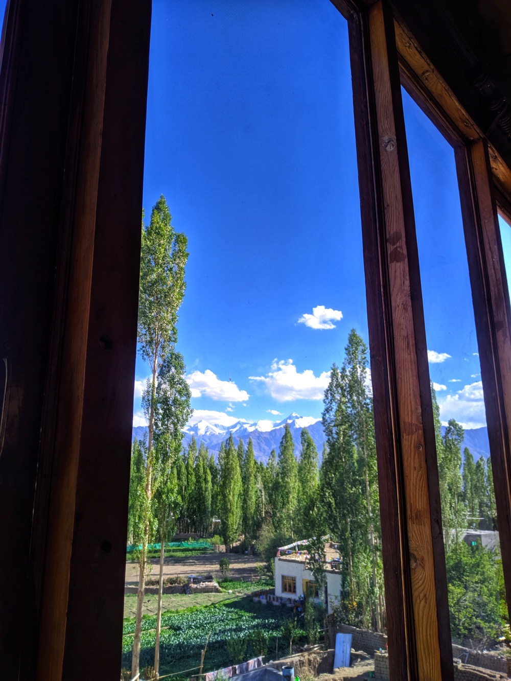 Ладакское жилье даже близко не похоже на все остальные индийские холупы, со щелями в пару пальцев. Все очень чисто, добротно, на полу везде ковролин (чтоб ножкам было теплее). Вид из окна нашей комнатки за 500 рупий на троих (это наверное самый нижный порог цены здесь):