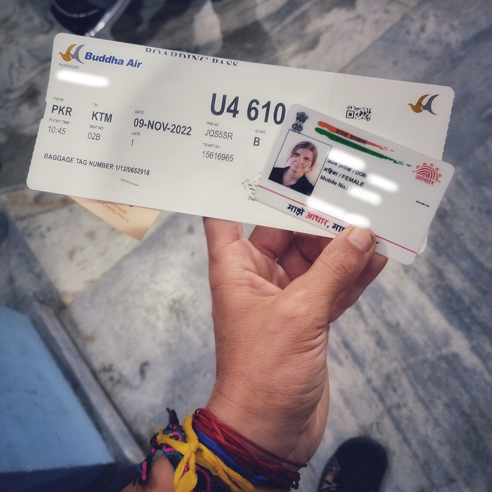 2022 Dec 01 See all postsХреновые дороги в Непале отчасти компенсируются тем, что много куда можно достаточно быстро долететь. Для непальцев и граждан SARS билет на большинство внутренних рейсов стоит около 35$, для остальных - 100$. Как бэ дорого, но окей, против 10 часов в автобусе по абсолютно убитой дороге - полчаса полета иногда того стоят. Aadhar - не является документом, подтверждающим гражданство, так что теоретически по нему лететь за 35$ нельзя. Практически - один раз у меня получилось (второй - нет):