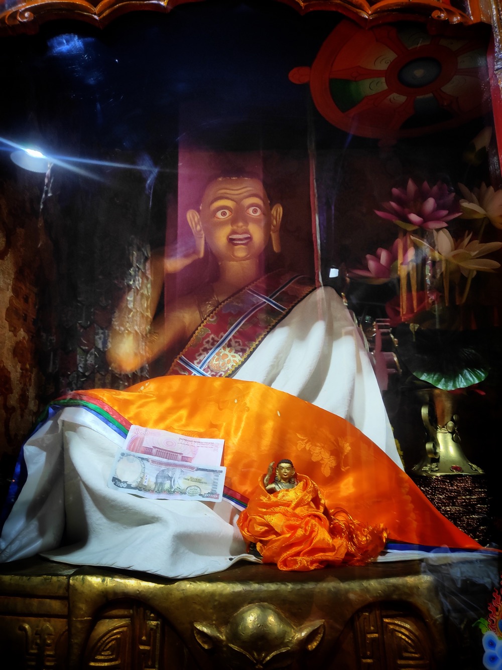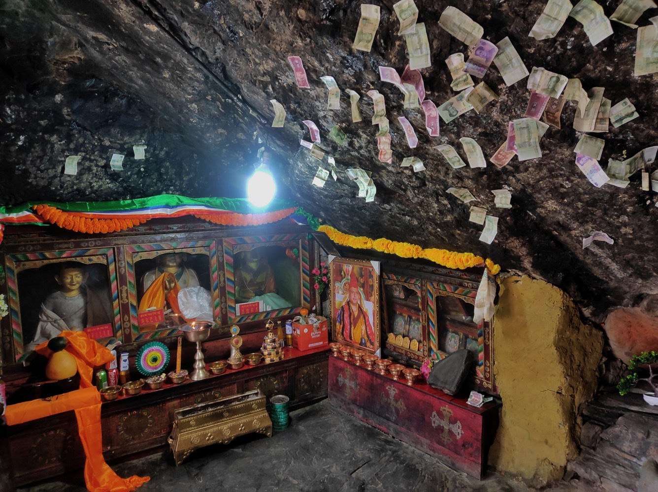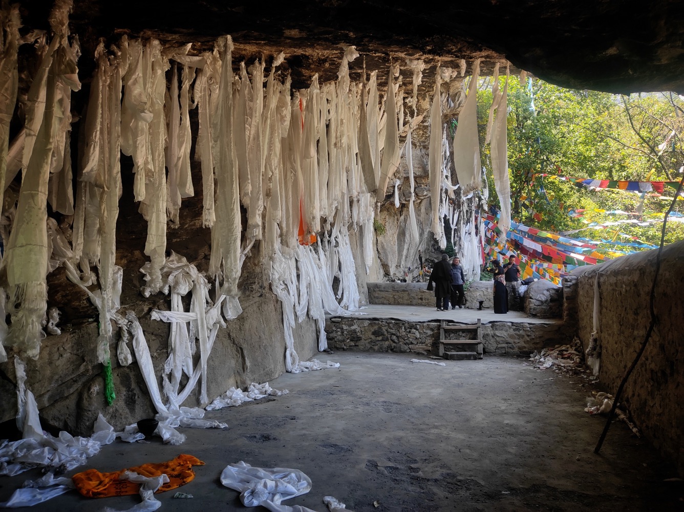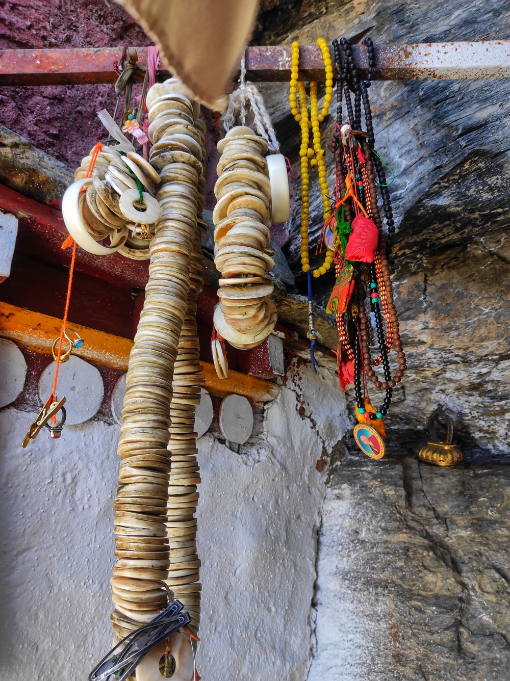 С подношением хадаков тут интересный квест. Берешь хадак (вот этот белый шарфик) заворачиваешь в него камешек и подкидываешь к потолку. Задача - чтоб хадак прилип, тогда магия подношения случилась. Если не прилип - движение повторять. На каком честном слове, магии или летуче-мышином говне он там держится - не ясно, но судя по фотке - успех постигает многих.