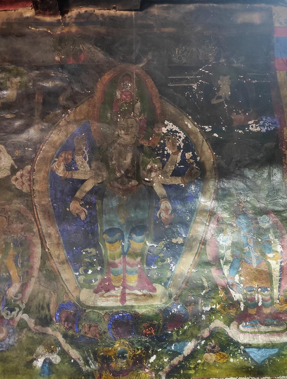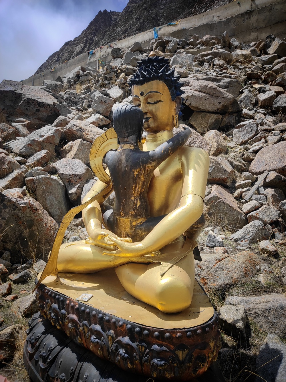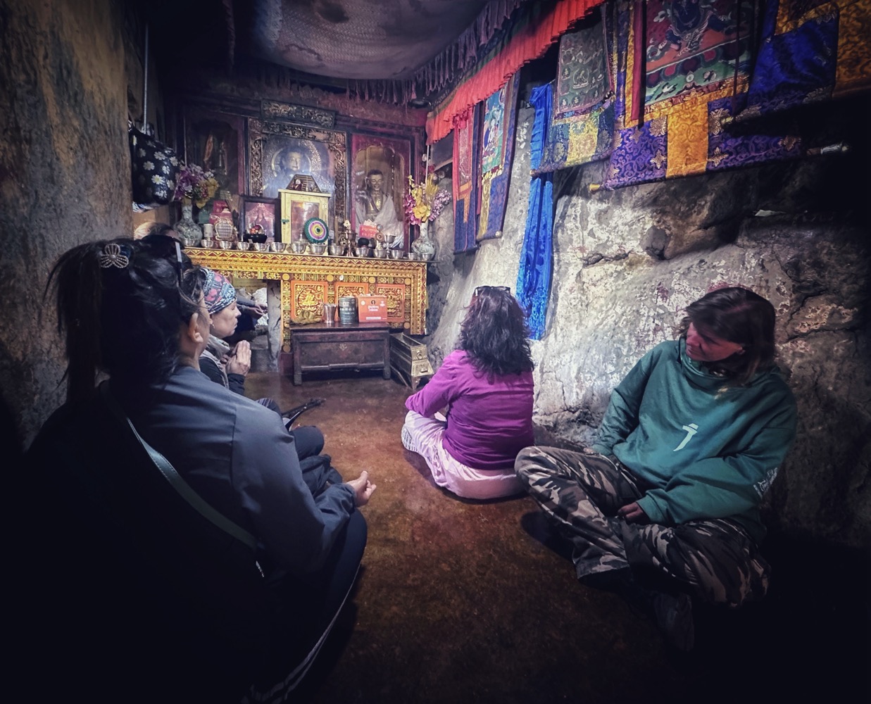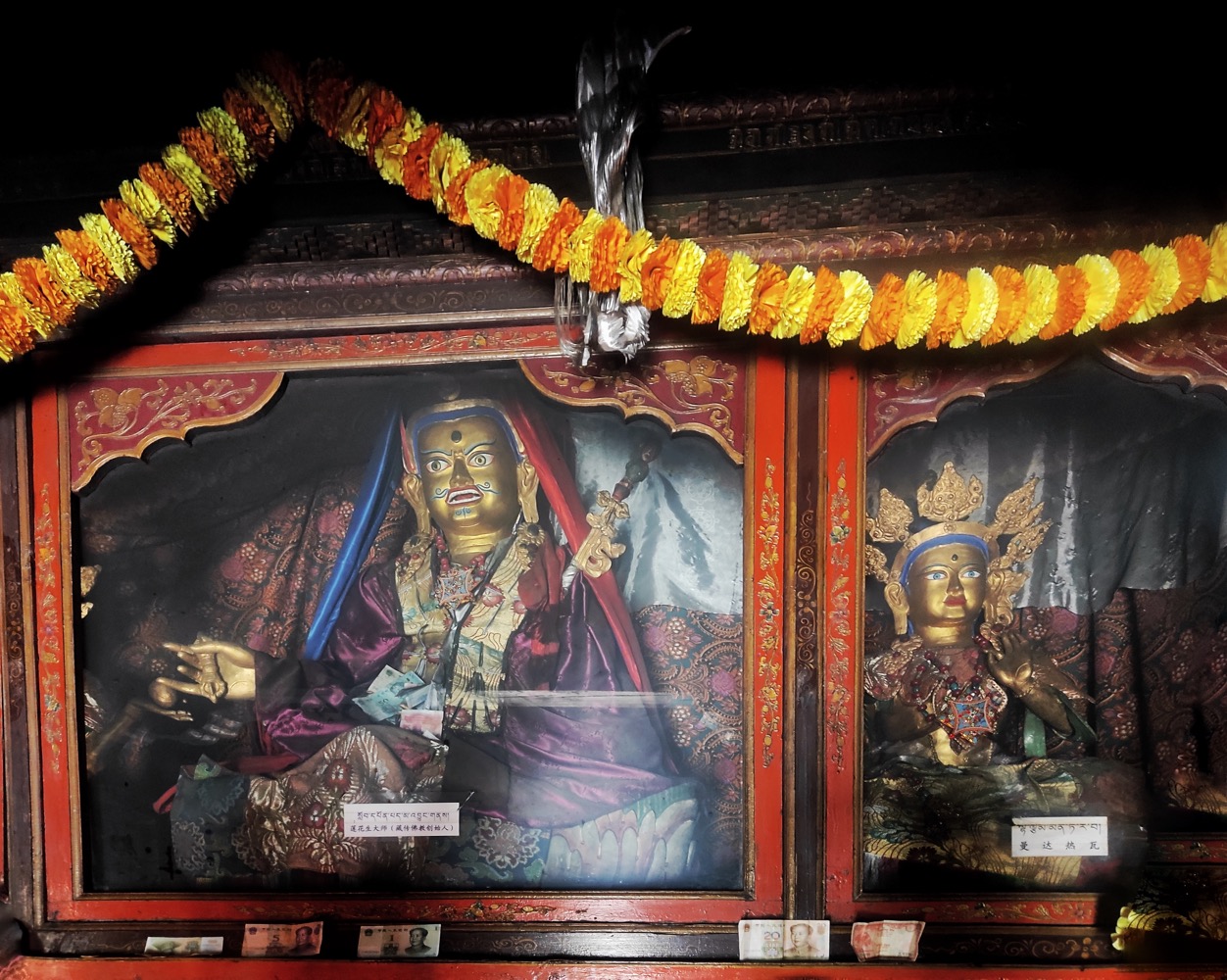 С подношением хадаков тут интересный квест. Берешь хадак (вот этот белый шарфик) заворачиваешь в него камешек и подкидываешь к потолку. Задача - чтоб хадак прилип, тогда магия подношения случилась. Если не прилип - движение повторять. На каком честном слове, магии или летуче-мышином говне он там держится - не ясно, но судя по фотке - успех постигает многих.