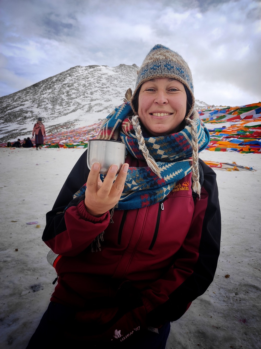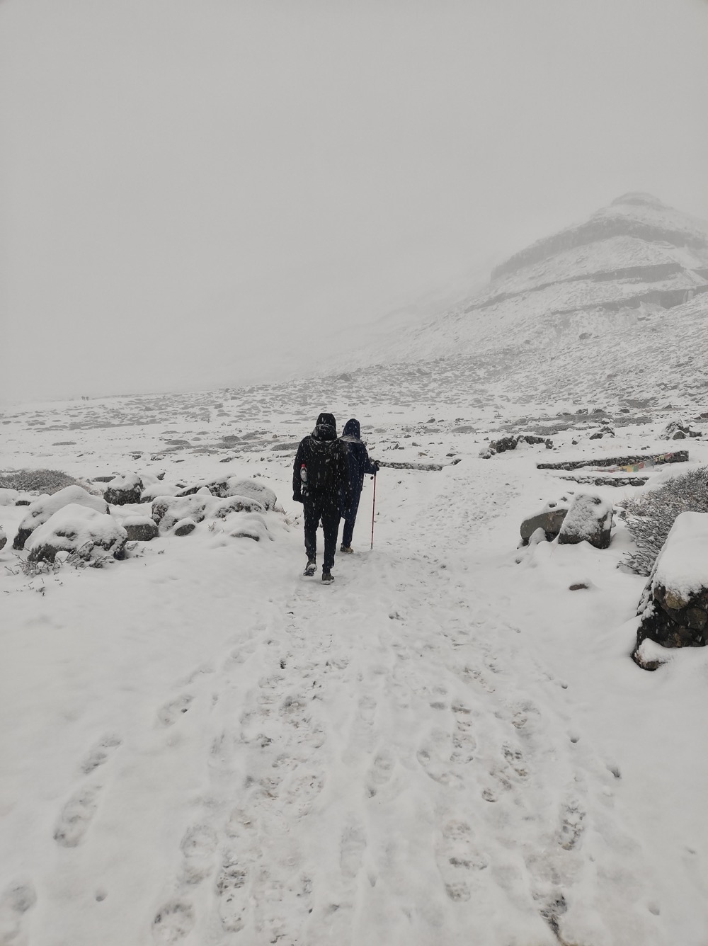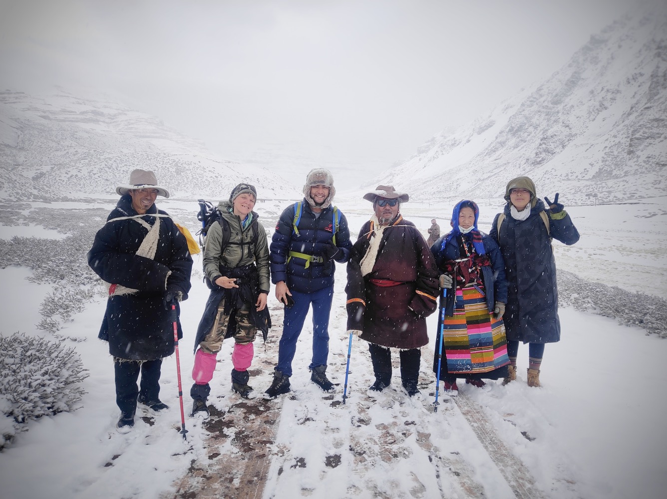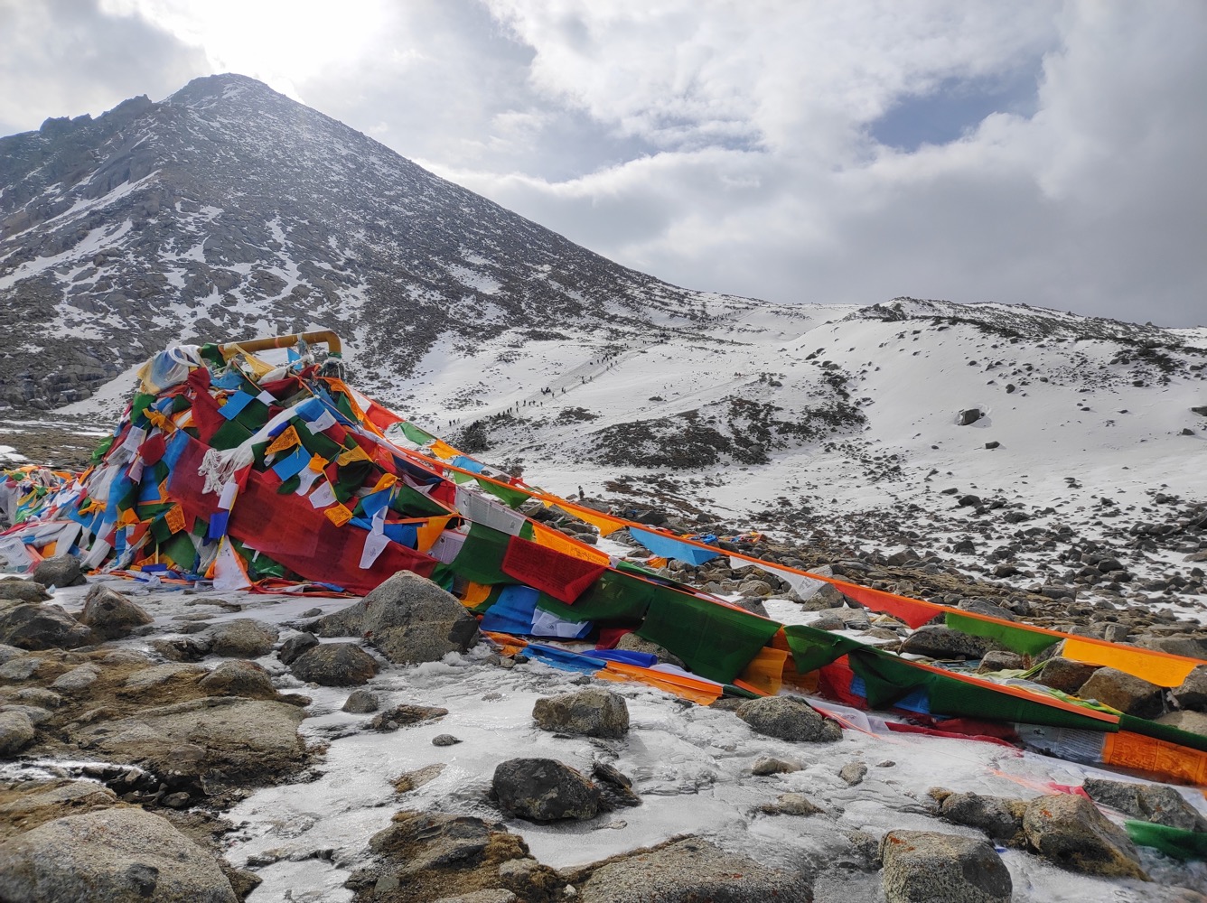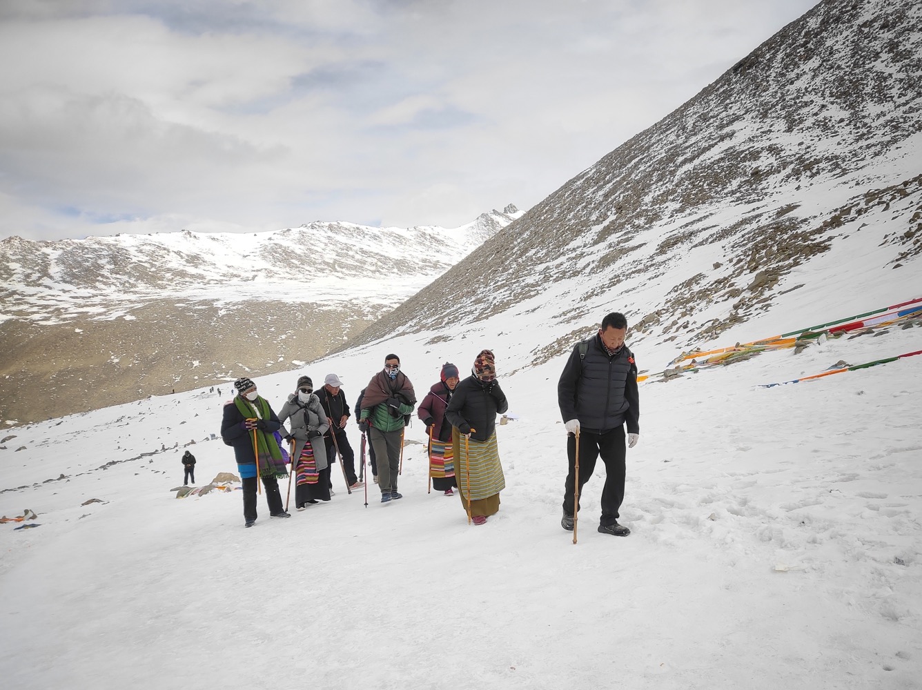 И в общем-то да, я взяла и не пожалела об этом ни разу. Мало того, с кошками, да с акклимухой из Дорпатана на точку встречи после ДролмаЛа я пришла на два часа раньше всех остальных, при том особо не торопять и покуривая при каждом удачном случае. А дело в том, что это было время СагаДавы - большого тибетского праздника. И тибетцев было не просто много, а очень много. И они укатали весь свежевыпавший снег на перевале практически в лед. Идти вне тропы без кошек было практически не возможно. А в толпе приходится держать общий темп и аккуратно обходить простирающихся бабушек. С кошками же можно вполне позволить себе спускатся просто по склону, особо тропы не придерживаяся.