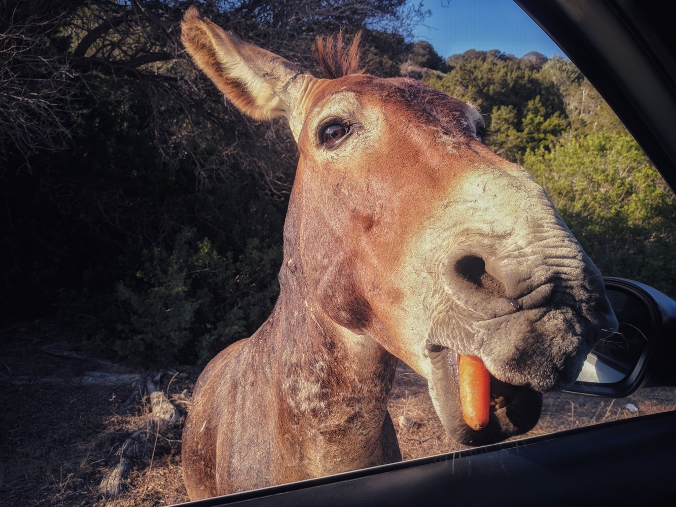 Сюда надо ехать с морковкой. Парой килограмм. Здесь дикие ослы, которые стоят посереди дороги. Ослиный гоп-стоп. Показываешь из окна морковку - он идет к окну - дорога свободна. Пока осел жует - можно проезжать: