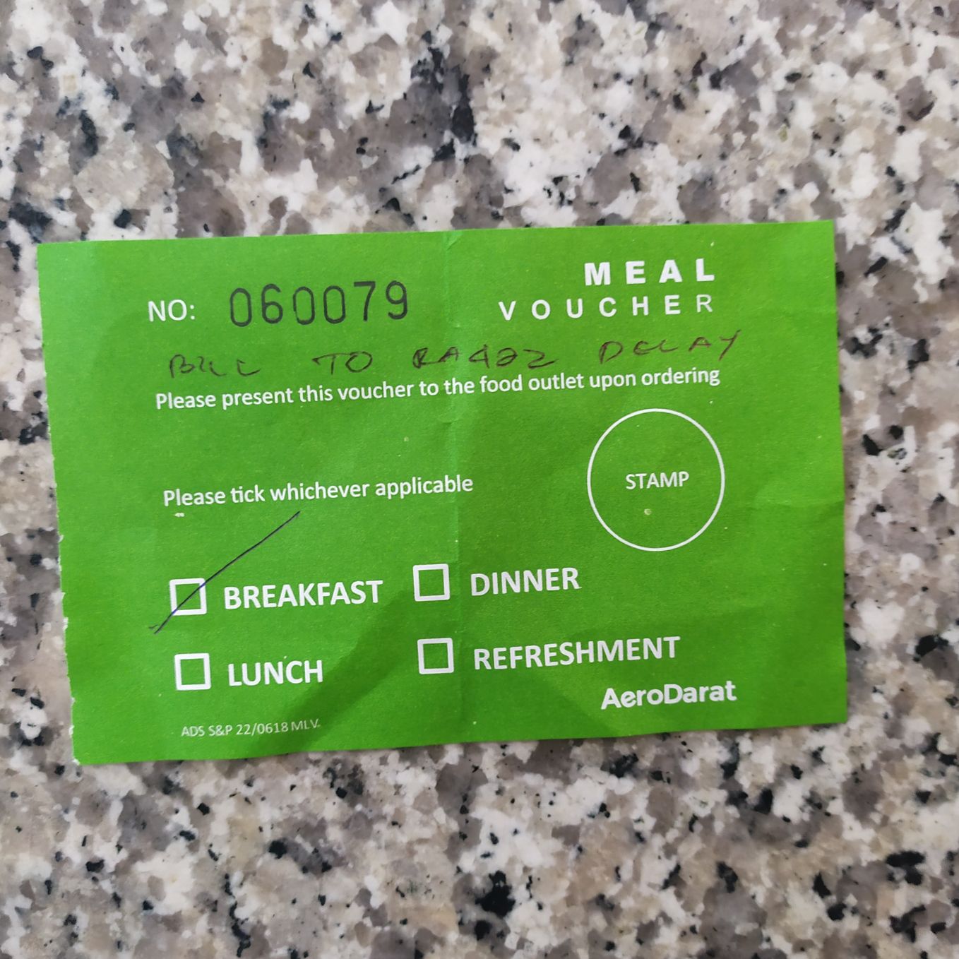 Думаем, ну сейчас, 20 минут, почистят салон и мы полетим, но регистраторша, голосом, начинающим садиться от бесконечных ответов на вопросы "когда?", сказала: "Tire problem", через 10-15 минут раздалим вам талоны на завтрак в БургерКинг.