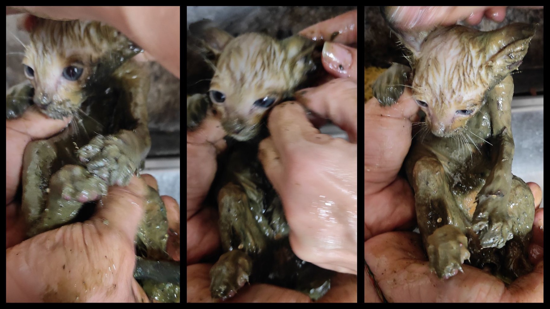 Подошли к краю, глянули тоже сверху: какой-то звереныш. Не совсем крыса, но по размерам что-то близкое. Мы с Лехой спустились посмотреть - котёнок. Тока непонятно что с ним - весь какой-то в липкой субстанции. Покрутили-повертели, вроде травм не видно с жизнью не совместимых, но двигаться животина не может, так как слиплось всё. Надо отмывать:
