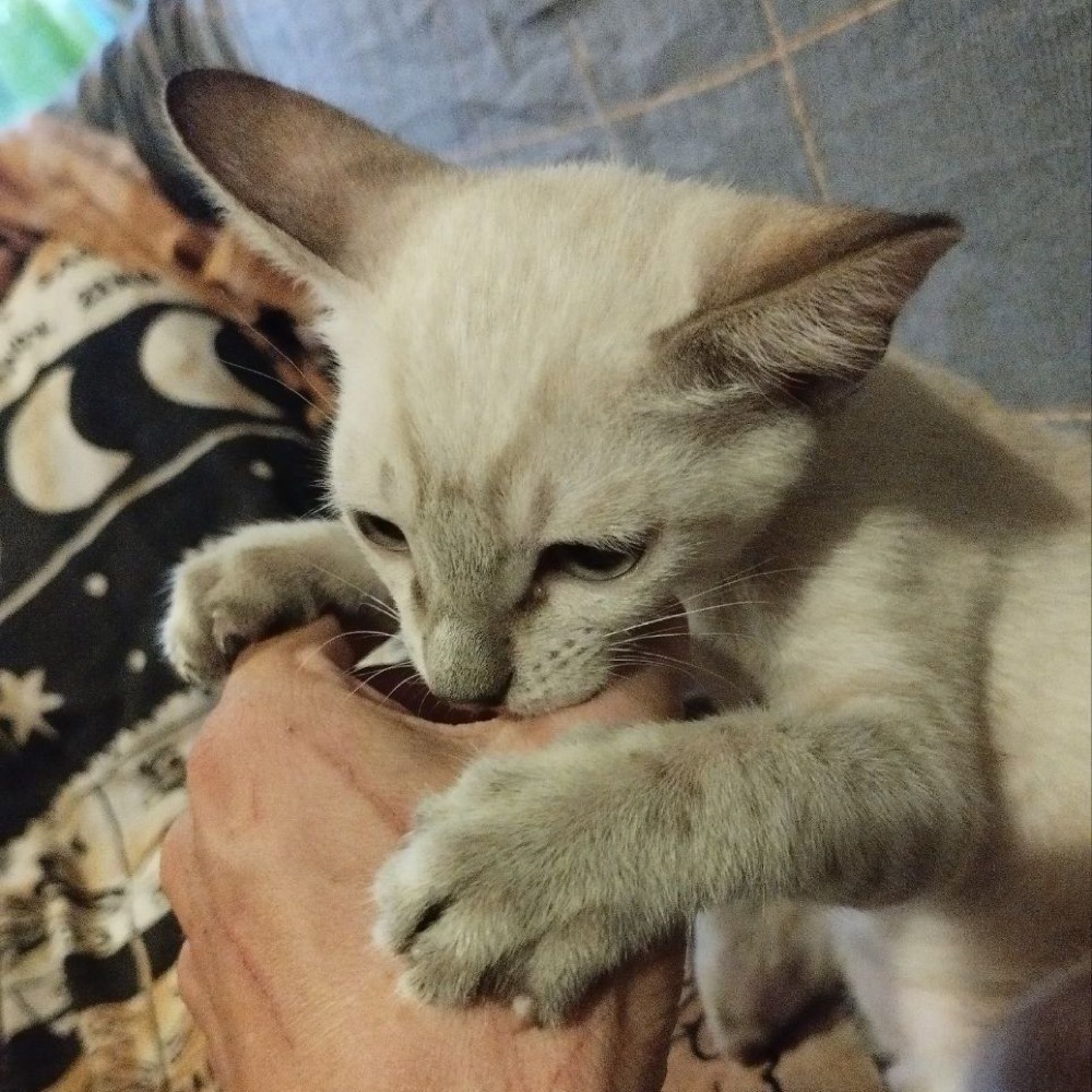 Котёнок оказался абсолютно здоров, жрал как не в себя, в лоток ходить научился моментально и первую неделю вел себя вообще супер-прилично. А потом в его развитии начался этап "играть и кусать". За что он по итогу поплатится однажды.