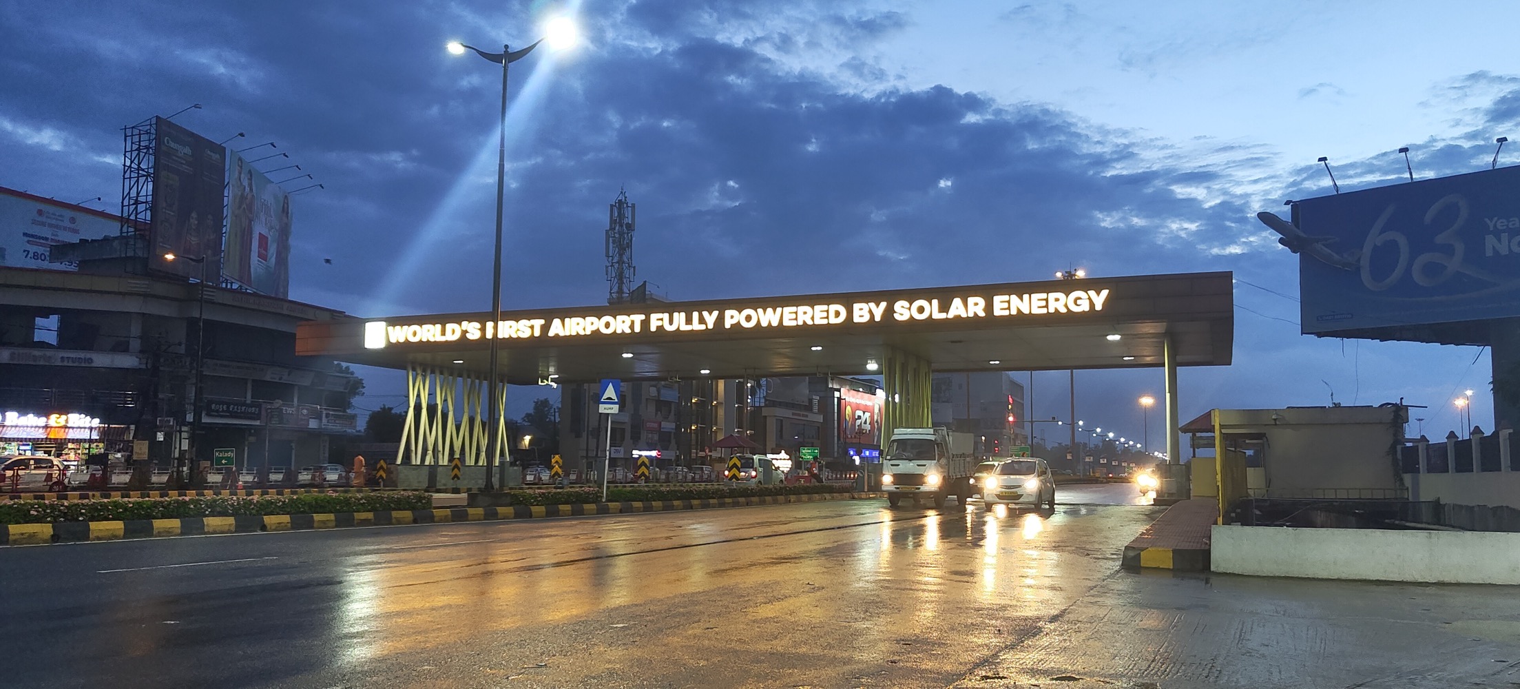 Аэропорт модный, гордится тем, что он первый работает полностью на солнечной энергии: