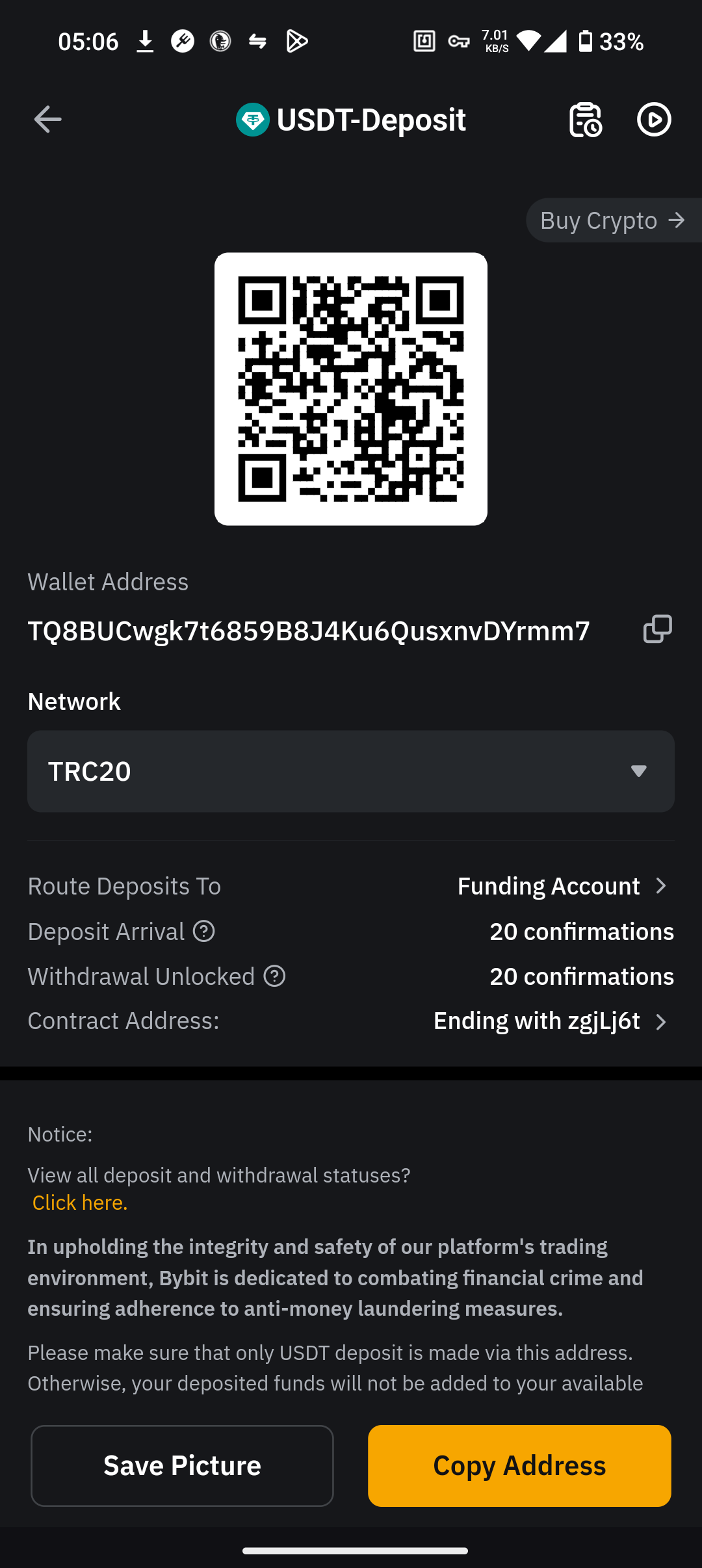 Тут нажимаем на "Deposit Cripto" -> "USDT" -> выбираем сеть в которой нам собираются отправить монеты и видим наш адрес и QR-код: