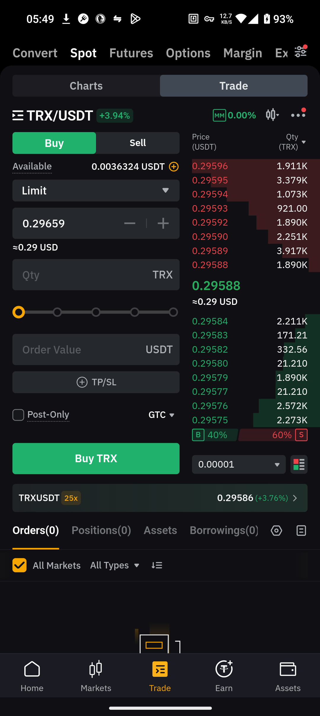 Выбираем нужную пару (TRX/USDT), там, где написано Limit ставим Market. Вводим количество USDT, которые хотим продать (или TRX, которые хотим купить). Жмем "Buy TRX". Ждем исполнения ордера, обычно мгновенно.
